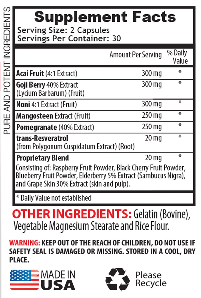 MEGA ANTIOXIDANT COMPLEX Pomegranate - Mangosteen - Goji Berry - Acai -Made in the United States- (2 Bottles, 120 Capsules) What are Antioxidants? Antioxidants are chemicals that fight a process in your cells called oxidation. The main source is plant-based foods, but your body makes some, too. You're probably familiar with vitamins C and E, beta-carotene, and the minerals selenium and manganese. Plant nutrients and chemicals like flavonoids, phenols, polyphenols, and phytoestrogens are also antioxidants. What do they do? Each one works differently. Together they form a team that fights free radicals. These chemicals cause the oxidation process that damages your cells and the genetic material inside them. Your body makes free radicals as it processes food, sunlight, and toxins like smoke, pollution, and alcohol. Antioxidants either stop free radicals before they form or break them down so they're harmless. What is Resveratrol and it's Benefits? Resveratrol is a polyphenic bioflavonoid antioxidant that's produced by certain plants and found in foods and drinks that are known to halt the effects of aging. Plants that produce resveratrol and other types of antioxidants actually do so partly as a protective mechanism and response to stressors within their environments, including radiation, the presence of insects or other predators, injury, and fungal infections. Today, resveratrol is believed to be one of the most potent polyphenols and strongest protectors against symptoms associated with aging and free radical damage. Benefits of Goji Berries. Goji berries are believed to protect against age-related eye diseases. Goji berries can help vision because they contain high levels of healthy antioxidants, especially zeaxanthin. The same antioxidants can also stop damage from: UV Light Free Radicals Oxidative Stress One study reported in the American Academy of Optometry's journal Optometry and Vision Science found that seniors who drank goji berry juice for 90 days increased zeaxanthin and other antioxidant levels significantly. Goji berries also contain large amounts of vitamins A and C, similarly to other berries, including blueberries and raspberries. Vitamins A and C are vital for building immunity and preventing illnesses. Supplement Facts: Serving Size: 2 Capsules Servings per Container: 30 Acai Fruit (4:1 Extract) - 300mg Goji Berry (40% Extract)(fruit) - 300mg Noni (4:1 Extract)(fruit) - 300mg Mangosteen Extract (fruit) - 250mg Pomegranate (40% Extract) - 250mg Trans-Resveratrol - 20mg Proprietary Blend - 20mg Consisting of: Raspberry fruit powder, Black Cherry fruit powder, Blueberry fruit powder, Elderberry 5% Extract, and Grape Skin 30% Extract. OTHER INGREDIENTS: Gelatin(Bovine), Vegetable Magnesium Stearate, and Rice Flour KEEP OUT OF REACH OF CHILDREN. DO NOT USE IF SAFETY SEAL IS DAMAGED OR MISSING. STORE IN A COOL, DRY PLACE. *These statements have not been evaluated by the FDA. This product is not intended to diagnose, cure, treat, or prevent any disease. GREAT QUALITY SUPPLEMENT