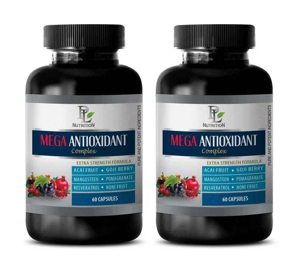 MEGA ANTIOXIDANT COMPLEX with: Acai Berry , Goji Berry , Resveratrol , Mangosteen , Pomegranate , and Noni . Dietary Supplement 2 Bottles 120 Capsules Made in the United States What are Antioxidants? Antioxidants are chemicals that fight a process in your cells called oxidation. The main sources of antioxidants are plant-based foods, but your body makes some, too. You're probably familiar with vitamins C and E, beta-carotene, and the minerals selenium and manganese. Plant nutrients and chemicals like flavonoids, phenols, polyphenols, and phytoestrogens are also antioxidants. Each one works differently. Together they form a team that fights free radicals. These chemicals cause the oxidation process that damages your cells and the genetic material inside them. Your body makes free radicals as it processes food, sunlight, and toxins like smoke, pollution, and alcohol. Antioxidants either stop free radicals before they form or break them down so they're harmless. What is Resveratrol and it's Benefits? Resveratrol is a plant compound that acts like an antioxidant. The top food sources include red wine, grapes, some berries and peanuts. This compound tends to be concentrated mostly in the skins and seeds of grapes and berries. These parts of the grape are included in the fermentation of red wine, hence its particularly high concentration of resveratrol. Resveratrol supplements have been linked to many exciting health benefits, including protecting brain function and lowering blood pressure. Benefits of Goji Berries. Goji berries have a high oxygen radical absorbance capacity (ORAC) score of 3,290. This rating indicates the quantity of antioxidants in certain foods. One study in healthy elderly men and women found that taking a milk-based goji berry drink daily for 90 days increased levels of the antioxidant zeaxanthin by 26 percent and increased overall antioxidant capacity by 57 percent. This is good news, since antioxidants consumed through the diet are thought to be important for health and protection against chronic diseases. Benefits of Acai Berries. Acai berries are a Brazilian "superfruit." They're native to the Amazon region where they're a staple food. However, they've recently gained popularity globally and are praised for being particularly beneficial to health and well-being. Acai berries have an incredibly high amount of antioxidants, edging out other antioxidant-rich fruits like blueberries and cranberries. In the case of acai, 100 grams of frozen pulp has an ORAC of 15,405, whereas the same amount of blueberries has a score of 4,669. This antioxidant activity comes from a number of plant compounds in acai, including anthocyanins. In 2008, researchers gave 12 fasting volunteers acai pulp, acai juice, applesauce or a drink with no antioxidants at four different times and then tested their blood for antioxidants. Both the acai pulp and applesauce raised participants' antioxidant levels, which means that the antioxidant compounds in acai are well-absorbed in the gut. Supplement Facts Serving Size: 2 Capsules Servings per Container: 30 Acai Fruit (4:1 Extract) - 300mg Goji Berry 40% Extract (fruit) - 300mg Noni 4:1 Extract (fruit) - 300mg Mangosteen Extract (fruit) - 250mg Pomegranate (40% Extract) - 250mg Trans-Resveratrol - 20mg (from Polygonum Cuspidatum Extract)(root) Proprietary Blend - 20mg Consisting of: Raspberry Fruit Powder, Black Cherry Fruit Powder, Blueberry Fruit Powder, Elderberry 5% Extract(Sambucus Nigra), and Grape SKin 30% Extract(skin and pulp). OTHER INGREDIENTS: Gelatin(Bovine), Vegetable Magnesium Stearate, and Rice Flour. WARNING: KEEP OUT OF REACH OF CHILDREN. DO NOT USE IF SAFETY SEAL IS DAMAGED OR MISSING. STORE IN A COOL, DRY PLACE. *These statements have not been evaluated by the FDA. This product is not intended to diagnose, cure, treat, or prevent any disease. GREAT QUALITY SUPPLEMENTS