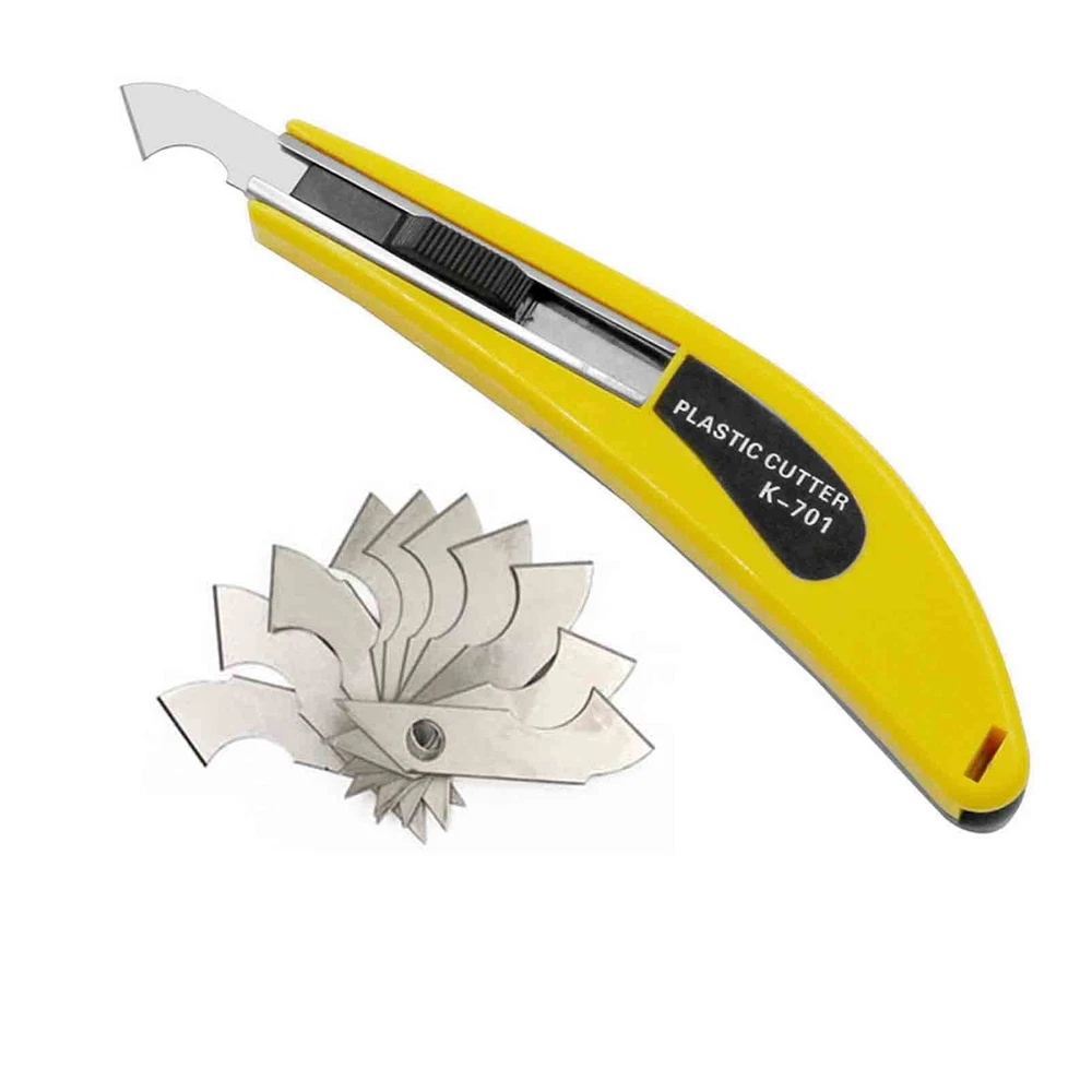 Acrylic Plexiglass Sheet Cutter Hook Knife Tool,With a Curved Handle,it Is More Convenient To Use.One handle,11 blades. It can be used to split 0.4 inch thick acrylic sheet, but it is better to use mechanical cutting for acrylic sheet more than 0.4 inch thick. Cutting acrylic board is difficult, before you start cutting, please read the description carefully or Instructional video. When cutting, you can press the ruler with your left hand to prevent the ruler from moving, but the strength of the hand is limited, so generally professionals will step on the ruler with their feet when cutting acrylic. If possible, it is recommended that you put your foot on the ruler before cutting. This acrylic hook knife tool is specially used to cut acrylic sheets or other plastic sheets.Acrylic sheets or other plastic sheets are hard and brittle, so it is difficult to divide. This hook knife can help you carve a thin groove on the acrylic sheet, and then you can break the acrylic sheet along the groove. 1.Please mark the board with a pen,then use a ruler to place it according to the mark.2.Use the hook knife to draw a groove on the acrylic plate along the ruler,and the ruler must be pressed with your left hand. Hold the hook knife with right hand and repeat the operation to make the groove deep enough. 1.There is a ridge-like protrusion on the back of the hook knife. Place the hook knife under the acrylic board, align the protrusion of the hook knife with the groove just hooked out,and press down on both sides of the groove with both hands,Let a small part of the acrylic board split along the groove.2.Completely break the acrylic board along the groove. When using the hook knife,pay attention to protect the tip of the knife and do not touch the ground. If the tip of the knife is not sharp, you can change the blade.Contains a hook knife with 1 blades and a box of blades. There are 11 blades in total. Contains a hook knife with 1 blades and a box of blades. There are 11 blades in total.