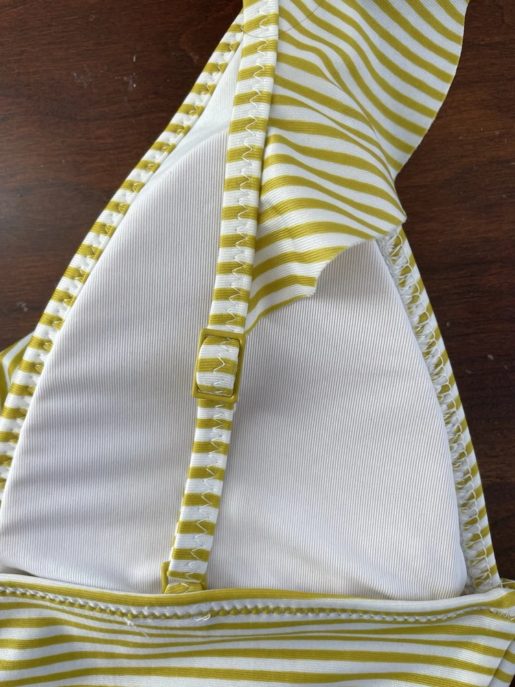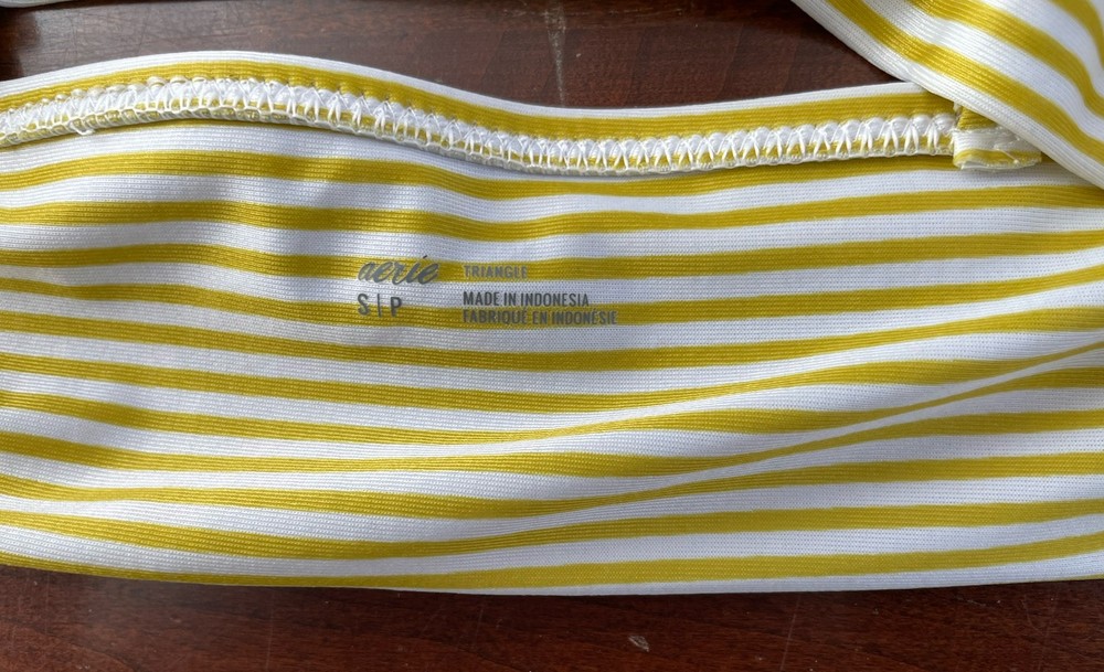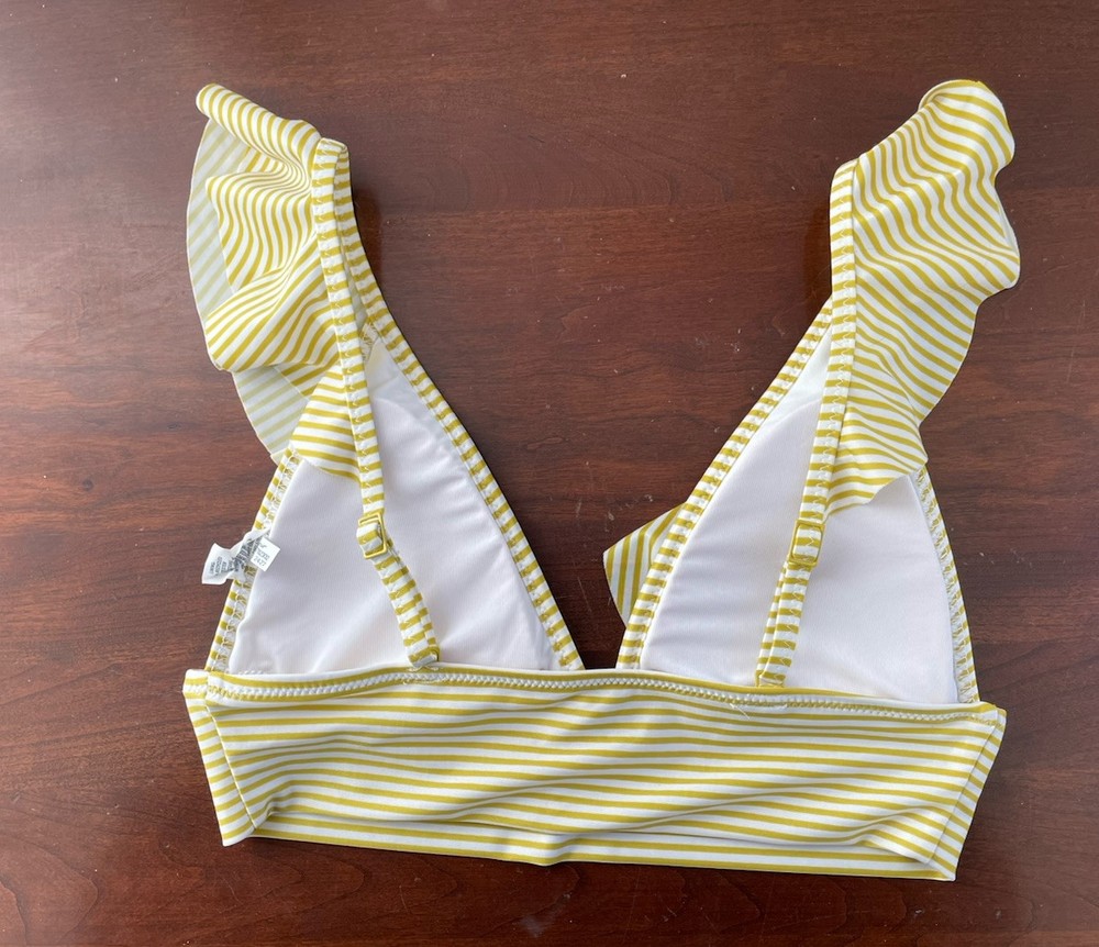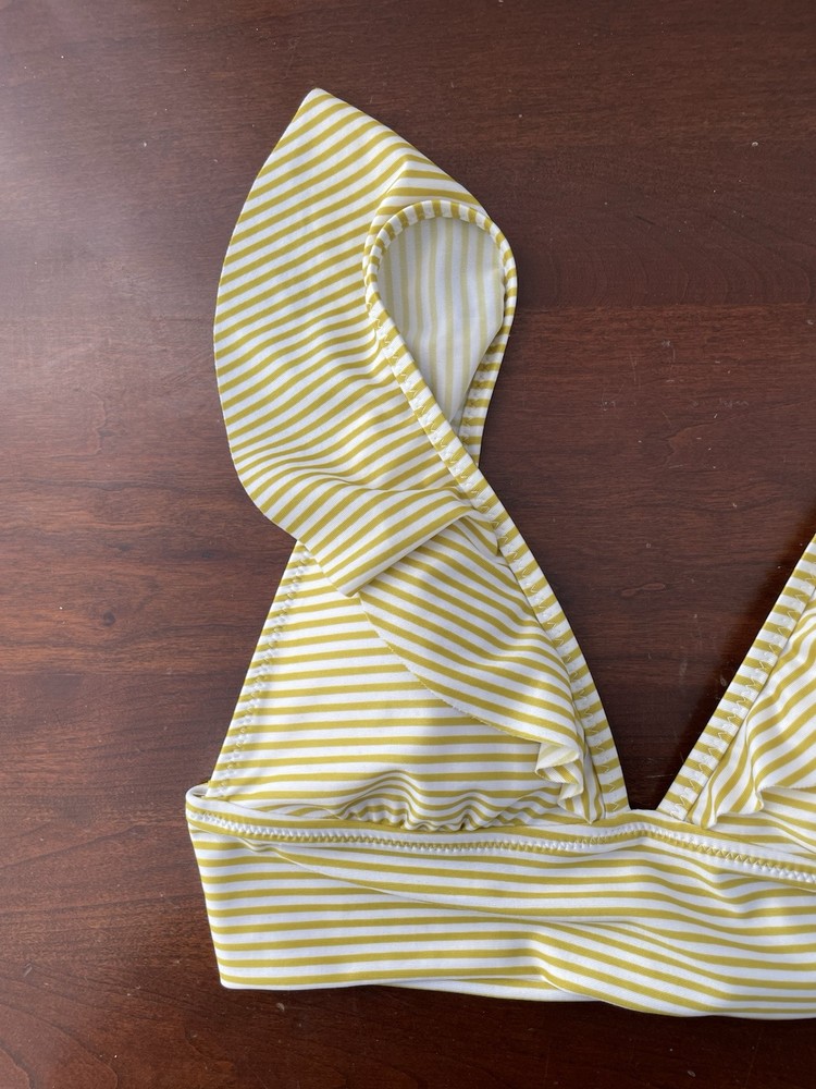 aerie Women's Striped Ruffle Adjustable Strap Padded Triangle Bikini Top Yellow S. Condition is pre-owned. Smoke free, pet free home. Shipped via USPS Ground Advantage. In very good condition. Free of rips or stains.