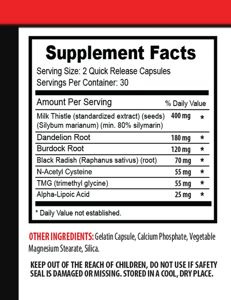 LIVER DETOX & CLEANSE SUPPORT FROM ANTI-INFLAMMATORIES IMPROVE SKIN HEALTH AND LOOK FIX YOUR DIGESTION AND PUT IT ON TRACK LOSE A COUPLE POUNDS GIVE YOUR LIVER WHAT IT NEEDS BOOST THE IMMUNE SYSTEM REINFORCE THE LYMPHATIC SYSTEM anti inflammatory eating - LIVER DETOX & CLEANSE - milk thistle seed - 1 Bottle (60 Capsules) LIVER DETOX AND CLEANSE: Liver Detox & Cleanse is formulated to help you with your liver and support it with the nutrients and vitamins from herbal sources. The formula includes: Milk Thistle, Dandelion Root, Burdock Root, Black radish and more! Enjoy the benefits! LIVER DETOX AND CLEANSE HAS ANTI-INFLAMMATORY PROPERTIES: Milk thistle is an herb that has been used for thousands of years to support liver, kidney and gallbladder health. It contains the flavonoid silymarin, which is thought to be responsible for many of its beneficial effects, including liver support and antioxidant, anti-viral and anti-inflammatory properties. LIVER DETOX AND CLEANSE IMPROVES SKIN HEALTH: A clean internal system is the first thing that we need to get bright and healthy skin. If your blood is full of impurities, your skin reflects it clearly. Black radish can be of great help to you in such a situation. Being a rich source of Vitamin-B complex, zinc, phosphorus, etc., it works as an effective blood supporter and helps detox all sorts of waste materials from our body. As a result, our overall skin health is improved to a large extent. LIVER DETOX AND CLEANSE IMPROVES DIGESTION: As mentioned above, black radish is a wonderful detoxification agent. It also clears waste from the stomach. This ensures that the acidity level of the stomach is maintained. Moreover, it is also rich in fibers. Fibers ease the process of digestion. Additionally, it improves the bile function that leads to improved digestion. As a result, the overall digestive rate of the body improves. LIVER DETOX AND CLEANSE CAN HELP LOSE WEIGHT: The diaphoretic activities of the black radish root, along with its detoxifying nature, enable it to be used as an aid for weight loss. It also has a very low calorie count, making it the perfect choice for those on a weight loss journey. If you’re struggling to lose those extra pounds, you might want to opt for black radish. Again, it’s black radish’s fiber content that increase satiety and reduce your chances of overeating. LIVER DETOX AND CLEANSE HELPS DETOX THE LIVER: The compounds that give burdock its bitter taste, also stimulate bile production and digestive juices in the gut, which helps the liver to rapidly process toxins and flush them from the system. Clearing toxins from the blood is one of the main purposes of the liver, and burdock’s organic compounds and components have been directly linked to improving this function. Dandelion has been shown to improve liver function by removing toxins and reestablishing hydration and electrolyte balance. It also increases the release of bile. LIVER DETOX AND CLEANSE BOOSTS THE IMMUNE SYSTEM: Burdock has significant levels of vitamin C and vitamin E, both of which act as antioxidants in the body to eliminate free radicals, which means that burdock is a major booster of our immune system. These antioxidants have been linked to supporting proper growth, and repairing the body’s cells and tissues. LIVER DETOX AND CLEANSE STRENGTHENS THE LYMPHATIC SYSTEM: Essentially, the lymphatic system is the the body’s inner “drainage system,” a network of blood vessels and lymph nodes that carry fluids from tissues around the body into the blood and vice versa. If you can make your lymphatic system stronger, then you can help your body ward off all kinds of conditions and serious health issues. Burdock root helps induce lymphatic drainage and detoxification. As a natural blood cleanser, it has a wonderful effect on the lymphatic system. DIRECTIONS: For adults, take two (2) quick release capsules one to two times daily, preferably with a meal. These statements have not been evaluated by the Food and Drug Administration. This product is not intended to diagnose, treat, cure or prevent any disease. WARNING: Do not take this product if you have an obstruction of the bowels or bile ducts. Consult your healthcare provider before use if you have or have had gallbladder problems. If you are pregnant, nursing or taking any medications, consult your doctor before use. If any adverse reactions occur, immediately stop using this product and consult your doctor. If seal under cap is damaged or missing, do not use. Keep out of reach of children. Store in a cool, dry place. Amount Per Serving Serving Size: 2 Quick Release Capsules * Daily Value not established. Servings Per Container: 30 Supplement Facts % Daily Value Milk Thistle (standardized extract) (seeds) (Silybum marianum) (min. 80% silymarin) 400 mg Dandelion Root 180 mg * Burdock Root 120 mg * Black Radish (Raphanus sativus) (root) 70 mg * N-Acetyl Cysteine 55 mg * TMG (trimethyl glycine) 55 mg * Alpha-Lipoic Acid 25 mg * OTHER INGREDIENTS: Gelatin Capsule, Calcium Phosphate, Vegetable Magnesium Stearate, Silica. PREMIUM FORMULA SUPPLEMENT