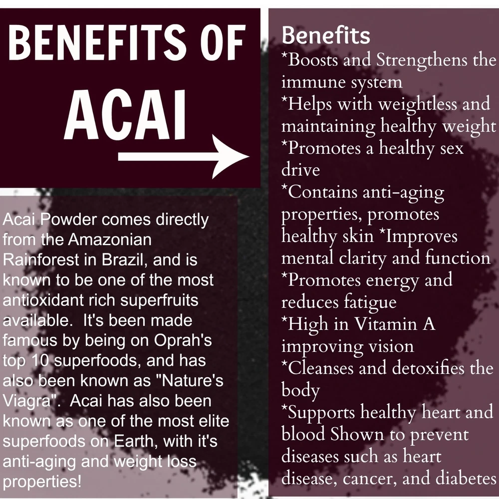 ACAI BERRY EXTRACT 1200MG RESVERATROL SUPREME 1200MG Healthy Digestive System Cleanse Properties Source Of Dietary Fiber Can Help Your Heart Improve Heart Health Regulate Your Levels Of Cholesterol Effects On Heart And Blood Circulation Reverse The Aging Process Strengthen Your Immune System Help You To Lose Weight 1 Bottle, 60 Capsules Of Acai Berry Extract 1200mg 1 Bottle, 60 Capsules Of Resveratrol 1200mg Made In USA Acai Berry – Resveratrol Combo 2B: The health benefits of drinking resveratrol come from moderate consumption. One of the antioxidants found in wine is Resveratrol, which is the one to have the beneficial effect. It is found in the skin of grapes, and that is where the red wine comes in because it has more than white wine. Acai berry is usually found in Brazil and Trinidad and the northern South America. It is mainly found in floodplains and swamps. Acai may provide numerous health benefits. Improves Digestion: Acai could help in maintaining a healthy digestive system. The berries contain powerful cleanse properties and are a great source of dietary fiber. Acai berry is fiber-rich and a natural digestive cleanser, which means it prevents the accumulation of substances and undigested matter from staying lodged in the colon where they can cause constipation and by-products. Healthy Heart: The antioxidants found in a resveratrol extract can help your heart in numerous ways to improve heart health. They can regulate your levels of cholesterol. They can protect your arteries from influence and prevent blood clots because the antioxidants enable your blood to flow easily. Resveratrol may also increase the levels of omega-3 fatty acids, which are also known to have protective effects on heart and blood circulation. Slows Aging Process: Not only do phytochemicals in acai help to strengthen your immune system, they also can slow or reverse the aging process. The dark purple berries offer a solid source of antioxidants; a single berry can provide up to ten times as many antioxidants than in grapes and double the amount than blueberries. A growing number of beauty products are featuring acai, which has a high antioxidant level for the skin. Your skin will be healthier and will glow more if you eat acai berries. Lose Weight: It is not surprising that this is also due to the resveratrol present in the skin of red grapes. For starters, your body will convert piceatannol from the resveratrol, which then binds to fat cells in a manner that stops these cells from growing and maturing. The resveratrol also helps to regulate your blood sugar level, which is known to influence appetite. As such, taking our resveratrol supplement might help you to lose weight since it minimizes the urge to overeat. Beneficial For The Immune System: Acai berries are also quite beneficial for the immune system of body. The stress is an important factor that leads to the weakening of immune system. The antioxidants in acai berry improve the overall functioning of the immune system by fighting off oxidative stress. Arabinogalactan is a unique fraction commonly found in acai berries. It is a specific kind of carbohydrate that increases the stimulatory activity and their overall production. Lower Your Cholesterol: Lowering your cholesterol may promote the improvement in your arteries, which might support the heart function. Consuming organic resveratrol made from high-fiber grapes helps to lower the levels cholesterol. As such, you can improve your overall health, particularly the health of your heart. By taking moderate amounts of organic resveratrol regularly might be beneficial for improving blood circulation and managing cholesterol levels. Aphrodisiac Properties: Aphrodisiac means that the foods which are helpful in increasing the sexual stamina of a person. Acai berries may provide some benefits on the sexual stamina of a person. The intake of acai berries increases the general blood circulation of the body. The lack of blood flow in the body is the main cause of sexual dysfunction and lack of sexual stamina. So acai berry can be considered as an alternative supplement to help improve sexual stamina. antioxidant berry powder - ACAI BERRY – RESVERATROL COMBO 2B - acai capsules Supplement Facts: Ingredients of Acai Berry Extract 1200mg: Acai Fruit (4:1 concentrate) 1200mg OTHER INGREDIENTS: Gelatin, Magnesium Stearate and Silicon Dioxide. Contains No sugar, salt, dairy, yeast, wheat, gluten, corn, soy, preservatives, artificial colors or flavors. SUGGESTED USE: As a dietary supplement, adults take one (1) taBlet, one (1) to three (3) times daily Between meals, or as directed By a health care professional. Serving Size: 2 Capsules, Serving Per Container: 30 Ingredients of Resveratrol 1200mg: Proprietary Blend: 1,200 mg Resveratrol (from polygonum cuspidatum, standardized extract), Pomegranate, Green Tea, Quercetin (from Citrus Bioflavonoids), Grape Seed Extract (standardized for polyphenois), Acai (4:1 extract), Enzymes. Other Ingredients: Calcium Carbonate, Magnesium Stearate, Gelatin. Directions: Take one capsule twice daily 30 minutes before meals with an 8oz glass of water. Serving Size: 2 Capsules, Servings per container: 30 Quality Guaranteed: To ensure that our Formula contains best ingredients, we meticulously analyze every batch in our labs to guarantee the highest quality. CAUTION: Do not exceed recommended dose. Pregnant or nursing mothers, children under the age of 18, and individuals with a known medical condition should consult a physician before using this or any dietary supplement. This product is manufactured and packaged in a facility which may also process milk, soy, wheat, egg, peanuts, tree nuts, fish, and crustacean shellfish. KEEP OUT OF THE REACH OF CHILDREN. DO NOT USE IF SAFETY SEAL IS DAMAGED OR MISSING. STORE IN A COOL, DRY PLACE. *These statements have not been evaluated by the Food and Drug Administration. This product is not intended to diagnose, treat, cure, or prevent any dis