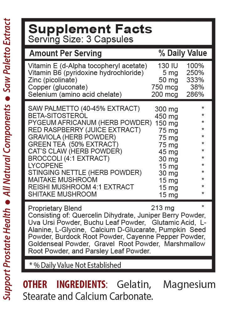 PROSTATE SUPPORT COMPLEX 1345MG. Immune support booster Antioxidant vitamins Prostate support supplement 2 Bottles 120 Capsules PROSTATE SUPPORT: In our natural supplement, Prostate Support, only natural ingredients are used to bring you the many benefits that are described here. The ingredients include: Vitamin E, Vitamin B6, Zinc, Copper, Selenium, Saw Palmetto, Beta-Sitosterol, Pygeum Africanum, Red Raspberry and many more! BONE HEALTH BENEFITS: Taking copper supplements can help maintain the health of your bones. Copper activates lysyl oxidase, a compound your cells need to make collagen, a component of healthy bone tissue. It also has a beneficial effect on bone density. You naturally lose bone density as you age, but taking copper supplements can slow bone density loss, explains the Linus Pauling Institute. HAIR HEALTH BOOSTER: Again, due to its impact, some men have begun using saw palmetto to stimulate hair growth as they age. Studies have shown a negative correlation between saw palmetto use and male-pattern baldness symptoms, so if your hair is beginning to thin out, consider some supplementation to wind back the clock. Copper compounds are found in every cell of the human body, this trace element helps in the production of melanin in the human body which is responsible for the pigmentation of skin, hair and eyes. BOOST OXIDATIVE DEFENSE: Selenium benefits may include the ability to fight the aging process and help the immune system by reducing free radicals. Selenium has a synergistic effect with other antioxidants like vitamin E, enabling the body to fight oxidative stress and defend against inflammatory conditions. Copper is a camponent of 50 types of enzymes, many of which work as antioxidants. Copper ingredients may aid in collagen production and skin regeneration and increase the effects of antioxidants. SKIN HEALTH BOOST: Copper peptides may be one of the most effective skin regeneration products. Peptides are fragments of proteins which play an important role in skincare, particularly in repairing damaged tissue and constructing new tissue. Copper is instrumental in attracting these peptides and binding with them, thus forming copper peptides. Thus copper plays an important role in carrying nourishing protein to damaged skin. URINARY SYSTEM SUPPORTER: Saw palmetto supports the urological system in men who have benign prostatic conditions. This occurs because of an interaction with the receptors in the lower urinary tract that can lead to urinary weakness and overactive bladder. Saw palmetto is also recommended to support weakening urinary system in elderly people because it strengthens the urinary system. SUPPORT YOUR PROSTATE: Beta-sitosterol has a long history of use in Europe for supporting the prostate. According to a report in the June 2005 issue of “Life Extension” magazine, studies have found that beta-sitosterol reduced symptoms of an inflamed prostate, such as reduced urinary flow. Beta-sitosterol appears to work by blocking the production of dihydrotestosterone, which triggers the enlargement of the prostate. BOOST IMMUNITY: Copper is a vital part of the healing process and ensures better wound healing. It acts as an extremely good immunity booster, and also works as a supporter which indirectly allows your body to defend itself and heal faster. It is a compound in various enzymatic processes that result in the healing process of tissue. Supplement Facts Serving Size: 3 Capsules Vitamin E (d-Alpha tocopheryl acetate) 130 IU 100% Vitamin B6 (pyridoxine hydrochloride) 5mg 250% Zinc (picolinate) 50mg 333% Copper (gluconate) 750mg 38% Selenium (amino acid chelate) 200mg 286% SAW PALMETTO (40-45% EXTRACT) 300mg * BETA-SITOSTEROL 450mg 450 * PYGEUM AFRICANUM (HERB POWDER) 150mg * RED RASPBERRY (JUICE EXTRACT) 75mg * GRAVIOLA (HERB POWDER) 75mg * GREEN TEA (50% EXTRACT) 75mg * CAT’S CLAW (HERB POWDER) 45mg * BROCCOLI (4:1 EXTRACT) 30mg * LYCOPENE 15mg * STINGING NETTLE (HERB POWDER) 30mg * MAITAKE MUSHROOM 15mg * REISHI MASHROOM 4:1 EXTRACT 15mg * SHITAKE MASHROOM 15mg * OTHER INGREDIENTS: Gelatin, Magnesium Stearate and Calcium Carbonate. SUGGESTED USE: As a dietary supplement, take three (3) capsules daily. CAUTION: Do not exceed recommended dose. Pregnant or nursing mothers, children under the age of 18, and individuals with a known medical condition should consult a physician before using this or any dietary supplement. This product is manufactured and packaged in a facility which may also process milk, soy, wheat, egg, peanuts, tree nuts, fish, and crustacean shellfish. * GREAT NATURAL PRODUCT