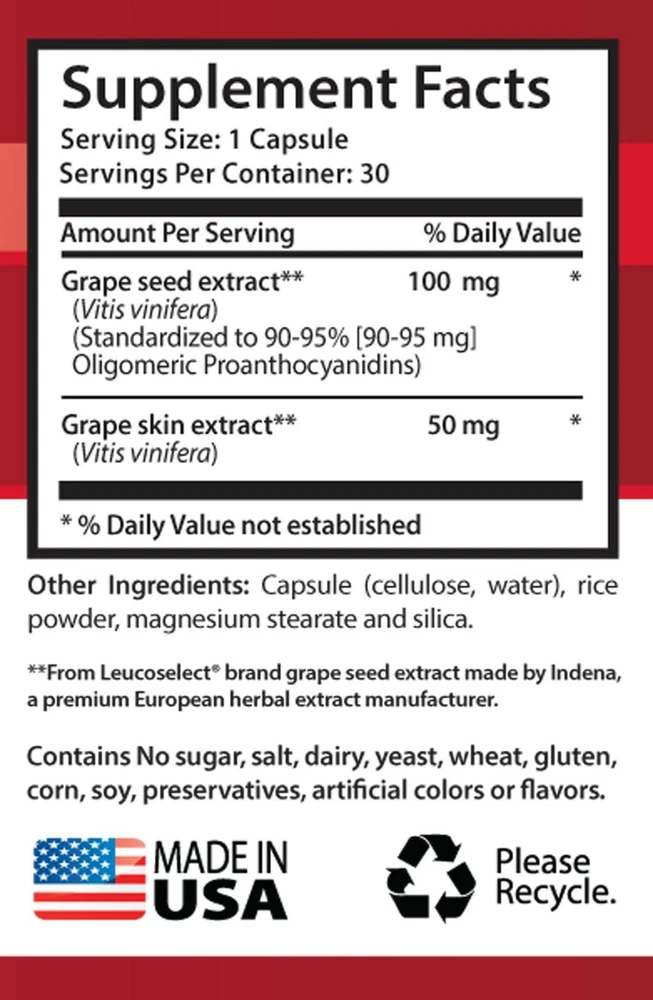 Grape Seed Extract 150mg Dietary Supplement Made in the United States 1 Bottle, 30 Capsules Product Description. Grapes have been cultivated and eaten for a long time. But grapes, along with other parts of the Vitis vinifera plant such as the leaves and sap, have also been used in traditional medicine in Europe for thousands of years. From the Egyptians to the ancient Greeks, the healing power of grapes and wine were realized, and grapes and grapevines were used to treat a variety of conditions including inflammation, pain, constipation, infections, and even various diseases. Today, grape seed extract is made primarily from the seeds of wine grapes. Grape seed extract has a rich antioxidant content, and these antioxidants have been studied for a number of therapeutic effects. Research has implicated that grape seed extract may help: Protect neurons. Reduce inflammation. Lower blood pressure. Prevent dental cavities. Increase fat metabolism. Improve cholesterol levels. Prevent bacterial and viral infections. Protect heart tissue and the cardiovascular system. Promote your defenses against the effects of sun exposure. Mitigate aging effects in the skin by protecting collagen and elastin. In grape seed extract one type of polyphenol called oligomeric proanthocyanidin is present at higher concentrations than all the others. OPC is a powerful antioxidant responsible for most of the beneficial therapeutic effects of grape seed extract. Proanthocyanidins are also found in other common foods and spices like fruits and especially berries, nuts, cinnamon, cocoa, and tea. Like these other foods, proanthocyanidins are found in grape skins and juice, but grape seed extract contains a much higher concentration. In fact, 70-90% of grape seed extract may be proanythocyanidins. The rest of grape seed extract contains procyanidin, different forms of catechins, and other bioactives in smaller amounts. As a strong antioxidant, proanthocyanidin protects from free radicals such as reactive oxygen species, defending your body from free radical damage from such factors as sun exposure, pollution, and stress. Standardized extracts of grape seeds have also been shown to have a positive effect in treating a wide range of health problems related to free radical damage. Supplement Facts Serving Size: 1 Capsule Servings per Container: 30 Grape Seed Extract - 100mg (Vitis vinifera)(Standardized to 90-95%[90-95mg] Oligomeric Proanthocyanidins) Grape Skin Extract - 50mg (Vitis vinifera) OTHER INGREDIENTS: Capsule(Cellulose, water), Rice Powder, Magnesium Stearate, and Silica. WARNING: KEEP OUT OF REACH OF CHILDREN. DO NOT USE IF SAFETY SEAL IS DAMAGED OR MISSING. STORE IN A COOL, DRY PLACE. *These statements have not been evaluated by the FDA. This product is not intended to diagnose, , treat, or prevent any disease. PREMIUM QUALITY PRODUCT