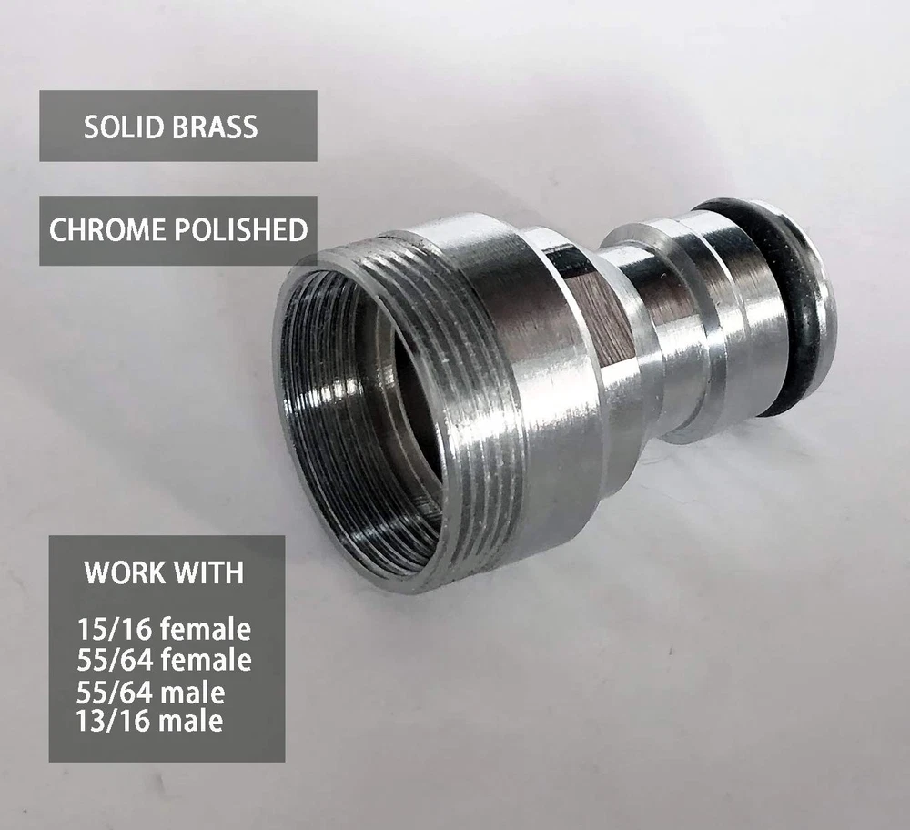 Installation Ⅰ.Unscrew the original aerator from your faucet. Ⅱ.For 55/64 male or 15/16 female threaded faucet, you just simple screw the snap on/in. For other threads Ⅲ. For 13/16 male or 55/64 female, you will need to an aerator adapter to connect faucet and the snap. Ⅳ.Connect garden hose or other hoses with 3/4 GHT female end to the quick-click coupler Ⅴ. Pull down on the outer sleeve and snap onto the sink. Ⅵ. After use, detached the hose; Without any screwing on and off, the snap remains attached to the sink for daily use 【ALL BRASS】 This quick attach kit includes a chromed snap and a brass quick-clip attachment part. they are both brass construed and last a lot longer than the plastic parts, the frequent stretching of a plastic snap will eventually cause the clip to fail. 【4 TYPES OF THREADING, ADAPTING A WIDE RANGE OF INDOOR FAUCETS】The nozzle that attaches to the faucet has both female/internal and male/external threads, It even comes with another 2 aerator adapters. Adapting to standard indoor kitchen sink, lavatory sink, utility sink and bathroom sink faucets. IPS: But you may be still having fitting problems, us for advises 【FAUCET ADAPTER TO 3/4" FEMALE GARDEN HOSE】allows quickly connect the garden hose with 3/4 in. GHT female end ( 5/8 inch diameter) to a indoor faucet,. Works perfect for portable washer/washing machine, patio watering , filling aquariums, putting warm water in pool outside, bathing pet .etc. 【QUICK CONNECT & RELEASE】This quick connect adapter kit is well designed and easily snaps on/off. It is a great adapter to have especially you are constantly hooking up a extend garden hose to an indoor faucet, you just quick release it after use, leave the chromed snap on faucet instead of unscrewing it every single time 【BUILD IN AERATOR,ANTI-SPLASH】the snap adapter that remains on faucet incorporates a removable build-in aerator which keeps water stream running smooth and no splashing all around, when disconnected after use, you still get a 'normal' stream of aerated water for daily use instead of switching it back and forth