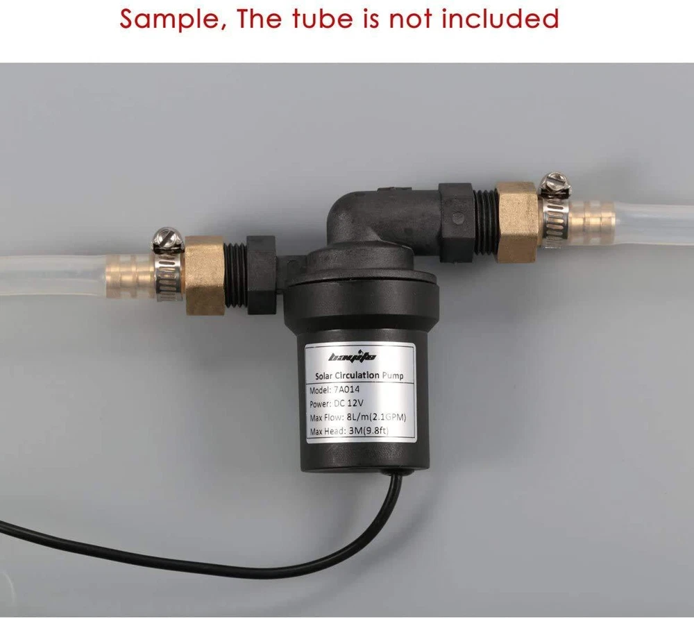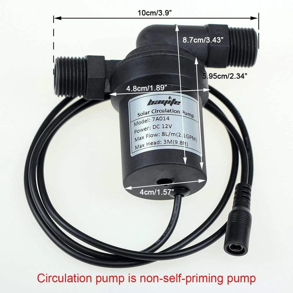 It's perfect for the home solar water heating systems or other circulation pump application. Brushless Motor,Super long working life,low consumption and low noise Power source: DC 12V Rated current: 0.7A Low noise: 30db at 1 metre Service life: 30000 hours up Inlet/Outlet: 1/2" male thead. Fit both 1/2" NPT and BSP female thead. We've tested. w/ two brass coupler Max Flow Rate: 8L/Min(2.1GPM) Max Water Head: 3 metre(9.8ft) Max system pressure: 10Bar(145PSI) Max circulating water temperature: 55°C/131°F. Can't be immersed in hot water exceeding 50°C/122℉ Package included: 1x bayite DC 12V Circulation Water Pump(NO POWER ADAPTER INCLUDED) Circulation pump is non-self-priming pump. Max Flow Rate: 2.1GPM, Max Discharge Head: 9.8ft 1/2" Male thread on the pump. The OD of the brass coupler is 10mm. Plug type: 2.1mm x 5.5mm female. NO POWER ADAPTER INCLUDED Power source: DC 12V(NOT INCLUDED), Rated current: 0.7A, Brushless Motor, Low noise: 30db at 1 metre, Service life: 30000 hours Max circulating water temperature: 55°C/131°F. It's submersible but can't be immersed in hot water exceeding 50°C/122℉ Wide Applications: bayite circulation pumps are indeed versatile and find use in various scenarios including: Hot/cold water circulation systems, water transfer projects, beer/wine brewing, funtains, greenhouses, solar water heater systems....