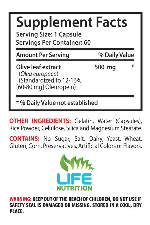 Olive Leaf Extract 500mg Gastroprotective Neuroprotective Anti-Inflammatory Antioxidant Improves Heart Health Lowers Blood Pressure Support Weight Management -Made in USA- (2 Bottles, 120 Capsules) What is Olive Leaf Extract and its Benefits? Olive leaf extract comes from the leaves of an olive plant. It contains an active ingredient called oleuropein. This nutrient is thought to contribute to the anti-inflammatory and antioxidant properties of olive leaf extract. You may have heard how a Mediterranean diet has been linked to a decrease in chronic diseases, especially cardiovascular disease. This is thought to be due to the focus on olive oil, leaves, and fruit in the diet. It’s been used as traditional medicine for centuries in countries like Greece, Morocco, and Tunisia. H eart Health Researchers believe olive leaf extract can have positive effects on atherosclerosis, or narrowing of the arteries, which is the highest risk factor for heart disease. High levels of LDL, or “bad” cholesterol, and total cholesterol are risk factors for developing this disease. One study from 2015 assessed the effects of olive leaf extract on cholesterol levels. Subjects who took the extract for eight weeks had significantly decreased cholesterol levels. Lowers Blood Pressure Olive leaf extract shows promise in the treatment of high blood pressure, according to a 2002 study published in the German journal Arzneimittel-Forschung. In the study, tests have revealed that olive leaf extract may have blood-pressure-lowering effects. Weight Loss Along with heart-healthy benefits and type 2 diabetes protection, it makes sense that olive leaf extract could also help with weight loss. An animal study from 2014 researched the effect of olive leaf extract in preventing high-fat, diet-induced obesity. It's thought that olive leaf extract prevents obesity by regulating the expression of genes that affect weight gain. Supplement Facts: Serving Size: 1 Capsule Servings per Container: 60 Olive leaf extract - 500mg (Olea europaea) (Standardized to 12-15% [60-80mg] Oleuropein) OTHER INGREDIENTS: Gelatin(Bovine), Water, Rice Powder, Cellulose, Silica and Magnesium Stearate. CONTAINS NO: Sugar, Salt, Dairy, Yeast, Wheat, Gluten, Corn, Preservatives, Artificial colors and flavors. WARNING: KEEP OUT OF REACH OF CHILDREN. DO NOT USE IF SAFETY SEAL IS DAMAGED OR MISSING. STORE IN A COOL, DRY PLACE. *These statements have not been evaluated by the FDA. This product is not intended to diagnose, cure, treat, or prevent any disease. GREAT QUALITY SUPPLEMENT