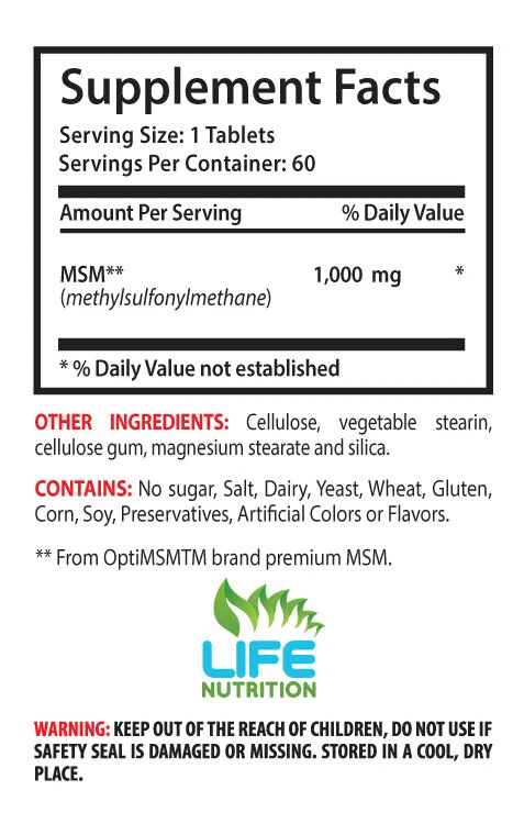 MSM 1000mg (Methylsulfonylmethane) Supports mobility and flexibility Natural energy booster Anti-Inflammatory Bone and joint health Made in the United States (1 Bottle, 60 Tablets) Product Description. MSM (methylsulfonylmethane) is an organic sulfur compound that's naturally derived during the earth's rain cycle. Sulfur is present in many natural unprocessed foods, but it's quickly lost during the cooking process. MSM is gaining a lot of attention due to the recent focus on longevity and anti-aging technologies. Health benefits of MSM (Methylsulfonylmethane) : Improves skin health. MSM is necessary for collagen production. Sagging skin and wrinkles, as well as dry, cracked skin are all developed through a loss of collagen. MSM works together with Vitamin C to build new, healthy tissues. MSM can normalize collagen formation and radically improve skin health. Improves flexibility. Research has shown that MSM is highly effective in improving joint flexibility. Additionally, it helps to produce flexible skin and muscle tissue. This leads to an increase in overall flexibility due to a restoration of the "juiciness" in the tissues. Strengthens hair and nails. Collagen and keratin and both critical for the production of healthy hair and nails. MSM is a bonafide "beauty mineral" that provides the sulfur needed to produce collagen and keratin. It's also highly noted to contribute to exceptional strength and thickness of the hair and nails, which can be noticed in just a couple weeks of consistent use. Naturally increases energy. Due to the increased permeability of the cells, less energy is required to deal with the accumulation of toxins. This results in more energy being redirected towards activity and necessary healing. Digestion is the biggest energy requirement of the body. MSM increases the absorption of nutrients so that the energy expenditure on digestion is vastly reduced. Anti-inflammatory. MSM is a powerful anti-inflammatory due to its ability to allow metabolic wastes to be removed from the cells. Excess weight on the body is actually inflammation. The cells of the body are chronically inflamed and retaining the byproducts of metabolic processes. Sulfur needs to be present In order for these toxins and wastes to be removed from the body. When these byproducts can be removed from the system, then the cells can also dispose of excess fluids that were being stored as a buffer. What results is a natural and effective reduction in unwanted weight. Supplement Facts Serving Size: 1 Tablet Servings per Container: 60 MSM - 1,000mg (Methylsulfonylmethane) OTHER INGREDIENTS : Cellulose, vegetable stearin, cullulose gum, magnesium stearate, and silica. WARNING: KEEP OUT OF REACH OF CHILDREN. DO NOT USE IF SAFETY SEAL IS DAMAGED OR MISSING. STORE IN A COOL, DRY PLACE. *These statements have not been evaluated by the FDA. This product is not intended to diagnose, cure, treat, or prevent any disease. GREAT QUALITY SUPPLEMENT