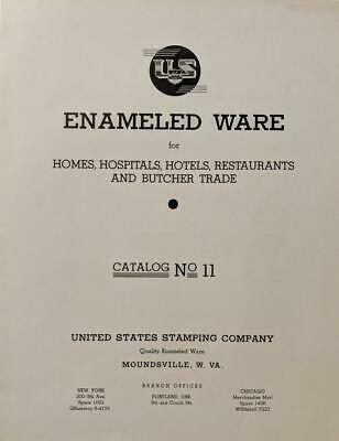 ca. 1936 UNITED STATES STAMPING CO. ENAMELED WARE CATALOG NO 11 Moundsville WV ca. 1936 UNITED STATES STAMPING CO. ENAMELED WARE CATALOG NO 11 Moundsville WV Click images to enlarge Description (PLEASE CLICK HERE TO SEE OUR OTHER ITEMS CURRENTLY LISTED ON EBAY.) Old Vintage Catalog, Enameled Ware Catalog No. 11 by United States Stamping Company of Moundsville, West Virginia. Includes product illustrations with descriptions. Loosely inserted price guide for 1936. Book contains approximately 23 printed pages and is about 8-1/2" x 11". Condition: light soiling and toning. Please see scans for additional condition review. Payment Payment must be received within 5 days after listing ends . Shipping Most items will be shipped via USPS or UPS. Images sell! Get Supersized Images & Free Image Hosting Create your brand with Auctiva's Customizable Templates. Attention Sellers - Get Templates Image Hosting, Scheduling at Auctiva.com. Track Page Views With Auctiva's FREE Counter
