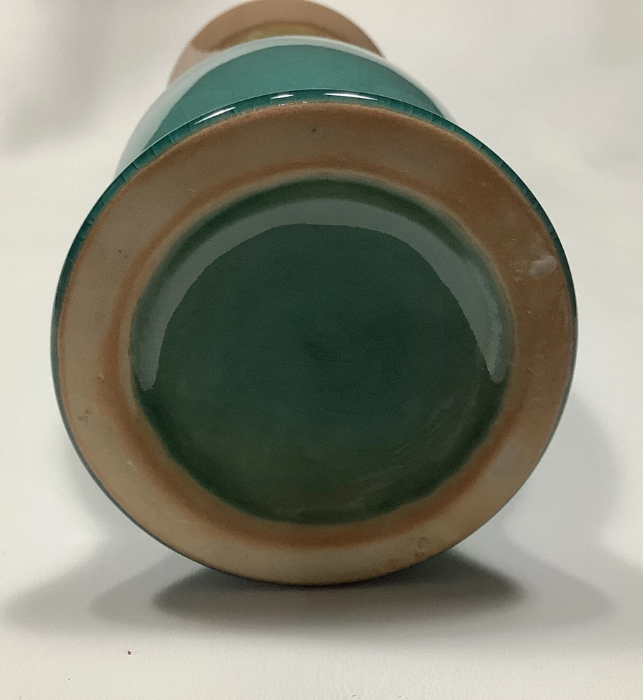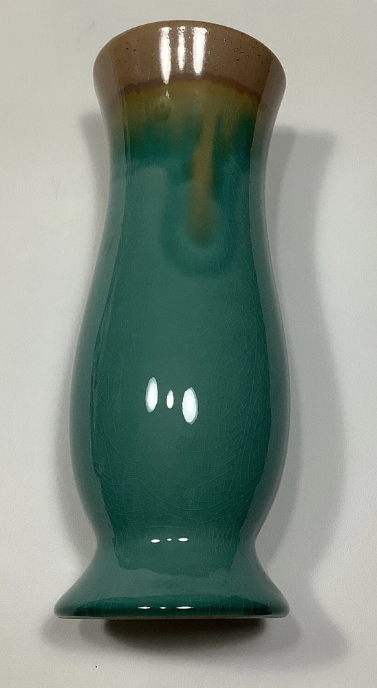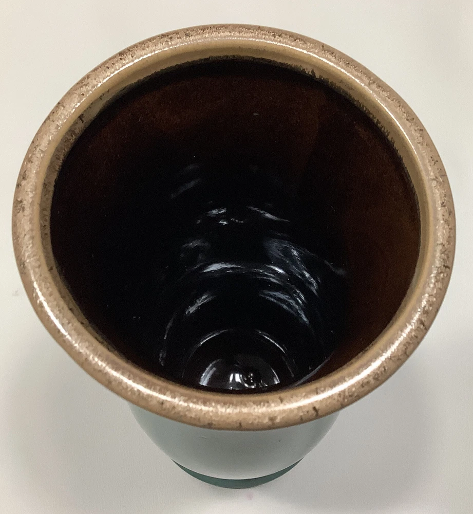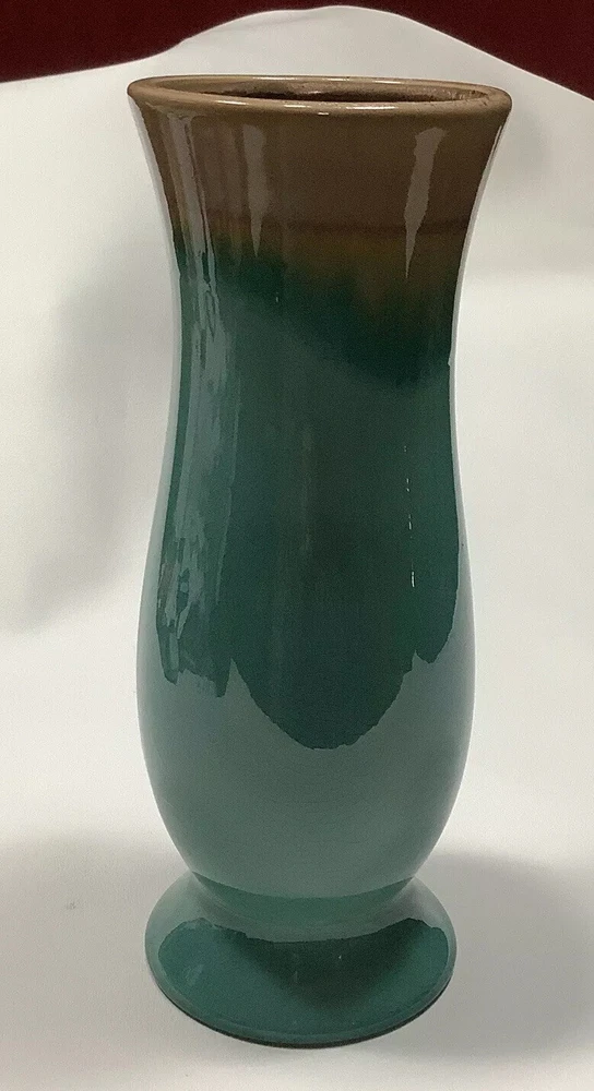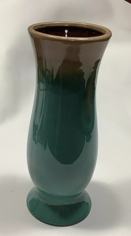 ceramic vase, vintage, pedestal with a band of tan drip around open end, no brand. Smooth surface, no cracks, ships or crazing. Interior is dark brown glaze and it sparkles. Size: 10”H x3-3/4”D This vase will enhance any space you wish, add floral arrangement or not. Thank you for viewing!