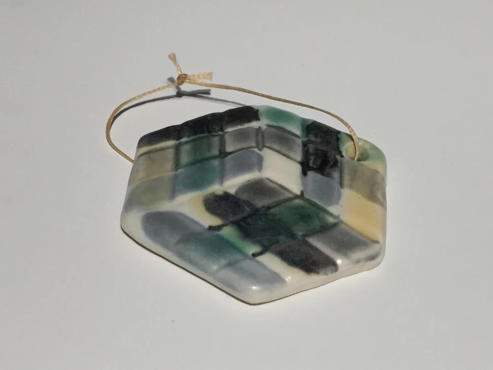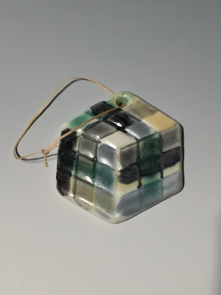 Handmade pottery piece fired to cone 6 with food safe glazes in painterly fashion. This piece was made by me, Curtis Fontaine, an apprentice of Toshiko Takaezu for two years. Most of my work is inspired by time with Toshiko and her spirit towards being an artist. At www.CurtisFontaine.com one can see more of my work. This piece is part of a series of my first cone 6 venture. With lots of experience making these glazes I am finally able to create and combine for new finishes. Unsigned. But can come with signed hand-painted card on request. This cube ornament is 2.75 in. around.