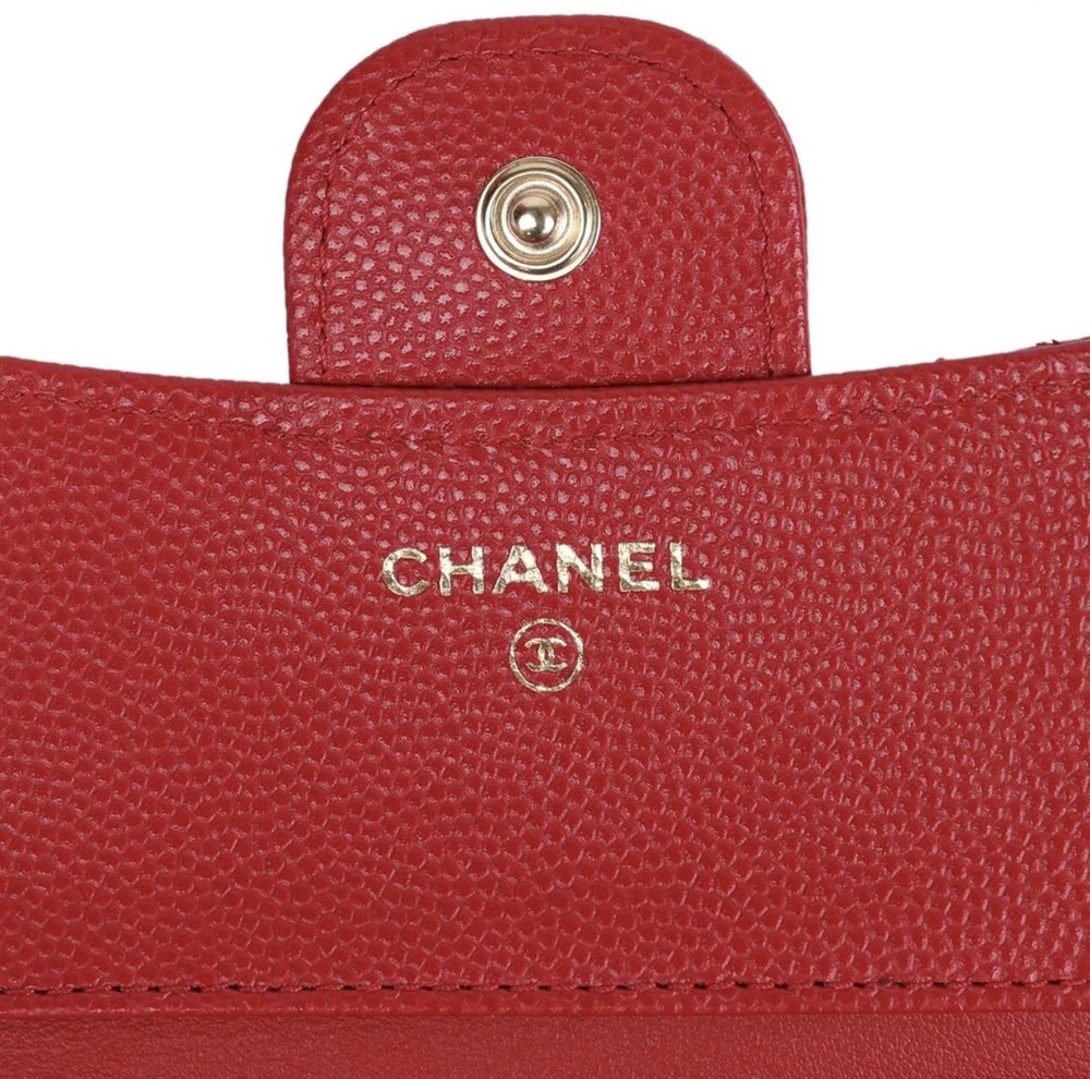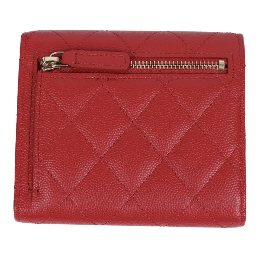 Size Base length: 4.50 in Height: 4.25 in Width: 1.00 in Description This is an authentic CHANEL Caviar Quilted Compact Flap Wallet in Red. This stylish compact wallet is crafted of luxurious diamond quilted caviar leather in red. The wallet features a small polished light gold Chanel CC logo and a flap pocket. The wallet opens to red interior with card slots and a bill pocket. This is a perfect wallet, ideal for everyday use, with the one of a kind style, from Chanel! Condition very good