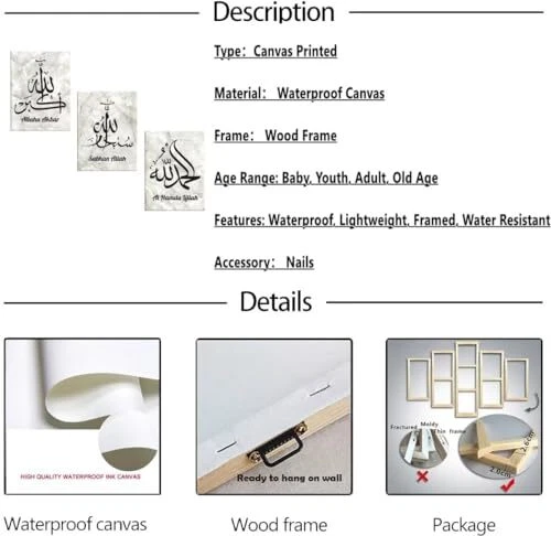 Menu 1. We require immediate payment. 2. We currently accept payment via eBay managed payments only. 3. Once payment is cleared, we will dispatch your shipment within 1-3 business days. Please refer to the "Shipping" tab for more information regarding shipping speed to your destination. chenchenArt Islamic Canvas Wall Art Muslim Allah Picture Motivational Quran Quote Prints Modern Artwork Ramadan Home Living Room Bedroom Decoration Framed Ready to Hang(12''W x 16''H x3) Product description ?Islamic wall art size: 12''W x 16''Hx3, islamic canvas artwork easy ready to hang. ?Islamic calligraphy canvas wall art will decoration your living room, bedroom,office,church,hallway,kitchen or farmhouse, dormitory and bathroom wall decorations better than better, you can enjoy the canvas pictures every day. ?High quality canvas, adopting professionally islmaic printed with fade resistant technology and premium inks makes the printed poster more colorful and three-dimensional,stable and efficient delivered to ensure they reach your hands intact. Surprise artwork to others,Islamic wall decor paintings,islamic calligraphy posters pritns,islamic pictures prints,islamic canvas paintings prints for your lover,elderly,mom and dad,grandparents,colleagues,friends. ?If t is any problem when you receiving the product, please contact me, we will provide you fastest and most effective response to help you solve your problem. Your satisfaction is our pursuit. PLEASE MESSAGE US IF YOU HAVE ANY OTHER QUESTIONS, AND MANY THANKS FOR READING ALL OF THIS. Copyright ©#. All Rights Reserved.