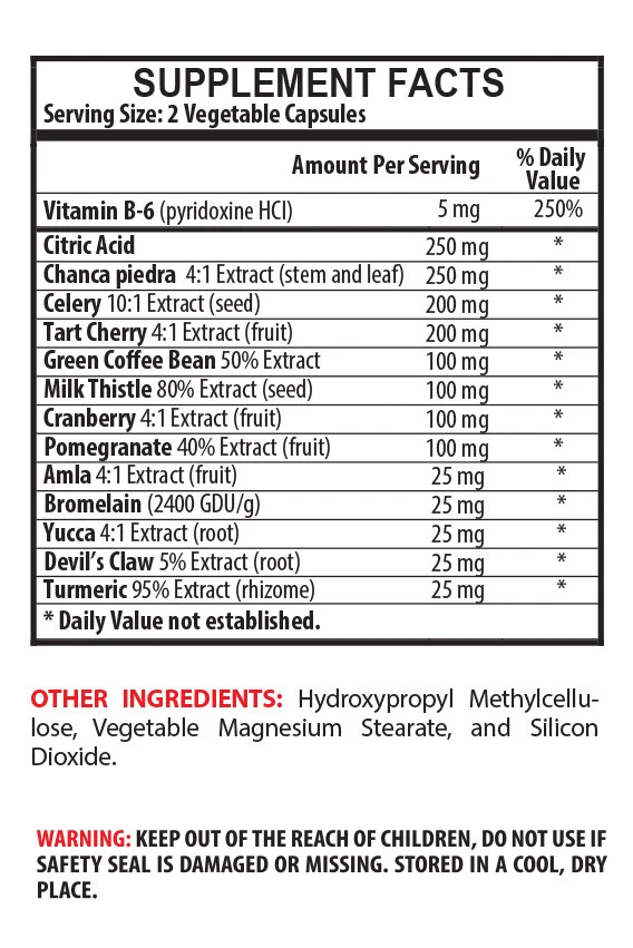 Uric Acid Formula 1430mg Rich in Antioxidants Multivitamins & Minerals Liver Support Gout & Bunion Relief Urinary Tract Support Kidney & Gallbladder Health -Made in USA- (2 Bottle, 120 Capsules) What is Uric Acid? Uric acid is a natural waste product from the digestion of foods that contain purines. Purines are found in high levels in some foods such as: - certain meats - sardines - dried beans - beer Purines are also formed and broken down in your body. Normally your body filters out uric acid through your kidneys and in urine. If you consume too much purine in your diet, or if your body can’t get rid of this byproduct fast enough, uric acid can build up in your blood. A high uric acid level is known as hyperuricemia. This can lead to gout that causes painful joints that accumulate urate crystals. It can also make your blood and urine too acidic. Benefits of Pomegranate A cup of pomegranate has 144 calories, 3 grams of protein, 7 grams of fiber, 30% of the recommended daily allowance of vitamin C which is very important for gout sufferers, and 12% of the recommended daily allowance of potassium. Plus they are a good source of vitamins B, manganese, copper and phosphorus. The most important health benefit of pomegranate though is it’s powerful antioxidant properties which help reduce uric acid in the blood. The reason is because it contains the most of every type of antioxidant out there.According to a 2008 study published in the Journal of Agricultural and Food Chemistry which evaluated the potency of 10 different beverages that were rich in polyphenols, pomegranate juice was ranked first as the healthiest of them all! Pomegranate beat its’ competitors by at least 20% like acai juice, blueberry juice and grape juice. Benefits of Tart Cherry Generations of people have reported that cherries keep joint pain and gout flares in check. Now, scientists are putting this popular folk remedy to the test, with promising results. In a study of 633 participants, Boston University Medical Center researchers found that eating at least 10 cherries a day protected people with existing gout from recurrent attacks. The findings were published in 2012, in a supplement to the journal Arthritis & Rheumatism. Benefits of Milk Thistle Your body needs a healthy liver in order to metabolize the uric acid before your kidney can pass it out through your urine and if the liver ain’t functioning at 100%, uric acid build up may cause gout. So as a gout sufferer it is important to keep your liver healthy and that is what milk thistle can do for you. Supplement Facts: Serving Size: 2 Vegetable Capsules Servings per Container: 30 Vitamin B-6 (pyridoxine HCl) 5 mg Citric Acid 250 mg Chanca piedra 4:1 Extract (stem and leaf) 250 mg Celery 10:1 Extract (seed) 200 mg Tart Cherry 4:1 Extract (fruit) 200 mg Green Coffee Bean 50% Extract 100 mg Milk Thistle 80% Extract (seed) 100 mg Cranberry 4:1 Extract (fruit) 100 mg Pomegranate 40% Extract (fruit) 100 mg Amla 4:1 Extract (fruit) 25 mg Bromelain (2400 GDU/g) 25 mg Yucca 4:1 Extract (root) 25 mg Devil’s Claw 5% Extract (root) 25 mg Turmeric 95% Extract (rhizome) 25 mg OTHER INGREDIENTS: Hydrocypropyl Methylcellulose, Vegetable Magnesium Stearate, and Silicon Dioxide. SUGGESTED USE: As a dietary supplement, take 2 capsules daily preferably with meals or as directed by a healthcare professional CAUTION: Do not exceed recommended dose. Pregnant or nursing mothers, children under 18, and individuals with a known medical condition should consult a physician before using this or any dietary supplement. This product is manufactured and packaged in a facility which may also process milk, soy, wheat, egg, peanuts, tree nuts, fish and crustacean shellfish. WARNING: KEEP OUT OF REACH OF CHILDREN. DO NOT USE IF SAFETY SEAL IS DAMAGED OR MISSING. STORE IN A COOL, DRY PLACE. *These statements have not been evaluated by the Food and Drug Administration. This product is not intended to diagnose, help, cure or prevent any disease. GREAT QUALITY SUPPLEMENT