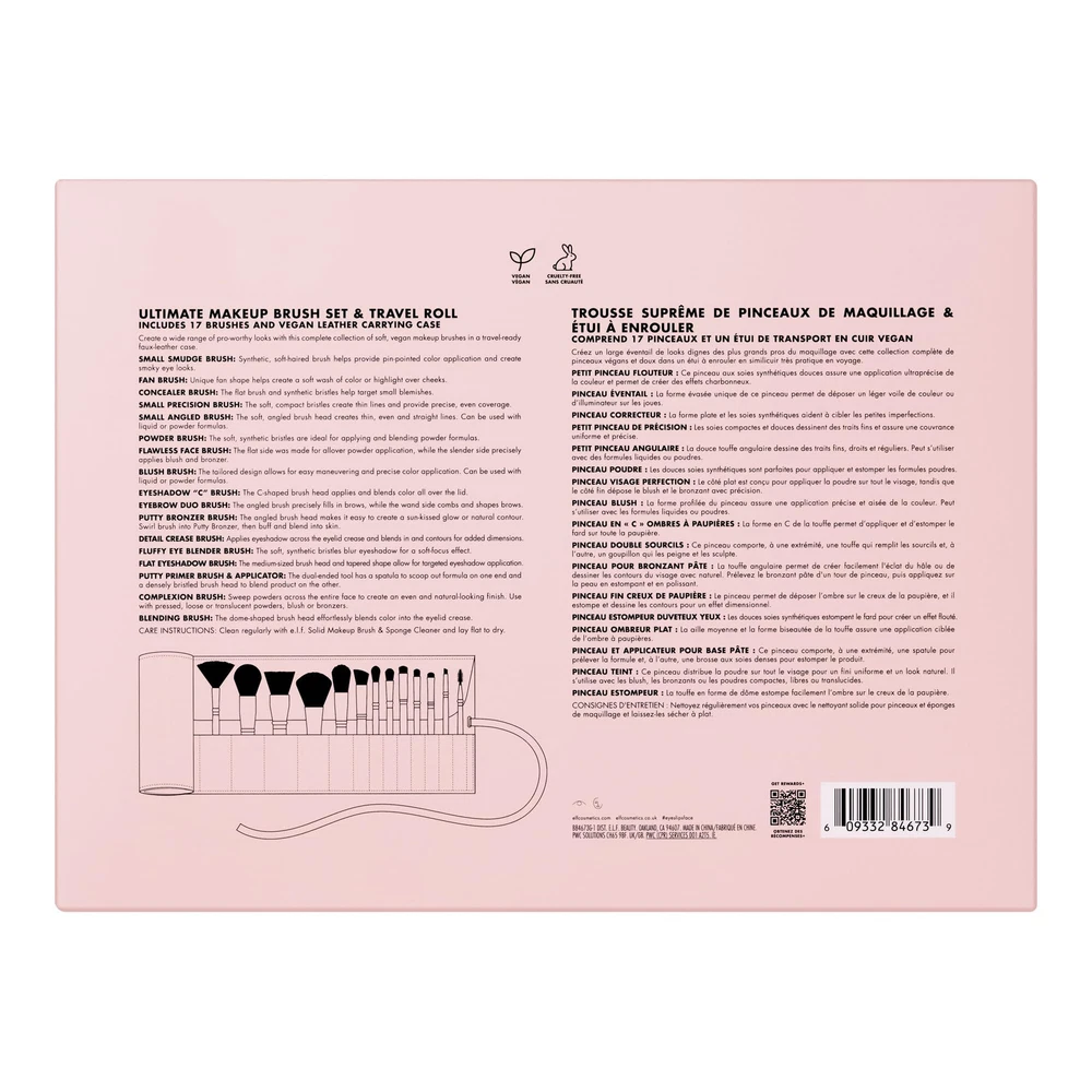 Get the tools you need to create makeup looks from uber-minimalist to wild-as-e.l.f. and everything in between, with our 17-Piece Ultimate Makeup Brush Set & Travel Roll. This high quality full brush set has got what you need to apply every step of your makeup, from primer to setting to complexion and even eyes. Includes some of our most iconic brushes to help you scoop, buff, blend, and smudge your way to a wide range of gorgeous looks. It’s the perfect set when your makeup brush travel case needs an overhaul. What it is: The ultimate makeup brush collection, including 17 high quality brushes plus a travel roll to create a wide range of everyday looks. Why you'll love it: Includes 17 full size brushes for completing all your eye and face looks Professional quality Synthetic, 100% vegan, & cruelty-free soft bristles Travel-friendly vegan leather brush roll Brush Set Includes: Face Brushes: Flawless Face Brush: Face makeup brush to create a soft, natural finish. Putty Primer Brush and Applicator: A dual-ended makeup tool & buffer makeup brush for easy putty primer application. Fan Brush: Use to lightly dust on or to contour. Blush Brush: Can be used to apply blush or bronzer. Complexion Brush: Soft, oversized face makeup brush. Brush: Soft & versatile face makeup brush for powders. Concealer Brush: Flat concealer brush to cover imperfections. Putty Bronzer Brush: Angled makeup brush for use with Putty Bronzer. Blending Brush: This loose, dome-shaped brush is perfect for blending eyeshadow. Eye Brushes: Small Smudge Brush: Small makeup brush ideal for creating smoky eyes. Small Precision Brush: Creates thin lines and precise coverage. Fluffy Eye Blender Brush: Soft eye makeup brush for blending & blurring. Detail Crease Brush: Applies eyeshadow precisely into the crease of the eyelid for an expertly blended look. Eyeshadow “C” Brush: Curved eyeshadow brush for blending & diffusing. Small Angled Brush: Perfect for precise color application and creates even, thin, and straight lines every time. Flat Eyeshadow Brush: Ideal for applying cream or liquid eyeshadows to the eye area. Eyebrow Duo Brush: Dual-sided brow brush includes a dense angled brush on end to fill in and contour brows while the wand side combs and shapes hair into place. Travel Roll: To keep all your brushes neat and tidy Ingredients may change or vary from time to time. Please refer to the packaging of the product received for the list of ingredients in your particular product. All e.l.f. products are proud to be 100% vegan, cruelty-free, and Leaping Bunny Certified. Because kindness is chic. THE ULTIMATE BRUSH SET: Get the tools you need to create makeup looks from uber-minimalist to wild-as-e.l.f., and everything in between with e.l.f. Cosmetics Ultimate Makeup Brush Set & Travel Roll. BRUSHES FOR EVERY STEP: This full brush set has got what you need to apply every step of your makeup, from primer to setting to complexion and even eyes. SCOOP, BUFF OR BLEND: Includes some of our most iconic brushes to help you scoop, buff, blend, and smudge your way to a wide range of gorgeous looks. GREAT FOR TRAVEL: It’s the perfect set when your makeup brush travel case needs an overhaul. VEGAN & CRUELTY-FREE: 100% vegan, e.l.f. is double-certified cruelty-free by Leaping Bunny & PETA.