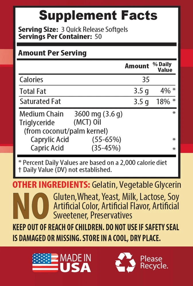 energy boost appetite suppressant - MCT OIL - immune system recovery 2BOTTLE MCT OIL ENHANCE ENERGY LEVELS HEALTHY IMMUNE FUNCTION ENHANCES DIGESTION PROMOTES CARDIO HEALTH ENHANCES COGNITION BOOST LIVER HEALTH WEIGHT MANAGER 2 BOTTLE = 300 SOFTGELS MCT OIL: MCT oil stands for medium-chain triglycerides, also known as medium-chain fatty acids, which are widely known as beneficial nutrients for the body. These are commonly considered “good” forms of fat, which can do everything from boost the metabolism to improve the strength of the immune system. These medium-chain fatty acids (MCFA or MCT oils) are named C-6 (caproic acid), C-8 (caprylic acid), C-10 (capric acid) and C-12 (lauric acid). All of these acids are also found in coconut oil, which is why many people confuse the two. However, the majority of medium-chain fatty acids found in coconut oil (a total of 50-65% of the fats) are lauric acid. MCT OIL ENHANCE ENERGY LEVELS: The unique absorption and rapid metabolization allows our bodies to use fat as fuel, instead of storing it for later. It means that our organs and muscles can use this fuel almost immediately. As MCT contributes to our body’s metabolic pathways, an excess in ketones occurs. Not only is it good for weight management, but it’s excellent for increasing energy. Some claim that MCT oil can also improve physical endurance for athletes engaging in high-intensity workouts. MCT OIL PROMOTE HEALTHY IMMUNE FUNCTION: The antimicrobial, antibacterial and antifungal qualities of lauric acid and caprylic acid make MCT oil a worthy immune system supporter, and there have been plenty of research on linking these to better overall health. There is an increase in immune activity and white blood cell production in the body, while the antioxidant effects of these acids also reduce levels of oxidative stresses. MCT OIL ENHANCES DIGESTION: For digestion, there are gut-health benefits when supplementing your diet with MCT oils. A more recent study shows promising evidence that MCT oil can help remodel your gut microbiome. The gut microbiome is a key marker for metabolic health. If you didn’t know, metabolic health can have an impact on the look of your skin, your immune health, and even your overall mood. MCT OIL PROMOTES CARDIO HEALTH: One of the main factors leading to cardiovascular disease and heart problems is obesity, and with the low-fat deposition effect of MCT oil, there is a better chance of remaining slim, keeping overall cholesterol levels down, lowering blood pressure and blood sugar. While consuming fats may seem counterintuitive to heart health, MCTs are those “good” fats you need in your diet. Ofocurse do not overconsume MCTs as they can also cause unwanted effects. MCT OIL ENHANCES COGNITION: When small medium-chain fatty acids convert directly into ketones, one of the areas where these are believed to have the most effect is in the brain. By providing energy to and protecting neural pathways, these ketones can mitigate the symptoms of dementia and other neurodegenerative conditions, by providing energy for concentration, focus and memory retention. MCTs also can cross the blood brain barrier easily applying the enhancements relatively quickly compared to other fats. MCT OIL BOOST LIVER HEALTH: As mentioned, caprylic, caproic and capric acids all bypass the liver when being converted into energy, but that isn’t true for lauric acid. While some MCT oils eliminate lauric acid (C-12), not all of them do. It must be processed by the liver. MCT oils are supportive to the liver due to the healthy bile production triggered by the MCT oils. MCT OIL WEIGHT MANAGER: Several studies have shown that MCTs may increase fullness, reduce appetite, and decrease overall caloric intake. Research suggests MCTs may trigger the release of key satiety and appetite-suppressing hormones (like leptin) to a greater degree than other types of fats. Considering MCTs may both increase metabolic rate and help manage food intake, it stands to reason that supplementing with MCTs and replacing normal dietary fat with MCTs can help support weight management. CAUTION: Do not exceed recommended dose. Pregnant or nursing mothers, children under the age of 18, and individuals with a known medical condition should consult a physician before using this or any dietary supplement. These statements have not been evaluated by the Food and Drug Administration. This product is not intended to diagnose, treat, cure, or prevent any disease. PREMIUM QUALITY PRODUCT
