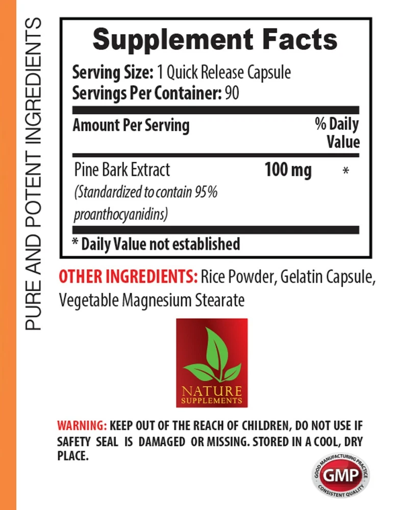 energy & fat metabolism - PINE BARK EXTRACT - pine nut oil capsules 1B Pine Bark Extract SUPPRESSES APPETITE ENERGY BOOSTER SUPPORTS HEART HEALTH BOOSTS METABOLISM SUPPORTS DIGESTION BONE STRENGTHENER IMMUNE SUPPORT 1 BOTTLE = 90 Capsules PINE BARK EXTRACT: Pine bark and oil contain vitamins, amino acids, antioxidants and minerals, which are essential for healthy living. Recent studies have shown that pine bark and oil can help us to promote heart health and increase resistance against infections and viruses. However, read on to learn more benefits this powerful food supplement can grant. PINE BARK EXTRACT SUPPRESSES APPETITE: Research shows that pine bark contain certain fatty acids that might help curb appetite. These fatty acids in pine bark help release a hormone called cholecystokinin (CCK), which is known to suppress appetite. When the study was done on people, it revealed encouraging results. Another study found that pine bark can boost the functioning of appetite suppressants by up to 60 percent for as long as 4 hours. The important fatty acid in pine bark is pinoleic acid, which studies say is a promising satiety ingredient. PINE BARK EXTRACT ENERGY BOOSTER: Certain specific nutrients in pine bark, like monounsaturated fat, iron, and protein, can help boost energy levels. They also are a great source of magnesium. When magnesium is at low levels in the body, it can cause fatigue. Pine bark also help build and repair tissues in the body that might otherwise lead to fatigue. PINE BARK EXTRACT SUPPORTS HEART HEALTH: You can consume pine bark to improve your cardiovascular health without worrying about adverse effects. The wondrous bark are a powerhouse of manganese, magnesium, monounsaturated fat, Vitamin E and K; together these minerals and vitamins function to protect your heart from various problems allowing proper blood flow to your arteries. Pine bark are also considered a safe source to widen your narrow arteries. PINE BARK EXTRACT BOOSTS METABOLISM: Pine essential oil also increases metabolism and boosts your activity levels. It is also helpful in purifying the body due to its ability to remedy intestinal problems. It is diuretic in nature and helps remove excess water from your body through urination. By stimulating the frequency and quantity of urine, you eliminate more uric acid, excess water, salt, and fat from your system. It also keeps the kidneys healthy, because they don’t have to filter the toxins more than once. PINE BARK EXTRACT SUPPORTS DIGESTION: Pine bark effectiveness as a natural digestive aid is partly due to the concentration of carotenoids found in the oil. Carotenoids are organic pigments found in some plants, algae, and fungi and help reduce oxidative damage caused by free radicals. Free radicals, along with an unhealthy and stressful lifestyle, play a role in the development of gastric and duodenal disorders. Pine bark is also rich in vitamin E, a powerful antioxidant. PINE BARK EXTRACT BONE STRENGTHENER: After calcium, you need Vitamin K to keep your bones strong. According to a recent study, high content of vitamin K in your body can prevent your bones from falling prey to brittleness. It is widely used in promoting bone density. When your bones are dense, you will less likely be prone to fractures. Pine bark contain vitamin K and are a delicious option to strengthen your bones. PINE BARK EXTRACT IMMUNE SUPPORT: Your immune system does a great job to keep your body unaffected by infectious bacteria, free radicals, and other stresses. So, you need to consume foods that can boost your immunity like pine bark. Apart from other nutrients, you can enrich your body with Zinc and manganese by consuming pine bark. Both compounds are potent enough to boost your immune system that will result in strengthening connective tissues and balanced wellness. Moreover, a strong immune system is also function to destroy bacteria, and toxins. CAUTION: Do not exceed recommended dose. Pregnant or nursing mothers, children under the age of 18, and individuals with a known medical condition should consult a physician before using this or any dietary supplement. These statements have not been evaluated by the Food and Drug Administration. This product is not intended to diagnose, treat, cure, or prevent any disease. GREAT QUALITY PRODUCT