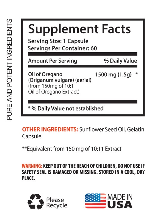 OREGANO OIL 10:1 EXTRACT 1500MG Lower Your Cholesterol Levels Strengthen Your Immunity Nervous System Support Protection Digestive Aid. Menstrual Aid, Allergy Support. Weight Loss, Eases Discomfort, Anti-inflammatory Antifungal, Antiviral, Antiparasitic, Antioxidant Stabilize Mood, Supports Graceful Aging Improve Learning, Focus And Mood Balance Energy Levels 3 Bottles, 180 Capsules Made In USA Oregano Oil Benefits: Oregano is a fragrant herb that's best known as an ingredient in Italian food. However, it can also be concentrated into an essential oil that's loaded with antioxidants and powerful compounds that have proven health benefits. The health benefits of Oregano Essential Oil can be attributed to its properties as antioxidant and digestive substance. Oregano oil appears to be useful both when consumed or applied to the skin. This natural supplement with oregano oil may also help you lose weight and lower your cholesterol levels. About Oregano Essential Oil: Oregano is a plant native to higher altitudes and normally grows in the mountains, which is how it got the name “Oregano”, which means “Delight of the Mountains”. Oregano oil comes from the leaves and shoots of the oregano plant. Botanically known as Origanum vulgare, oregano is a flowering plant from the same family as mint. It is often used as an herb to flavor food. It is traditionally used in one of different ways, either aromatically, which is the most popular since the advent of aromatherapy’s widespread use in recent decades. You can also apply it topically onto the skin, or through a carrier oil like coconut oil. Immune System Support: It is a known fact that oregano oil is a powerful tool for the immune system. Oregano oil has a natural herbal benefits that may be useful for dealing with outside influences and colds. It helps boost your immune system and even helps to protect the entire body health and defense. This means that it strengthens your immunity and provide you with numerous health benefits. Promotes a Balanced Mood: Some compounds in oregano oil, including carvacrol, thymol, and terpinene may positively influence the nervous system and mind. Aromatherapy with oregano oil seems to promote a healthy mood, reduce stress, and alertness. The impressive ability of oregano oil to help stabilize mood and even balance energy levels. Our herbal supplement may show its benefits in improving learning, focus and mood. Digestive Aid: I’ve said it a million times health begins in the gut! Good digestion is absolutely necessary to experience good health. While I recommend using an oxygen-based colon cleanser to clean out your digestive tract, stopping the build-up in the first place needs to be part of the plan, and oregano oil can help. Oregano oil is known to stimulate the flow of bile into the digestive organs, enhancing the digestive process. Weight Loss: In addition to its reputation as a natural immune booster, oregano oil also packs a punch against unwanted body fat. Its main active ingredient is thought to help suppress appetite and help to control obesity. It is also an all-around immune system booster and can help improve digestion when consumed. The health benefits of oregano oil include weight loss, obesity and weight gain. Powerful Antioxidant: Antioxidants help protect the body from numerous outside influences. These influences may include aging changes. Antioxidant components may be useful in dealing with metabolism. One study compared the antioxidant content of 39 commonly used herbs, and found that oregano had the highest concentration of antioxidants. Oregano has a very high antioxidant content that is much higher than that of most fruits and vegetables, gram per gram. The antioxidant content is concentrated in oregano oil. Improve Gut Health: Oregano may benefit gut health in a number of ways. Good digestion is absolutely necessary to experience good health. Oregano oil due to its antioxidant properties may boost the gut health and digestion. All the natural ingredients which help digest food, produce vitamins and improve heart health, among other functions. Oregano oil may benefit gut health by improvident entire body functioning. Supplement Facts: energy vitamin for women - OREGANO OIL 10:1 EXTRACT 1500MG 3B - oregano oil vegetarian capsules Oil of Oregano (Origanum vulgare) (aerial) 1500 mg (1.5g) (from 150mg of 10:1 Oil of Oregano Extract) OTHER INGREDIENTS: Sunflower Seed Oil, Gelatin Capsule. Equivalent from 150 mg of 10:11 Extract Serving Size: 1 Capsule Servings Per Container: 60 Amount SUGGESTED USE: As a dietary supplement, adults take one (1) capsule, one (1) to three (3) times daily with food, or as directed by a health care professional. Store in a cool, dry place and away from direct light. CAUTION: Do not exceed recommended dose. Pregnant or nursing mothers, children under the age of 18 and individuals with a known medical condition should consult a physician before using this or any dietary supplement. WARNING: KEEP OUT OF THE REACH OF CHILDREN, DO NOT USE IF SAFETY SEAL IS DAMAGED OR MISSING. STORED IN A COOL, DRY PLACE. *These statements have not been evaluated by the Food and Drug Administration. This product is not intended to diagnose, treat, cure, or prevent any disease. GREAT QUALITY PRODUCT