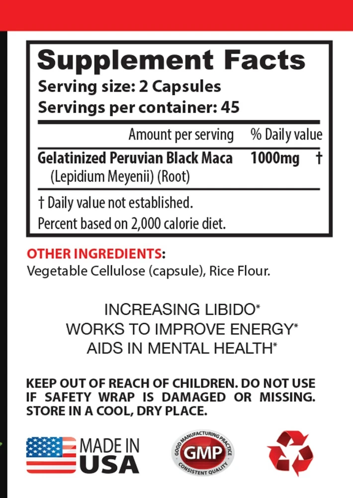 energy-boosting - BLACK MACA - energy naturally 1 BOTTLE BLACK MACA DENSER BONES NATURAL ENERGY BOOST PROMOTING HEART HEALTH HEIGHTENING THE MOOD QUICKER BRAIN FUNCTION OPTIMAL FERTILITY HEALTH A GREAT ANTI INFLAMMATORY 1 BOTTLE = 90 VEGETABLE CAPSULES BLACK MACA: Maca root is a significant part of the Peruvian culture. It has been growing in the pristine altitudes of the Andes Mountains in Peru for over 2000 years and yet it is only now that the healing powers of Maca have been recognized throughout the world and its become popular beyond Brazil. This all natural root is the sole ingredient because of its amazing wellness benefits. BLACK MACA FOR DENSER BONES: Osteoporosis is a bone-thinning condition that often strikes the elderly. The bone mass and bone tissue tend to wither as you grow old, and your overall bone-health is affected. Rich in calcium, magnesium, iron, potassium and silica, Maca makes your bones stronger and prevents the risk of bone-related ailments. BLACK MACA FOR NATURAL ENERGY BOOST: Some athletes and bodybuilders use maca root as a supplement to increase energy and performance. Some evidence exists to support this. A pilot study in 2009 found that using maca extract for 14 days improved performance for male cyclists in a 40-kilometer time trial. However, the results were not significantly different from the improvement seen in those taking a placebo. BLACK MACA FOR PROMOTING HEART HEALTH: Black maca lowered blood glucose in a study (DB-RCT) of 197 adults. Maca consumption was associated with low blood pressure in an observational study of 50 people. In a study (DB-RCT) of 29 postmenopausal women, 6 weeks of maca supplementation lowered blood pressure. BLACK MACA FOR HEIGHTENING THE MOOD: Maca contains flavonoids, which are thought to improve mood and reduce . A study in 14 postmenopausal women found that maca may reduce feelings of and depression. Also, a 2015 study found that maca could reduce symptoms of depression in postmenopausal women. BLACK MACA FOR QUICKER BRAIN FUNCTION: There is some evidence to suggest that maca can improve learning and memory. For example, a 2011 study found that maca could improve memory in mice. A 2014 review of the literature suggested that maca may have benefits for learning and memory performance. Researchers suggested that it could be helpful in managing conditions that affect these processes, such as Alzheimer's condition. BLACK MACA FOR OPTIMAL FERTILITY HEALTH: When it comes to male fertility, sperm quality and quantity is very important. There is some evidence that maca root increases men's fertility. The roots of Maca have been traditionally consumed by the natives of high Andes of Peru to boost fertility and sexual health since ancient times. According to a study published in the Journal ‘Andrologia’ in 2002, it was found that 40 percent of men who consumed maca supplements for three months reported an increase in virility. BLACK MACA A GREAT ANTI INFLAMMATORY: Black maca decreased markers of oxidative stress in mice. In a study of 50 people, those who regularly consumed maca had lower levels of inflammation (IL-6) than those who did not. CAUTION: Do not exceed recommended dose. Pregnant or nursing mothers, children under the age of 18, and individuals with a known medical condition should consult a physician before using this or any dietary supplement. These statements have not been evaluated by the Food and Drug Administration. This product is not intended to diagnose, treat, cure, or prevent any disease. PREMIUM FORMULA SUPPLEMENT