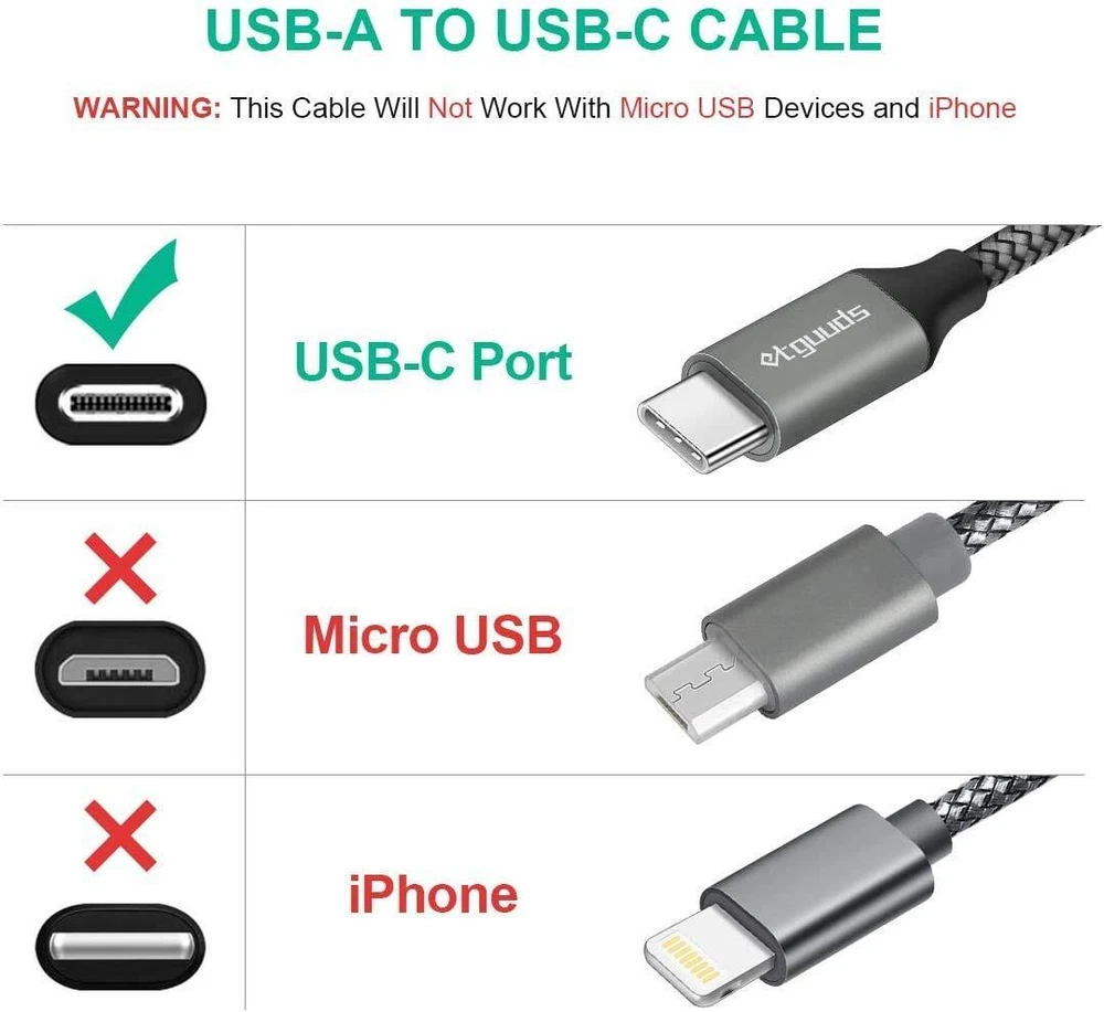 etguuds 16ft Extra Long USB C Cable, USB-A 2.0 to USB-C Cable, Fast Charging Type C Charger Cord Nylon Braided for Samsung Galaxy Note, LG, Moto, Pixel, Switch, and Other USB-C Device --Product Name: USB A to USB C Charging Cable -- Brand: etguuds -- Fast Charge: 5V/2.4A Max charging current -- Date transfer: USB 2.0, 480Mbps (40-60MB/S) -- Fast Charge Protocol: QC 3.0/ 2.0 -- Length:16ft (5M) --Color:Gray Fast Charging Warm Tips: 1.This cable CANNOT fast charge alone, recommended to use with fast charger adapter. 2.This is USB-A to USB-C cable, if your original cable is USB-C to USB-C cable, then Only USB-C to USB C cable can charging your device as fast as possible. 3.Some devices have their own private charge protocol, this cord DOESN'T support Full Speed Fast Charge, Only charge normally. Like Google Pixel (private protocol), iPad Pro (USB-C power adapter), Samsung Galaxy Note 10 (USB-C power adapter) 【16ft Extra Long and Convience】With etguuds 16ft(5m) long USB-A 2.0 to USB-C Cable, it's giant convenience! You can charge and use your Phone / Laptop / Game Controller at a distance freely, no matter at home or office, car or outdoor, you don't have to wait for charging, just enjoy your life! 【Fast Charging & Data Sync】etguuds USB A to USB C Cable support QC3.0/QC2.0 fast charge potocol. Standard 56kΩ pull-up resistor provides a safer charging. Transfers data can reach 480Mbps, transfering HD files in seconds, greatly helps your work efficiently. (please check more details on following Fast Charging Warm Tips) 【12X Resistant & Solid】Ultra Superior Nylon Braided jacket design is tangle flexible. Upgraded 3D aluminum connector and exclusive laser welding technology can ensure the metal part won't break. Which extend the cable life span by more than lasts 12X times. 【WIDELY COMPATIBILITY】:etguuds USB Type C cables fast charging for Samsung Galaxy S23 S23+ S23 Ultra 5G S22 S22+ S22 Ultra 5G S21 S21+ S21 Ultra S10 S10e S10+ 5G S9 S9+, Note 8 Note 9 Note10 Note10+ Plus 5G, A10e A20 A30 A40s A50 A60 A70 A80 M30s A9/9s A9 Star A8s(2018) A6s C9 C7Pro C5Pro. LGG5 G6 G7 V40 V35 ThinQ V30S V30 V20 Stylo 4 5. MotoG7/G7 Plus/ G7 Power/G6 /G6 Plus( NOT include G6 Play) , Pixel 4 5 5a 6 pro 7 7a. (Unable to achieve Fast Charging for ALL type c phones and devices). 【What You Get】 1 Pack 16ft USB-A to USB-C Cable. Don't hesitate to contact us if you have any questions. Shipping from the USA All of our products are shipped from the USA, ensuring quick delivery to your destination. Payment We offer the following payment methods: PayPal, credit card, bank transfer, and eBay's secure payment system. Free Shipping & Free Returns Shipping within the USA is FREE. Additionally, any return is absolutely free for you. Risk-Free Purchase You have the option to return an item within 30 days without any justification. We cover the return shipping costs! Fast Shipping We ship immediately upon receipt of payment. Generally, the package is delivered within 2-3 days in the USA. If it takes longer, we will contact you. Quality and Costs Made in Europe, USA, China No customs fees or additional charges Total satisfaction guarantee Invoice with declared VAT available upon request in .pdf format Feedback Your feedback is very important to us. After you pay for your purchase, you will automatically receive positive feedback from us.