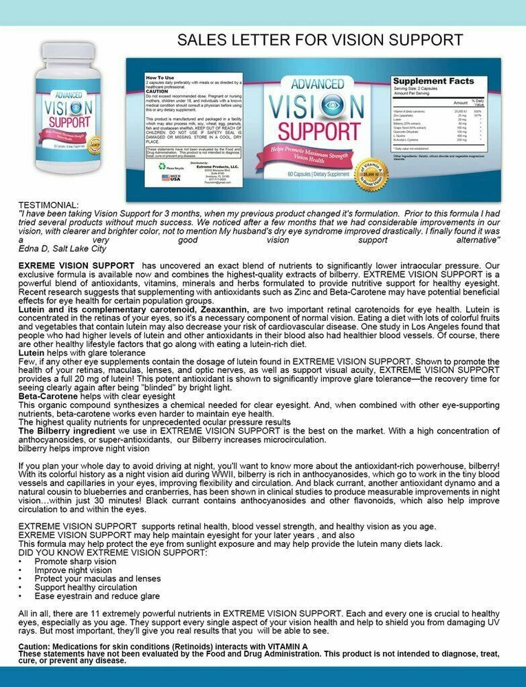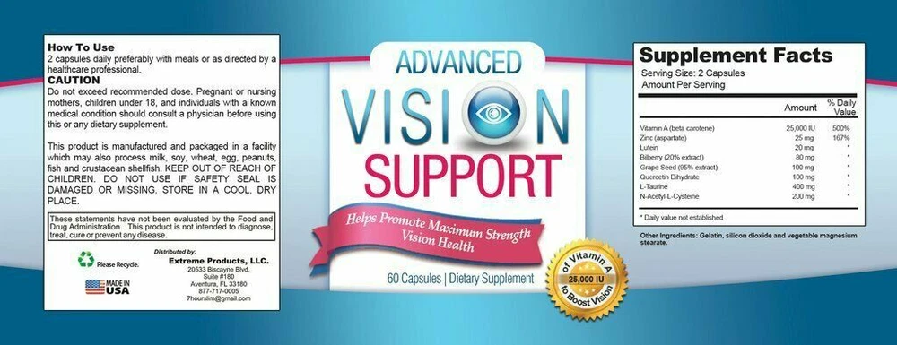 100% Natural Premium Quality Fast Shipping Extreme Vision Support Promote Eye Health Capsules Dietary Supplements Best Special ADVANCED VISION SUPPORT has uncovered an exact blend of nutrients to significantly lower intraocular pressure. Our exclusive formula is available now and combines the highest-quality extracts of bilberry. ADVANCED VISION SUPPORT is a powerful blend of antioxidants, vitamins, minerals and herbs formulated to provide nutritive support for healthy eyesight. Recent research suggests that supplementing with antioxidants such as Zinc and Beta-Carotene may have potential beneficial effects for eye health for certain population groups. Lutein and its complementary carotenoid, Zeaxanthin, are two important retinal carotenoids for eye health. Lutein is concentrated in the retinas of your eyes, so it's a necessary component of normal vision. Eating a diet with lots of colorful fruits and vegetables that contain lutein may also decrease your risk of cardiovascular disease. One study in Los Angeles found that people who had higher levels of lutein and other antioxidants in their blood also had healthier blood vessels. Of course, there are other healthy lifestyle factors that go along with eating a lutein-rich diet. Lutein helps with glare tolerance Few, if any other eye supplements contain the dosage of lutein found in ADVANCED VISION SUPPORT. Shown to promote the health of your retinas, maculas, lenses, and optic nerves, as well as support visual acuity, ADVANCED VISION SUPPORT provides a full 20 mg of lutein! This potent antioxidant is shown to significantly improve glare tolerance—the recovery time for seeing clearly again after being "blinded" by bright light. Beta-Carotene helps with clear eyesight This organic compound synthesizes a chemical needed for clear eyesight. And, when combined with other eye-supporting nutrients, beta-carotene works even harder to maintain eye health. The highest quality nutrients for unprecedented ocular pressure results The Bilberry ingredient we use in ADVANCED VISION SUPPORT is the best on the market. With a high concentration of anthocyanosides, or super-antioxidants, our Bilberry increases microcirculation. Bilberry helps improve night vision If you plan your whole day to avoid driving at night, you'll want to know more about the antioxidant-rich powerhouse, bilberry! With its colorful history as a night vision aid during WWII, bilberry is rich in anthocyanosides, which go to work in the tiny blood vessels and capillaries in your eyes, improving flexibility and circulation. Black currant, another antioxidant dynamo and a natural cousin to blueberries and cranberries, has been shown in clinical studies to produce measurable improvements in night vision…within just 30 minutes! Black currant contains anthocyanosides and other flavonoids, which also help improve circulation to and within the eyes. This formula may help protect the eye from sunlight exposure and may help provide the lutein many diets lack. Benefits: •Promote sharp vision •Improve night vision •Protect your maculas and lenses •Support healthy circulation •Ease eyestrain and reduce glare OFFER See our other items Payment Shipping We accept payment by any of the following methods: PayPal Please pay as soon as possible after winning an auction, as that will allow us to post your item to you sooner! We offer FREE standard shipping on all orders! Your order will be shipped within 1 working day of receiving payment (Monday-Friday) and you should expect to receive it in 1 to 5 business after initial shipment date if shipped with USPS First Class Mail. In the very unlikely event that your item is lost or damaged during shipping, then WE are responsible and will issue either a full refund or replacement. Returns If you are not 100% satisfied with your purchase, you can return the product and get a full refund or exchange the product for another one, be it similar or not. You can return a product for up to 30 days from the date you purchased it. Any product you return must be in the same condition you received it and in the original packaging. Please keep the receipt. 100% Natural Premium Quality Fast Shipping ADVANCED VISION SUPPORT has uncovered an exact blend of nutrients to significantly lower intraocular pressure. Our exclusive formula is available now and combines the highest-quality extracts of bilberry. ADVANCED VISION SUPPORT is a powerful blend of antioxidants, vitamins, minerals and herbs formulated to provide nutritive support for healthy eyesight. Recent research suggests that supplementing with antioxidants such as Zinc and Beta-Carotene may have potential beneficial effects for eye health for certain population groups. Lutein and its complementary carotenoid, Zeaxanthin, are two important retinal carotenoids for eye health. Lutein is concentrated in the retinas of your eyes, so it's a necessary component of normal vision. Eating a diet with lots of colorful fruits and vegetables that contain lutein may also decrease your risk of cardiovascular disease. One study in Los Angeles found that people who had higher levels of lutein and other antioxidants in their blood also had healthier blood vessels. Of course, there are other healthy lifestyle factors that go along with eating a lutein-rich diet. Lutein helps with glare tolerance Few, if any other eye supplements contain the dosage of lutein found in ADVANCED VISION SUPPORT. Shown to promote the health of your retinas, maculas, lenses, and optic nerves, as well as support visual acuity, ADVANCED VISION SUPPORT provides a full 20 mg of lutein! This potent antioxidant is shown to significantly improve glare tolerance—the recovery time for seeing clearly again after being "blinded" by bright light. Beta-Carotene helps with clear eyesight This organic compound synthesizes a chemical needed for clear eyesight. And, when combined with other eye-supporting nutrients, beta-carotene works even harder to maintain eye h