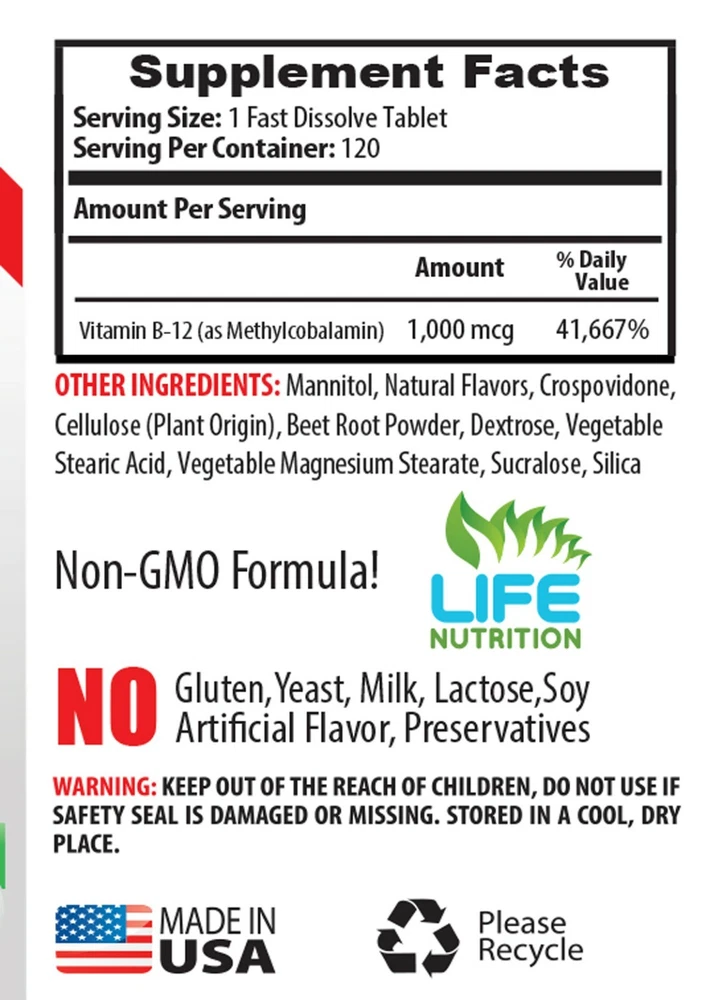 eye health formula - B-12 METHYLCOBALAMIN - bone health heart health 2 BOTTLE B-12 METHYLCOBALAMIN CAN SUPPORT BONE HEALTH CAN SUPPORT VISION CAN IMPROVE MOOD CAN BOOST BRAIN HEALTH CAN INCREASE ENERGY CAN SUPPORT THE HEART HEALTHY HAIR AND SKIN 2 BOTTLE = 240 TABLETS METHYLCOBALAMIN B-12: Are you struggling with constant fatigue, low energy levels, mood swings and a lack of mental clarity? This could be a warning sign that you are dealing with a vitamin B12 deficiency. If that is true — you’re one of many who do. About 40 percent of people have low levels of vitamin B12, which is an issue that needs to be addressed because this is an essential vitamin for the production of red blood cells and DNA, not to mention all the vitamin B12 benefits it provides. METHYLCOBALAMIN B-12 CAN SUPPORT BONE HEALTH: Maintaining adequate vitamin B12 levels can support your bone health and strength. One study in more than 2,500 adults showed that people with a lack of vitamin B12 also had lower than normal bone mineral density. Bones with decreased mineral density can become delicate and fragile over time, leading to an increased risk of osteoporosis. Other studies have also shown a link between low vitamin B12 levels and poor bone health and brittle bones, especially in women. Vitamin B12 may play a vital role in your bone health. Low blood levels of this vitamin have been associated with an increased risk of brittle bones. METHYLCOBALAMIN B-12 CAN SUPPORT VISION: Macular degeneration is an eye wasting that mainly affects your central vision. Maintaining adequate levels of vitamin B12 may help prevent the risk of age-related macular degeneration. Researchers believe that supplementing with vitamin B12 may lower homocysteine, a type of amino acid that is found in your bloodstream. Elevated homocysteine levels have been associated with an increased risk of age-related macular degeneration. A study involving 5,000 women aged 40 or older concluded that supplementation of vitamin B12 may reduce this risk. The group receiving these supplements for seven years had fewer cases of macular degeneration, compared to the placebo group. The risk of developing any form of the condition was 34% lower, while it was 41% lower for more severe types. METHYLCOBALAMIN B-12 CAN IMPROVE MOOD: Vitamin B12 can boost your mood. The effect of vitamin B12 on mood is not yet fully understood. However, this vitamin plays a vital role in synthesizing and metabolizing serotonin, a chemical responsible for regulating mood. Therefore, vitamin B12 deficiency may lead to decreased serotonin production, which may cause a depressed mood. Studies support the use of vitamin B12 supplements for improving symptoms of depression in people deficient in this vitamin. One study in people with depression and low vitamin B12 levels found that those who received both antidepressants and vitamin B12 were more likely to show improved depressive symptoms, compared to those supplemented with antidepressants alone. Another study discovered that vitamin B12 deficiency was associated with twice the risk of severe depression. Additionally, high vitamin B12 levels have been linked to better outcomes and an increased probability of recovery from major depressive disorder. Though vitamin B12 supplements may help improve mood and depression in people with a deficiency, research does not currently suggest that they have the same effect in those with normal B12 levels. METHYLCOBALAMIN B-12 CAN BOOST BRAIN HEALTH: Vitamin B12 deficiency has been associated with memory loss, especially for people in the elderly population. The vitamin may play a role in preventing brain atrophy, which is the loss of neurons and brain volume and often associated with memory loss. One study in people with early-stage memory loss showed that a combination of vitamin B12 and omega-3 fatty acid supplements slowed mental decline. Another study found that even vitamin B12 levels on the low side of normal can contribute to poor memory performance. As a result, supplementing with this vitamin may improve memory, even in the absence of a clinically diagnosed deficiency. More research is needed to make sound conclusions on the effect of vitamin B12 supplements on memory and cognitive function. METHYLCOBALAMIN B-12 CAN INCREASE ENERGY: One of the most notable vitamin B12 benefits is a boost in energy. So if you’re feeling sluggish and you’re not sure why, a lack of vitamin B12 may be to blame. This water-soluble vitamin aids in red blood cell formation, which promotes against a type of anemia that can often make people feel weak and tired, explained by Joy Bauer, MS, RDN, the nutrition expert for NBC’s TODAY show and author of From Junk Food to Joy Food. Get your mojo back by asking your doctor to check your B12 levels. If they are on the low side, it’s time to up your intake. Vitamin B12 is found naturally in a wide variety of animal foods like fish, meat, poultry, eggs, milk, and other dairy products, plus fortified foods like breakfast cereals, nutritional yeast, and some plant-based milk such as almond milk. METHYLCOBALAMIN B-12 CAN SUPPORT THE HEART: Vitamin B12’s role in promoting heart health may get overlooked, but it is essential, says Liz Weinandy, RD, a dietician at the Ohio State University Wexner Medical Center in Columbus, Ohio. Vitamin B12, B6, and folic acid work together help to reduce homocysteine, which is a protein that can build up in blood and damage arterial walls, thus playing a role in poor heart conditions. When B12 is low, it can’t do its job effectively, which means your heart is at risk. Vitamin B12 benefits cardiovascular health in several ways, which is important considering the fact that poor heart conditons are very common worldwide. Vitamin B12 helps reduce elevated homocysteine levels, which is now considered a major risk factor for heart conditions. Homocysteine is an amino acid, and its levels in the blood are influenced by blood levels of B-com