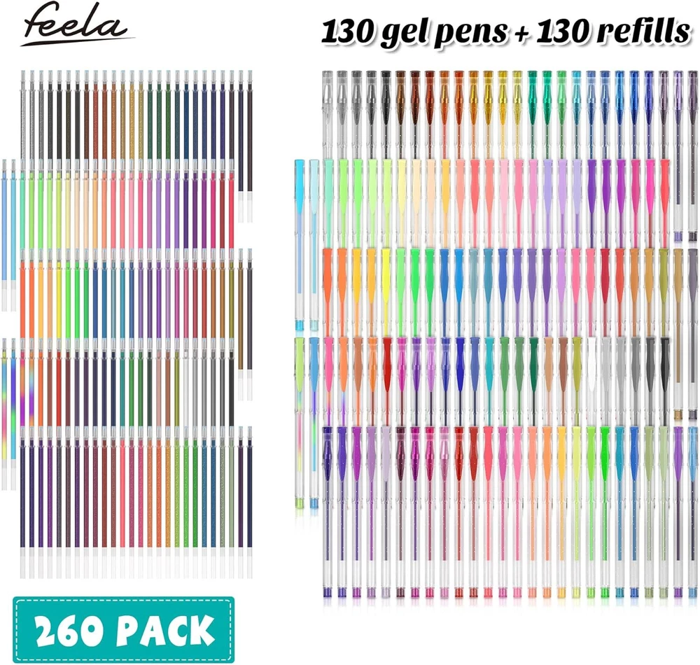 feela Gel Pens Set, 260 Pack 130 Colored 130 Colors With 130 Refills Product Details Product Dimensions: 12.28 x 6.69 x 3.5 inches Item model number: FAGP-260 Is Discontinued By Manufacturer: No Item Weight: 2.6 pounds Manufacturer: Feela Brand: feela Writing Instrument Form: Marker Pen Color: 130 Colors With 130 Refills Ink Color: Pastel Age Range (Description): Kid 260 super valued feela gel pens pack includes 130 unique gel pen and 130 refills. Color assortment: Glitter, Neon Glitter, Neon, Metallic, Pastel, Swirl, and Standard. Suit for children and adult, great for coloring, doodling, drawing and sketching. With Color box packing, eco friendly and delicate. Tip size: 0.6-1.0mm. Super smooth writing and long lasting. Acid-free and non-toxic, conforms to ASTM D-4236. Performance&Satisfaction: We provide you with not only our high quality products but also our quick response service.