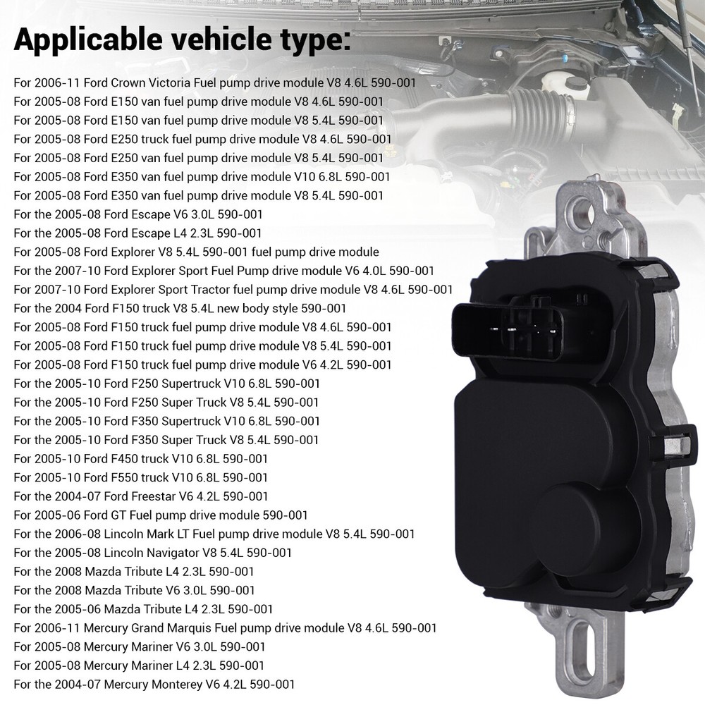 Fuel Pump Driver Control Module 590-001 For Ford F150 4.6L 5.4L 4.2L V8 FD1002 Feature: Material: Aluminum Lining pin: 4pin+2pin OE:590-001,FD1002,4C2A-9D372-BA,4C2A-9D372-BB,4C2A-9D372-BC,4C2A-9D372-BD,4C2A-9D372-CA,4C2Z-9D372-BA 4L34-9D370-AA,5L8A-9D370-AA,6C2A-9D372-AA,6L1A-9D372-AD,6R3A-9D372-BA,6R3Z-9D372-BA,6W7A-9D372-CA ZZC0-18-940,590001,4C2Z9D372BA,4C2A9D372CA,4C2A9D372BD,4L3Z9D370A,5L8Z9D370A 6C2A9D372AA,6C2Z9D372A,6H1470,6L1Z9D372AD,6W7Z9D372CA,ZZC018940 Applicable vehicle type: For 2006-11 Ford Crown Victoria Fuel pump drive module V8 4.6L 590-001 For 2005-08 Ford E150 van fuel pump drive module V8 4.6L 590-001 For 2005-08 Ford E150 van fuel pump drive module V8 5.4L 590-001 For 2005-08 Ford E250 truck fuel pump drive module V8 4.6L 590-001 For 2005-08 Ford E250 van fuel pump drive module V8 5.4L 590-001 For 2005-08 Ford E350 van fuel pump drive module V10 6.8L 590-001 For 2005-08 Ford E350 van fuel pump drive module V8 5.4L 590-001 For the 2005-08 Ford Escape V6 3.0L 590-001 For the 2005-08 Ford Escape L4 2.3L 590-001 For 2005-08 Ford Explorer V8 5.4L 590-001 fuel pump drive module For the 2007-10 Ford Explorer Sport Fuel Pump drive module V6 4.0L 590-001 For 2007-10 Ford Explorer Sport Tractor fuel pump drive module V8 4.6L 590-001 For the 2004 Ford F150 truck V8 5.4L new body style 590-001 For 2005-08 Ford F150 truck fuel pump drive module V8 4.6L 590-001 For 2005-08 Ford F150 truck fuel pump drive module V8 5.4L 590-001 For 2005-08 Ford F150 truck fuel pump drive module V6 4.2L 590-001 For the 2005-10 Ford F250 Supertruck V10 6.8L 590-001 For the 2005-10 Ford F250 Super Truck V8 5.4L 590-001 For the 2005-10 Ford F350 Supertruck V10 6.8L 590-001 For the 2005-10 Ford F350 Super Truck V8 5.4L 590-001 For 2005-10 Ford F450 truck V10 6.8L 590-001 For 2005-10 Ford F550 truck V10 6.8L 590-001 For the 2004-07 Ford Freestar V6 4.2L 590-001 For 2005-06 Ford GT Fuel pump drive module 590-001 For the 2006-08 Lincoln Mark LT Fuel pump drive module V8 5.4L 590-001 For the 2005-08 Lincoln Navigator V8 5.4L 590-001 For the 2008 Mazda Tribute L4 2.3L 590-001 For the 2008 Mazda Tribute V6 3.0L 590-001 For the 2005-06 Mazda Tribute L4 2.3L 590-001 For 2006-11 Mercury Grand Marquis Fuel pump drive module V8 4.6L 590-001 For 2005-08 Mercury Mariner V6 3.0L 590-001 For 2005-08 Mercury Mariner L4 2.3L 590-001 For the 2004-07 Mercury Monterey V6 4.2L 590-001 Package Include: 1 X Fuel pump control module 8 X Washer washer 4 X Screw rod 2 X Nut cap 2 X Black pipe Shipping Payment Return and Refund Policy Feedback Help - Customer Support - Contac Shipping FREE SAME BUSINESS DAY MONDAY- FRIDAY SHIPPING FROM USA. No shipping on Weekends or US Public Holidays. No responsibility for any custom duty We will ship your order to your PayPal Verified address provided. Please verify your address and make sure that it is your current address before making your payment. Any address change requests after your payment CANNOT be guaranteed. Shipping information will be updated when available. All of our products can be shipped internationally. To confirm the shipping rates to your country please refer to eBay's Shipping Tab above. Any brokerage, customs, and duty fees associated with international shipments are the customer's responsibility and are not included in our shipping fee. A phone number is required for the customs documents. Failure to provide one will result in delays. We do not include an invoice or any advertising materials with our shipments. Payment Immediate payment is required. Shipping will be arranged within 1 business day once payment is cleared. To uphold a shipping speed, your order will be processed almost immediately. If you change your mind after your payment is confirmed, we will do our best to cancel the order, however, we CANNOT guarantee the cancellation. Return and Refund Policy 1. We stand behind our items and offer 30 days warranty . All items are in new and working condition unless specified otherwise elsewhere in the description. 2. All Returns - defective or otherwise - MUST BE PREAUTHORIZED to guarantee refund or exchange. Please contact us to get an authorization and return address. 3. Buyer agrees to pay for the cost of re-shipment for undeliverable or wrong addresses. 4. Buyer is responsible for Return Postage as well as a 20% restocking fee if return/replacement is not a result of our mistake such as wrong item. 5. Replacement or Refund will be made upon receipt of the returned item. Please include tracking number so we can process ASAP. If you do not wish to wait for a replacement, please repurchase the item. 6. ALL REFUNDS will be processed via PayPal. Please double check via PayPal history and transaction for confirmation. PayPal will send it back to whatever you used to pay within 3-5 days. Feedback We strive to provide the best products and services. Your positive feedback 5 stars DSR help us do better. If anything about your transaction did not meet expectations, please CONTACT US and give us the opportunity to make things right. We are always here to help. Help - Customer Support - Contac Please do not hesitate to CONTACT US . You can message 24/7 on eBay for all questions and inquiries. We will get back to you within 1-2 business days at the latest.
