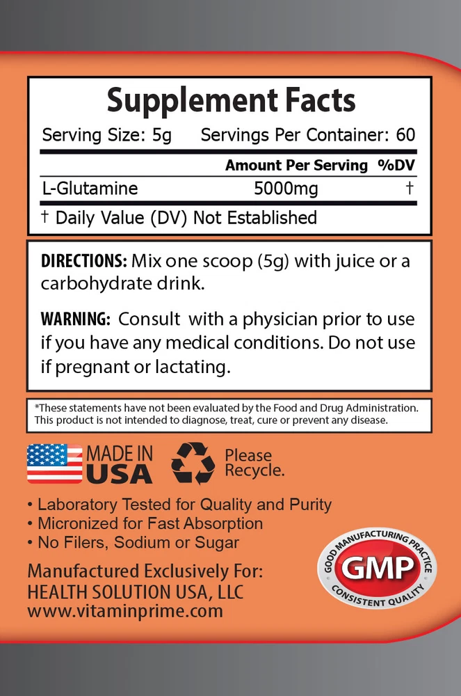 Glutamine Powder 5000mg 100% Pure Free Form Amino Acid Improves Stamina & Endurance Increases Nitrogen in the Body Improves Blood Flow Pre & Post Workout -Made in the United States- ( 1 Bottle, 300 Grams, 60 Servings ) What is Glutamine? Glutamine is one of 20 naturally occurring amino acids in dietary protein. In fact, L-glutamine is the most abundant amino acid in the bloodstream and makes up 30-35 percent of the amino acid nitrogen in your blood. The majority of people don't get enough L-glutamine from their food alone. That's why supplementing your diet with L-glutamine is an excellent way to boost your immune system and improve your ability to fight infection and diseases. Promotes Muscle Growth. Whether your goal is to increase athletic performance, boost metabolism, improve recovery or even build muscle, research shows that L-glutamine can significantly aid your efforts. During an intense workout, your body becomes stressed and your muscles and tendons require more glutamine than the amount supplied by a normal diet. So, after an intense workout, the levels of cellular glutamine can drop by 50 percent and plasma levels by 30 percent! This muscle-wasting state is a gateway for the body to use your muscle for energy rather than carbohydrates. But glutamine can prevent this from happening. Improves Athletic Performance and Recovery. One of L-glutamine's main roles in the body is to support detoxification by cleansing the body from high levels of ammonia. It acts as a buffer and converts excess ammonia into other amino acids, amino sugars and urea. Doing approximately one hour of exercise can cause a 40 percent reduction of glutamine in the body. It can also cause suppressed immune function. This has a negative impact on your resistance training and may lead to overtraining syndrome. Improves Gastrointestinal Health. L-glutamine benefits your health if you have any type of digestive issue, such as irritable bowel syndrome Because it's a vital nutrient for the intestines to rebuild and repair, you need this amino acid in your diet on a regular basis. Supplement Facts: Serving Size: 5g Servings per Container: 60 L-Glutamine - 5,000 mg * Directions: Mix one scoop(5g) with juice or a carbohydrate drink. WARNING: Consult with physician prior to use if you have any medical conditions. Do not use if pregnant or lactating. *These statements have not been evaluated by the Food and Drug Administration. This product is not intended to diagnose, , treat, or prevent any disease. PREMIUM QUALITY PRODUCT