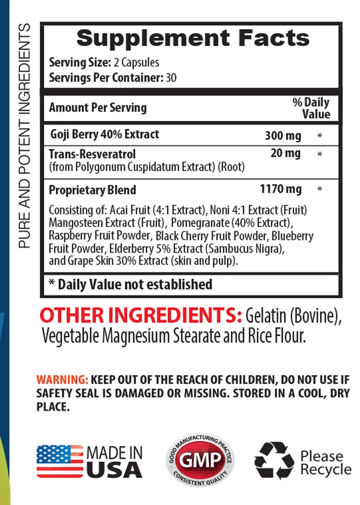 Goji Berry Extract -Made in the United States- (1 Bottle, 60 Capsules) What are Goji Berries? Goji berries, scientifically known as Lycium barbarum, are also known as wolfberries, fructus lycii and gougizi. Goji berries have gained popularity in recent years, often promoted as a "superfood." They're thought to help prevent premature aging, boost the immune system, have benefits for diabetes and protect against heart disease. All dark blue or red berries, including goji berries, contain high levels of antioxidants, which may help protect the body against damage from free radicals. What's unique about goji berries is that they contain specific antioxidants called Lycium barbarum polysaccharides, which are thought to provide a variety of impressive health benefits. Anti Aging. Goji berries have been reported to have anti-aging properties, particularly one of the primary properties sought out for in Traditional Chinese Medicine. The high content of carotenoids and polyphenols, two potent antioxidants, have been suggested to combat against oxidants, ultimately inhibiting cell death that likely contributes to accelerated aging. Its vitamin C content also has a key role in defying the aging process, primarily attributed to its antioxidant properties and production of collagen. Muscle Stimulating. Though a large protein supply comes from animal-based sources, goji berries offer not only serves as a plant-based protein, but 18 amino acids. Protein plays an imperative role in muscle maintenance and gain, subsequently persevering lean muscle mass and strength. Eye Protecting. Goji berries contain zeaxanthin, a carotenoid shown to protect eyes from harmful high-energy light, including ultraviolet rays from the sun. Regular consumption of the berry has further shown to lessen the risk of age-related macular degeneration, the primary cause of vision loss in the elderly. The rich vitamin C content goji berries supplies may also reduce the risk of cataracts, or the clouding of the eye's lens. Regulate Blood Pressure Levels. The polysaccharides in the berries can be credited to their anti-hypertensive properties. In fact, these berries have been used in traditional Chinese medicine to regulate blood pressure levels. As per a Chinese study, the polysaccharides in the berries can help lower blood pressure levels and prevent related diseases. Supplement Facts: Serving Size: 2 Capsules Servings per Container: 30 Goji Berry 40% Extract - 300mg Trans-Resveratrol - 20mg Proprietary Blend - 1170mg Consisting of: Acai Fruit, Noni Extract, Mangosteen Extract, Pomegranate, Raspberry Fruit Powder, Black Cherry Fruit Powder, Blueberry Fruit Powder, Elderberry Extract, and Grape Skin Extract. OTHER INGREDIENTS: Gelatin(Bovine), Vegetable Magnesium Stearate, and Rice Flour. WARNING: KEEP OUT OF REACH OF CHILDREN. DO NOT USE IF SAFETY SEAL IS DAMAGED OR MISSING. STORE IN A COOL, DRY PLACE. *These statements have not been evaluated by the FDA. This product is not intended to diagnose, cure, treat, or prevent any disease. GREAT QUALITY PRODUCT