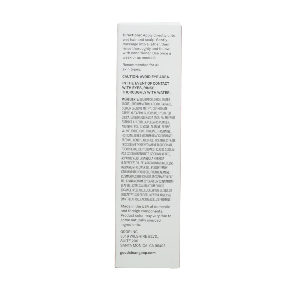 good.clean.goop beauty The Powerscrub Scalp Detox Shampoo with Acai Berry - 4oz. Meet our good.clean.goop beauty Powerscrub Scalp Detox Transform and tame your hair with this detoxifying shampoo. The two-in-one clarifying treatment is both a purifying shampoo and a detoxifying European salt scrub infused with vitamin E. Naturally scented with a proprietary essential oil blend and with a deep-green color (from chlorella), the exfoliating shampoo sweeps away dead skin cells, product buildup, and excess oil, leaving hair clean, shiny, and refreshed in a single step. The Good 3: The Cleanical: Amino Acid Complex A blend of 10 amino acids helps strengthen and restore moisture to hair. The Botanical: Chlorella Extract This nourishes scalp and hair with a powerful dose of amino acids, beta-carotene, and vitamins. The Superfood: Acai Fruit Extract This natural shampoo is a great source of antioxidants and fatty acids, it nourishes scalp and hair. How to Apply: Apply the scalp scrub shampoo directly onto wet hair and scalp. Gently massage into a lather, then rinse thoroughly and follow with conditioner. Use once a week or as needed. Features Clarifying Treatment: Transform and tame your hair with this shampoo. The two-in-one clarifying treatment is both a purifying shampoo and a detoxifying European salt scrub infused with Vitamin E. Sulfate Free Shampoo: This scalp exfoliator shampoo utilizes a blend of 10 amino acids to help strengthen and restore moisture to hair. Chlorella extract helps nourish the scalp and hair with beta-carotene, and vitamins. Scalp Detox for Buildup: Naturally scented with a proprietary essential oil blend, the exfoliating shampoo sweeps away dead skin cells, product buildup, and excess oil, leaving hair clean, shiny, and refreshed in a single step. How to use: Apply the scalp treatment directly onto wet hair and scalp. Gently massage into a lather, then rinse thoroughly and follow with conditioner. Use once a week or as needed. Vegan Shampoo: This scalp scrub does not use synthetic fragrance, is dermatologist tested, and is cruelty-free and vegan. This product is recommended for all skin types. Details Product Dimensions: x x inches Item Weight: 0.33 pounds Shipping Weight: 0.33 pounds Manufacturer: goop Fast & Free Shipping Orders are shipped out within 2-3 business days usually and delivered to your doorstep as quickly as possible. Competitive Pricing Our competitive prices are some of the lowest that you will find on the internet. Rest assured that you're getting a good deal when purchasing from us. 30-day Money Back Guarantee We are committed to making sure that you leave this transaction satisfied. If you're unhappy with the product for any reason, you may return it back for your money-back or a replacement if available within 30 days.