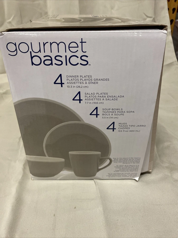 This 16-piece set of gourmet basics is perfect for any kitchen. The set includes four plates, four salad plates, soup bowls, and four mugs, all made of high-quality ceramic material. With this set, you'll be able to enjoy your meals in style and comfort. The elegant design of the plates and bowls will impress your guests, and the durable ceramic material ensures that they'll last for years to come. Whether you're hosting a dinner party or just enjoying a casual meal with your family, this set is sure to impress. SKU: w7 DATE: 8/26/24 LISTED BY: TH, SK, TM CONDITION: Open Box With Box Damgage SIZE/SHADE: 16 PCS / White