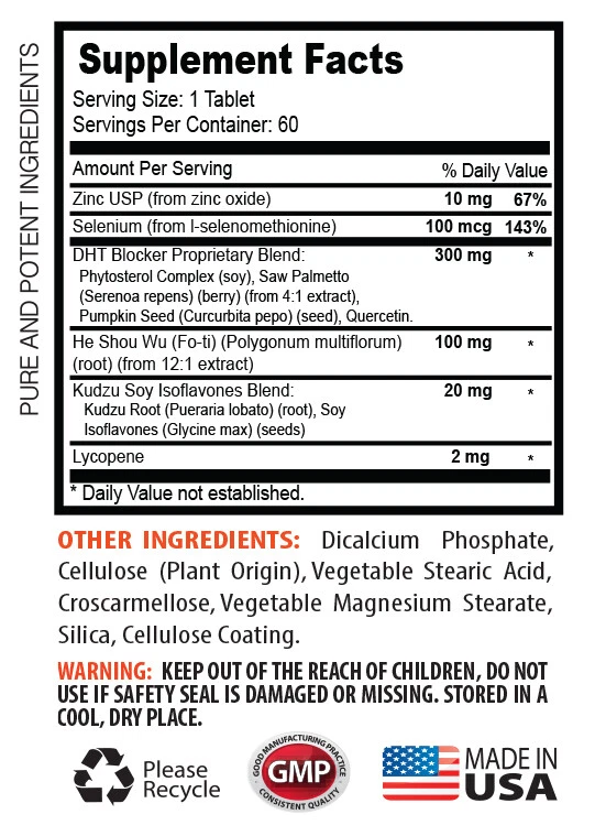 hair grow up fast - DHT BLOCKER HAIR COMPLEX - selenium bulk 2B DHT BLOCKER HAIR COMPLEX HAIR GROWTH PROMOTER ANTI-AGING SUPPORT LYCOPENE SUPPORT PUMPKIN SEEDS ZINC SUPPORT KUDZU SOY HE SHOU WU 2 BOTTLE = 120 TABLETS DHT BLOCKER FORMULA: This powerful product has ingredients within that will work to slow, stop and most likely reverse hair loss. As men age they may experience hair loss on the scalp and maybe even hair growth elsewhere where it is not wanted. As they age the body starts to produce more DHT which can thin hair ultimately causing baldness. DHT blocker hair complex is the product for you if you have experienced any of these hair problems. DHT BLOCKER BOOSTS HAIR GROWTH WITH LYCOPENE: Men who suffer hair loss are linked to possessing an excess amount of the compound dihydrotestosterone or DHT in their systems. A good daily intake of lycopene rich foods can help the man reduce excess DHT from the system, slow down and eventually reverse the process of hair loss and male pattern balding. DHT BLOCKER HAIR GROWTH PROMOTER: Zinc plays an integral role in hair tissue growth and repair. It also helps keep the oil glands around the follicles functioning properly. Hair loss is mostly a common symptom of zinc deficiency. The mineral zinc can improve hair growth best in people who are deficient in it. Good food sources include oysters, beef and pumpkin seeds. A study found that saw palmetto, taken over a five-month period, to "improve" participant's hair loss conditions is effective in supporting fuller hair growth especially when confronting hairloss in the early stages. DHT BLOCKER CONTAINS PUMPKIN SEEDS: Raw pumpkin seeds are a high protein and mineral packed food that have benefits for hair loss prevention and protecting men against prostate problems. Pumpkin seeds contain high levels of phytosterols, including the much studied beta-sitosterol. Beta-sitosterol has been shown to block the conversion of testosterone to dihydrotestosterone by inhibiting the enzyme 5-alpha-reductase. DHT BLOCKER PROMOTES ANTI AGING: Like many ingredients found in this powerful formula, He Shou Wu and saw palmetto have anti-aging properties that will make you notice a younger self after taking the supplement a couple days to weeks. Many of these ingredients will make you feel younger due to more energy, fuller hair and natural ingredients. Each person has a different timing for when they feel or see any benefits - therefore, following the dosage instructions postmeal will make it effective. OUR DHT BLOCKER FORMULA SUPPORTS WITH ZINC: To understand the link between zinc and hair growth, you should first know the connection between deficiency in zinc and hair loss. Some experts believe that zinc deficiency actually can lead to deterioration of the protein structure that makes up the hair follicle. This weakening of follicles can in turn cause hair shedding and hair loss. Usually when people have zinc deficiency they will suffer cold like symptoms which is a warning from your body before the symptoms become more serious. DHT BLOCKER NATURAL FORMULA PROVIDES KUDZU SOY: Isoflavones have hair restoration uses. Because of their slight estrogenic effect, isoflavones from sources such as soy have been studied as a remedy for hair loss. Like soy, kudzu contains significant amounts of the isoflavone daidzein, daidzin and genistein. However, kudzu also contains an isoflavone called puerarin, which is not found in soy. Furthermore, Pueraria thomsonii flowers contain both soyasapones (one of the main components of soy beans) and kaikasaponins (not found in soy), making it rather unique. OUR DHT BLOCKER FORMULA CONTAINS POWERFUL HE SHOU WU: He shou wu, also known as fo-ti or scientifically as Polygonum multiflorum, is an herb from Asia. In short, he shou wu is rich in antioxidants. Though most remarkably, studies show strongest of all that he shou wu appears to transition hair follicles from damaged, dormant stages into rejuvenated, fast-growing ones that better resemble hair growth patterns in the young. CAUTION: Do not exceed recommended dose. Pregnant or nursing mothers, children under the age of 18, and individuals with a known medical condition should consult a physician before using this or any dietary supplement. These statements have not been evaluated by the Food and Drug Administration. This product is not intended to diagnose, treat, cure, or prevent any disease. GREAT QUALITY PRODUCT