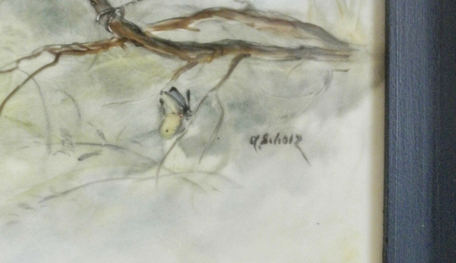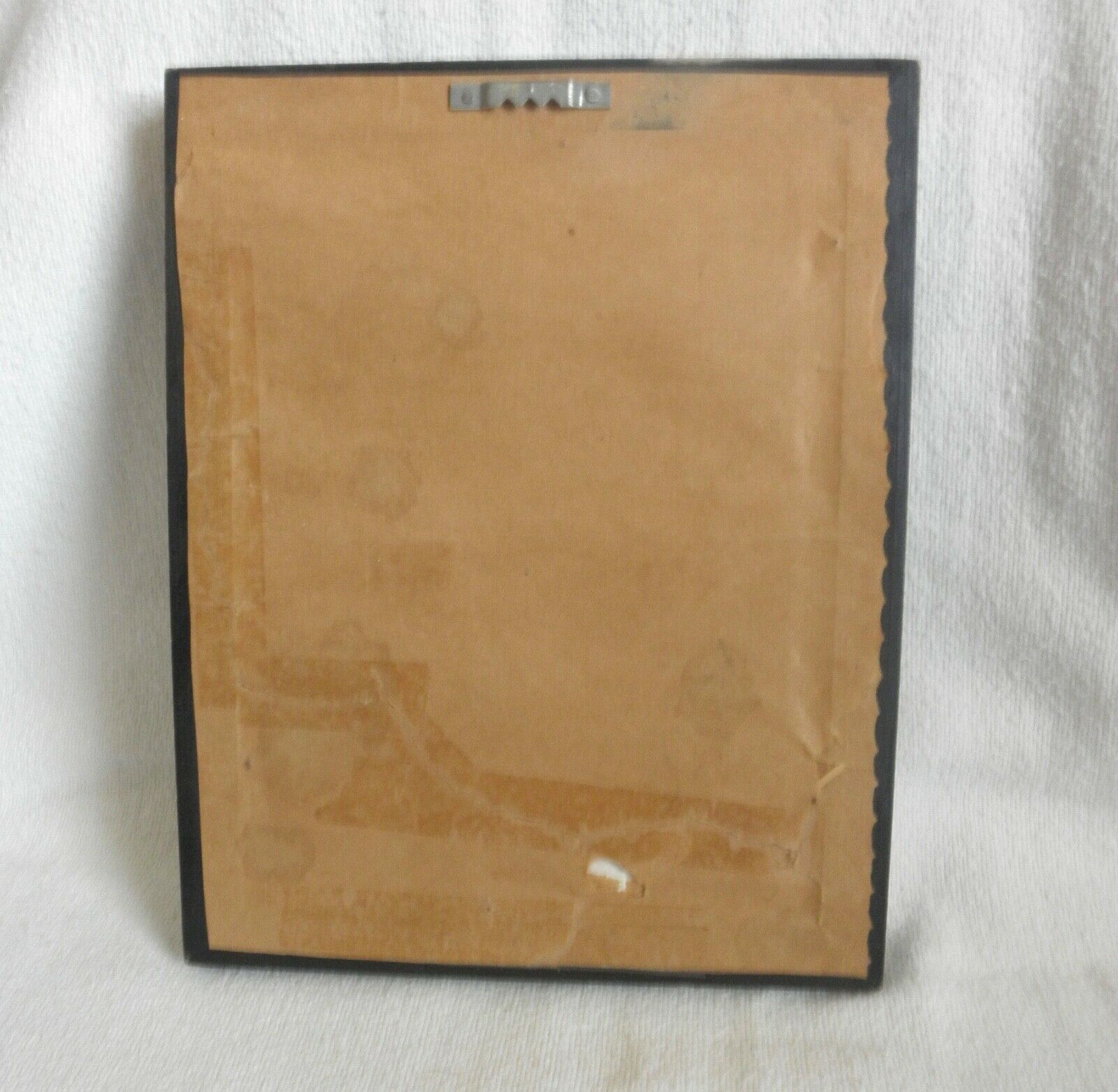 The frame measures 9 and 3/8 X 7 and 1/2 inches. The plaque measures 8 X 6 inches. It is signed lower right. no chips cracks or brakes, frame has a couple of nicks.