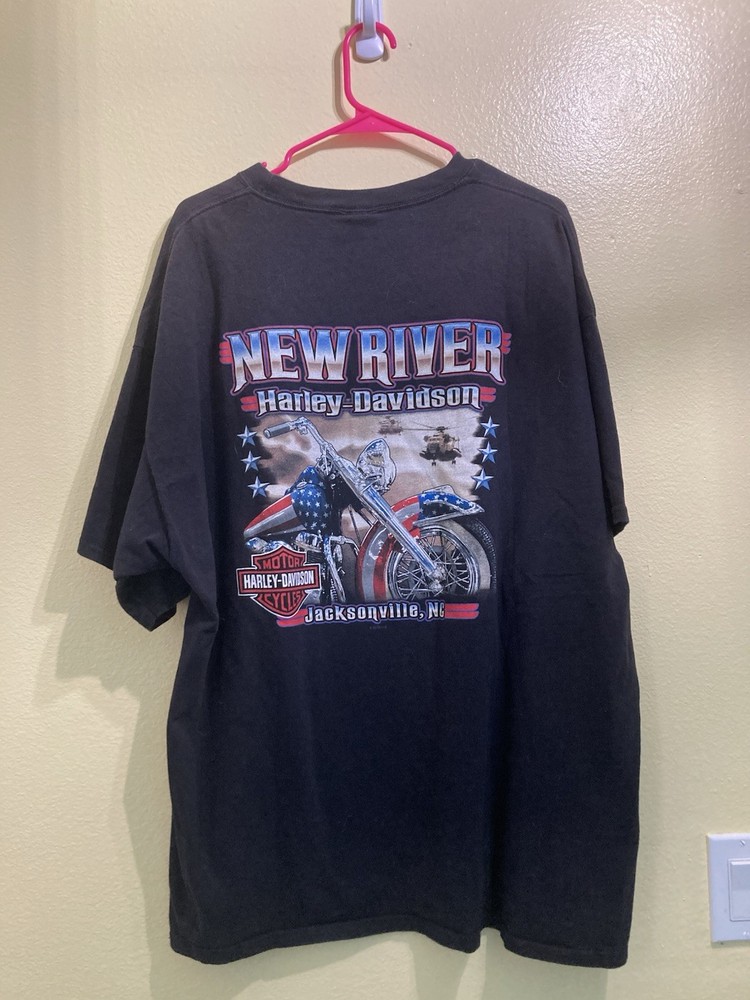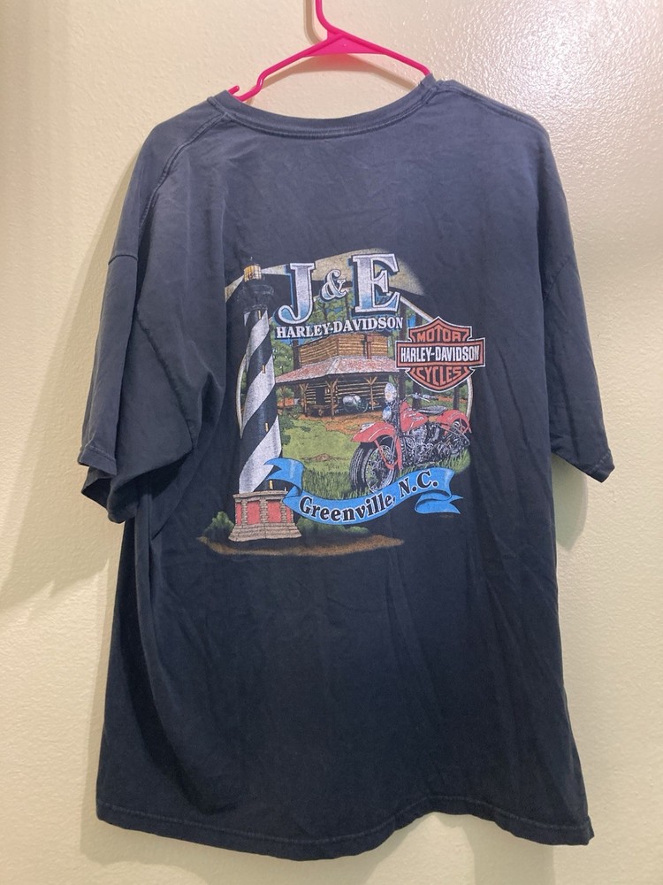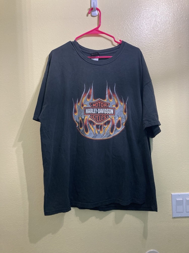 This product is a set of two vintage Harley Davidson men's t-shirts in size 2XL. Made from black cotton with a crew neck and short sleeves, these regular fit shirts feature a motorcycle theme on both sides. Machine washable and perfect for the summer and spring seasons, these classic t-shirts are a must-have for any Harley Davidson fan looking to add some biker style to their wardrobe.