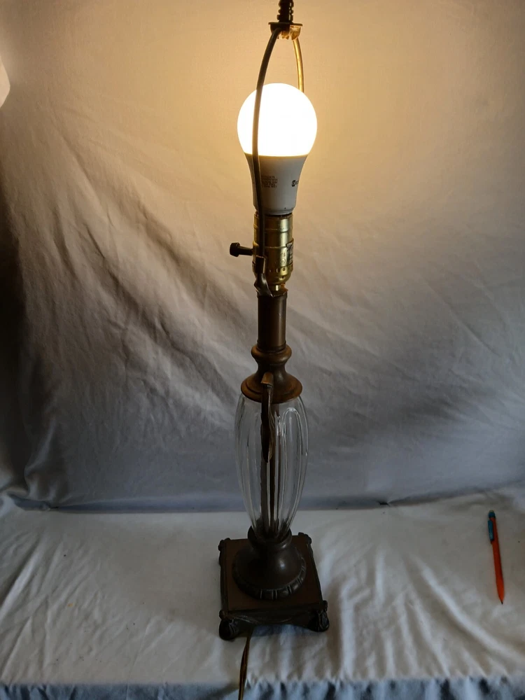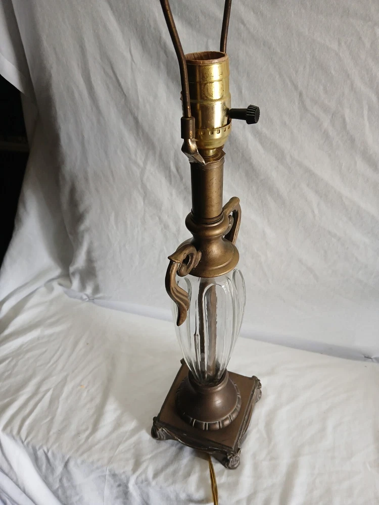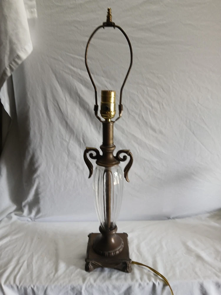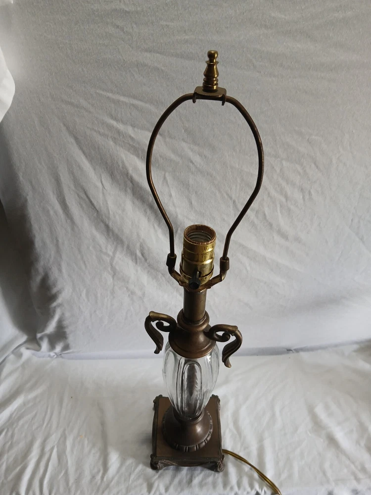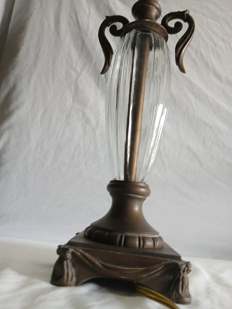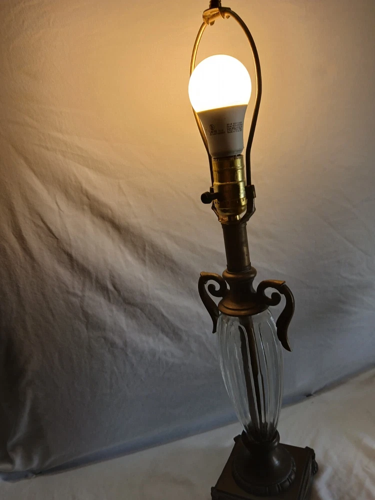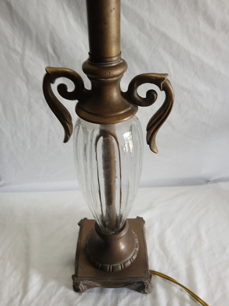 This Hollywood Regency table lamp is a vintage piece from the 1970s, featuring an Empire design in antique brass finish. Measuring 4¾ inches in length, 4¾ inches in width, and 17½ inches in height, this medium-sized lamp has a corded electric power source and uses a rotary knob for control. Made of brass and glass materials, this lamp exudes a classic and elegant Hollywood Regency style.