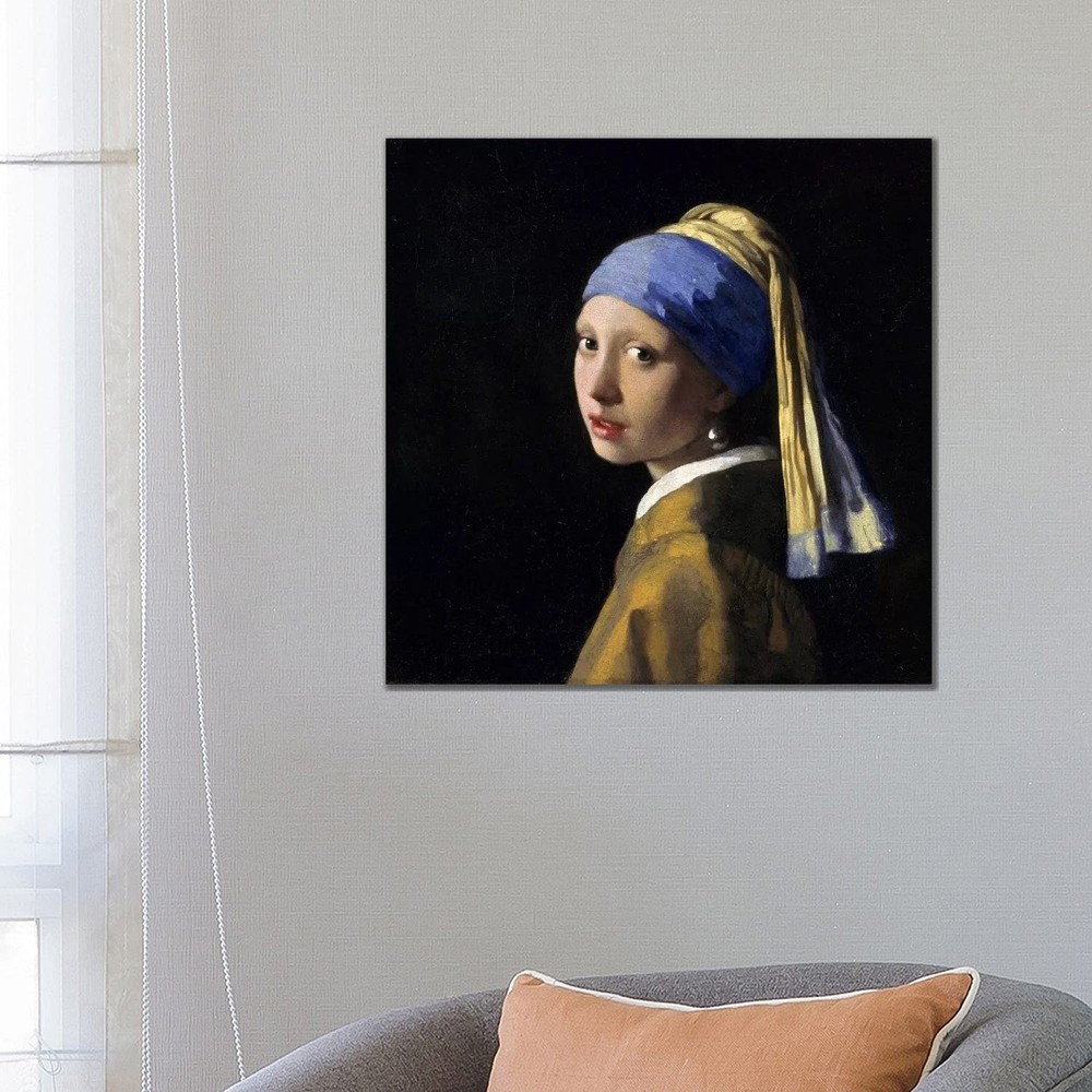 The artwork is crafted with 100-percent cotton artist-grade canvas, professionally hand-stretched and stapled over pine-wood bars in gallery wrap style - a method utilized by artists to present artwork in galleries. Fade-resistant archival inks guarantee perfect color reproduction that remains vibrant for decades even when exposed to strong light. Add brilliance in color and exceptional detail to your space with the contemporary and uncompromising style of iCanvasARTART. Artist: Johannes VermeerTitle: Girl with a Pearl Earring by Johannes VermeerProduct type: Gallery wrapped canvas art Format: SquareSize: MediumSubject: ContemporaryDimensions: 26 inches high x 26 inches wide x 1.5-inch deep Free Shipping Over $49.99* Details iCanvas "Girl with a Cultured Pearl Earring" by Johannes Vermeer Canvas Print Product Description: The artwork is crafted with 100-percent cotton artist-grade canvas, professionally hand-stretched and stapled over pine-wood bars in gallery wrap style - a method utilized by artists to present artwork in galleries. Fade-resistant archival inks guarantee perfect color reproduction that remains vibrant for decades even when exposed to strong light. Add brilliance in color and exceptional detail to your space with the contemporary and uncompromising style of iCanvasARTART. ArtistJohannes Vermeer TitleGirl with a Cultured Pearl Earring by Johannes Vermeer Product typeGallery wrapped canvas art FormatSquare SizeMedium SubjectContemporary Dimensions26 inches high x 26 inches wide x 1.5-inch deep