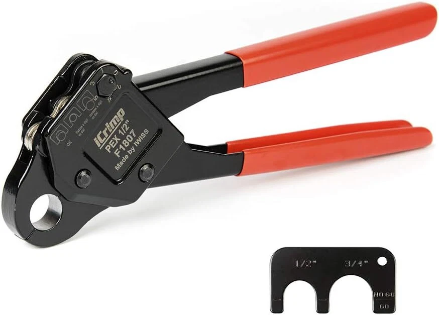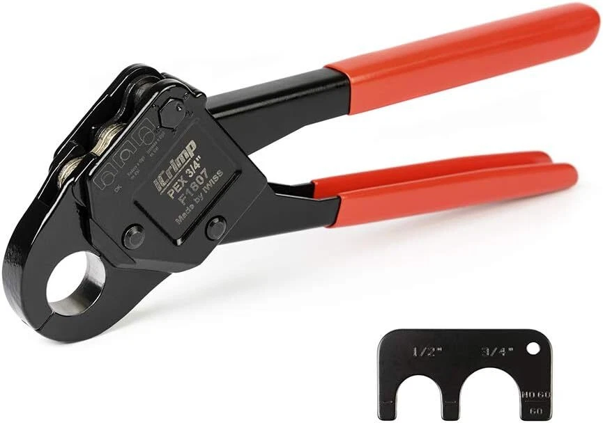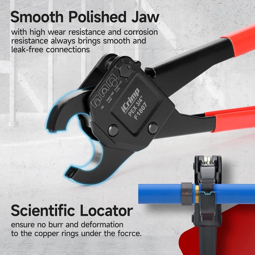 Product Description Previous page meets ASTM F1807 ANGLED PEX CRIMPER Constructed of durable carbon steel to ensure an integrated mechanical property Handy&Sturdy PEX CUTTER Spring-loaded handle brings smooth and clean cuts, like cutting butter Secure Connection GO/NO-GO GAUGE For the accuracy of the PEX crimper, ensure the fittngs and tubes has been crimped properly. Stronger Biting Force GROOVE JOINT PLIERS Pre-crimped copper ring to prevent slippingstronger, long time use without deformation Next page 1 ANGLED PEX CRIMPER 2 PEX CUTTER 3 GO/NO-GO GAUGE 4 GROOVE JOINT PLIERS WHY CHOOSE US UNIQUE ANGLED HEAD DESIGN permits good accessibility in confined space or at heights WELL POLISHED JAWS makes sure no burr and create leaking-free connection. CALIBRATION SUPPORTED factory-adjusted, only requires calibration if crimp fails to pass the gauge. SCIENTIFIC LOCATOR ensures no damage for copper rings during crimping.