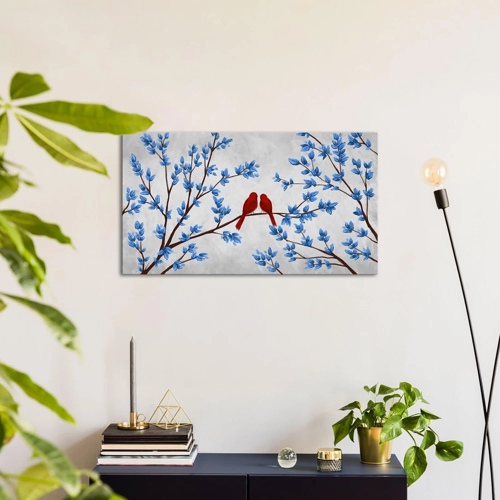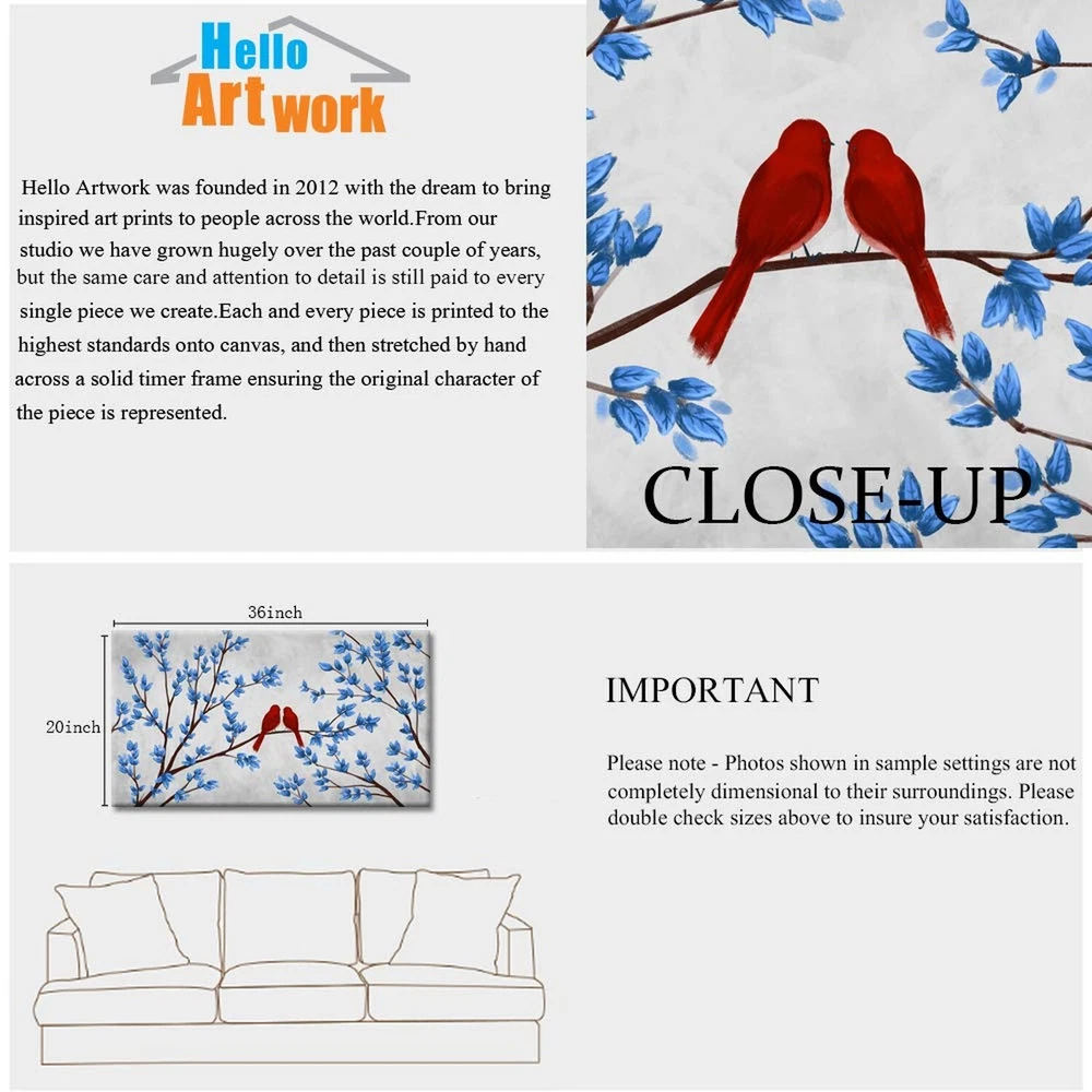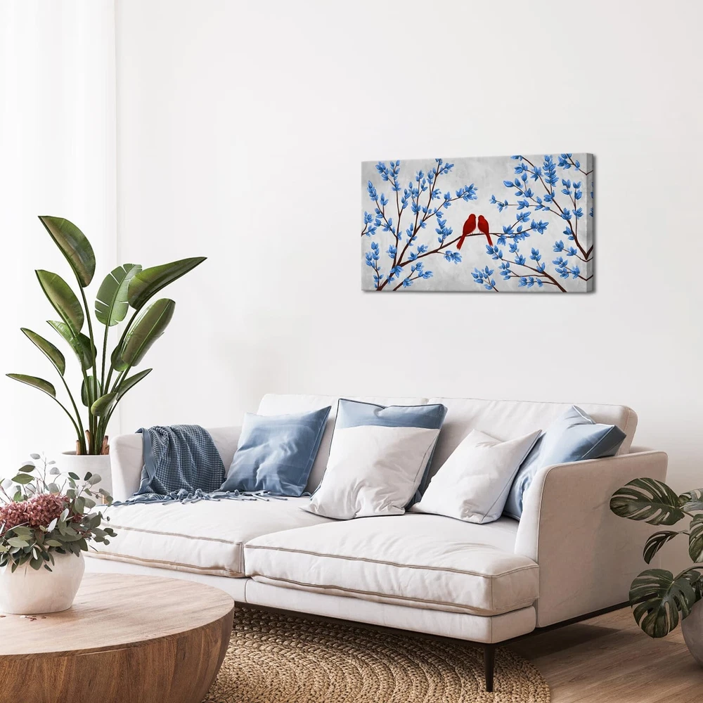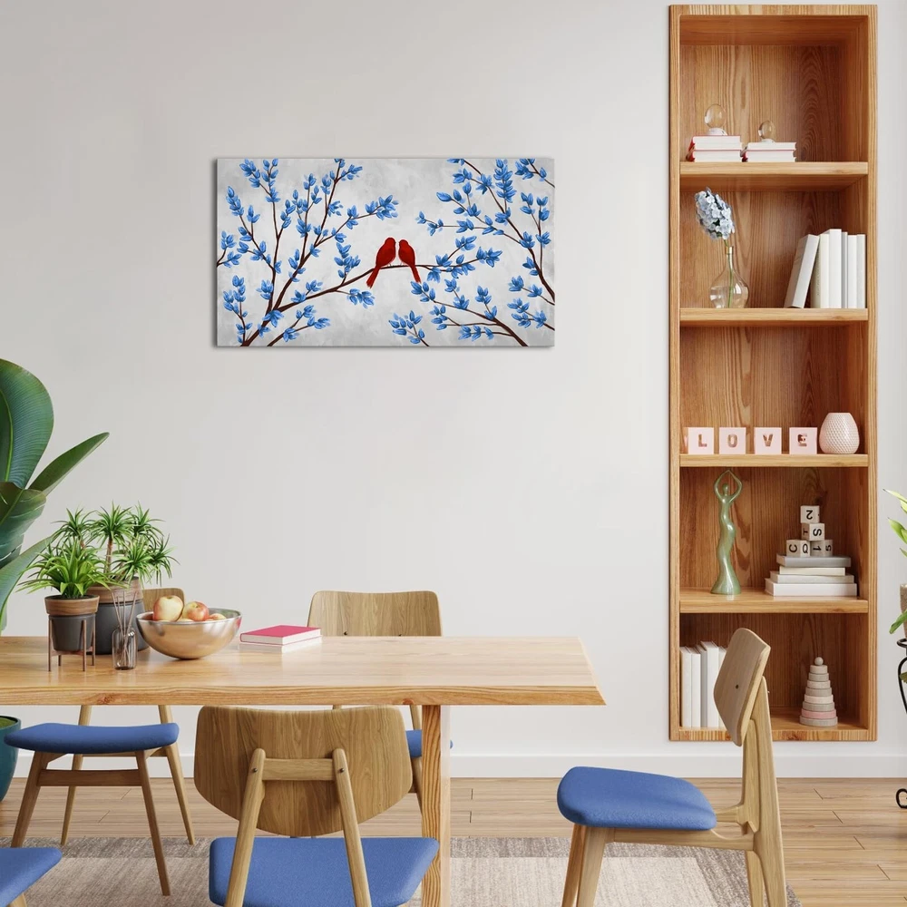 iHAPPYWALL Blue Trees Red Birds Canvas Wall Art Romantic Love Abstract Forest Landscape Picture Print on Canvas for Bedroom Home Decor Ready to Hang 20x36inch Product Details Recommended Uses For Product: wall decoration Color Family: Multi Orientation: Landscape Color: Multi Item Shape: Rectangular Pattern: Birds Subject Character: Birds Style: Abstract Theme: Bird Wall Art Form: Art Print Animal Theme: Birds Room Type: Bathroom,Bedroom,Dining Room,Kitchen,Living Room,Office Mounting Type: Wall Mount Frame Type: Wrapped Canvas Special Features: Abrasion Resistant, UV resistant UPC: 634769734861 Package Type: Standard Packaging Manufacturer: iHAPPYWALL Number of Items: 1 Age Range Description: Adult Brand Name: iHAPPYWALL Paint Type: Oil Finish Type: Matte Material: Wood Paper Finish: Watercolor Frame Material: Wood Cover Material: Wood Item Weight: 3.3 Pounds Size: 20x36inch Item Dimensions L x W: 36"L x 20"W Unit Count: 1.0 Count Size: 20x36inch (50x90cm),Wall Picture Ready To Hang HD2526 Canvas: Our Canvas Has a Built in Coating Which Makes it Moisture, UV Protected and Abrasion Resistant Frame: Gallery Wrapped on 1.2" Deep Sides With Wooden Inner Frame. Ready For Hanging Service: Custom Size And Design Is Available A Perfect Wall Decorations Gift For Living Room, Dining Room, Bedroom,Kitchen, Office, Hotel, Bathroom etc