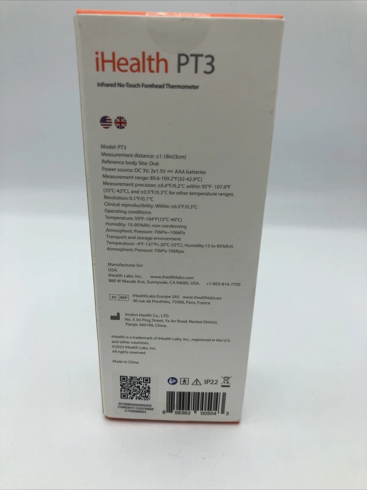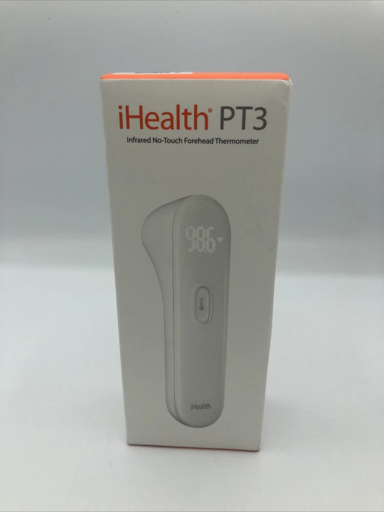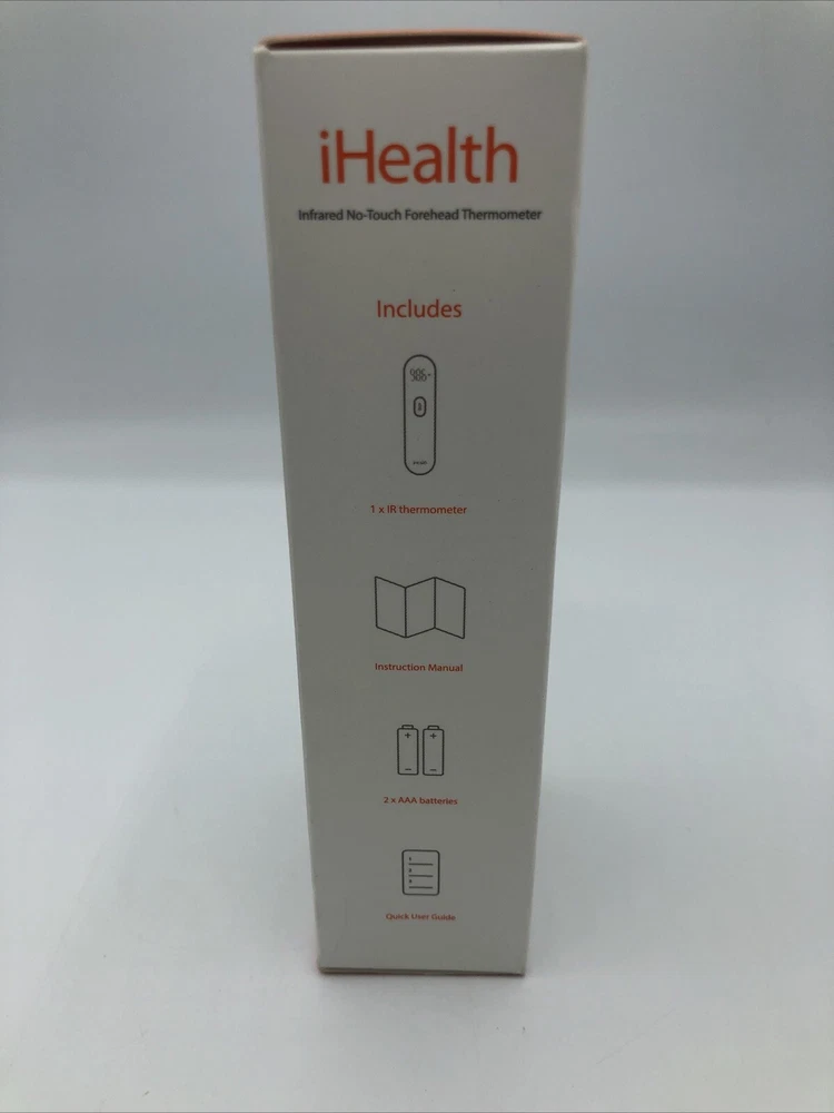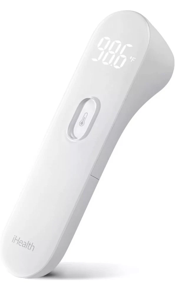 The iHealth No-Touch Forehead Thermometer is a new infrared digital thermometer that comes with 1 thermometer, 2 AAA batteries, an instruction manual, and a quick start guide. It has large, easy-to-read digits and a vibration notification when it completes. This thermometer is suitable for adults and kids and has been approved by the FDA. It measures 1.54 x 1.34 x 5.39 inches and weighs 4.59 ounces. The outer material is made of plastic and it is manufactured by iHealth in China.