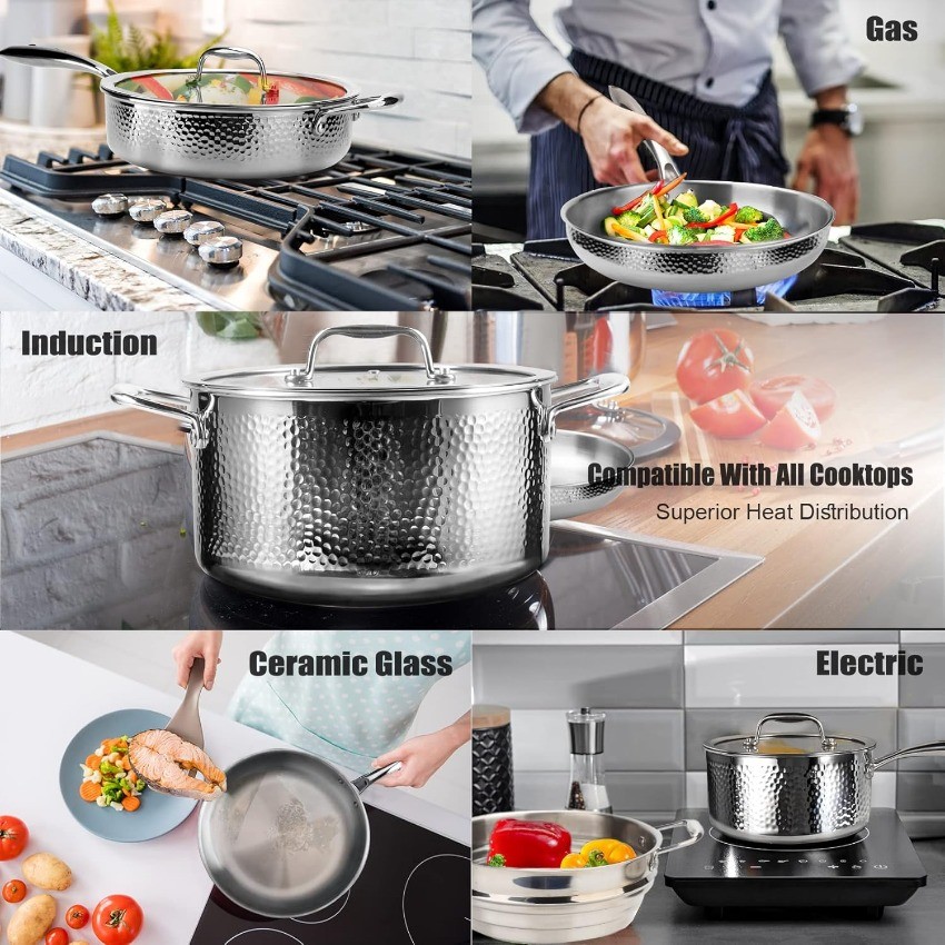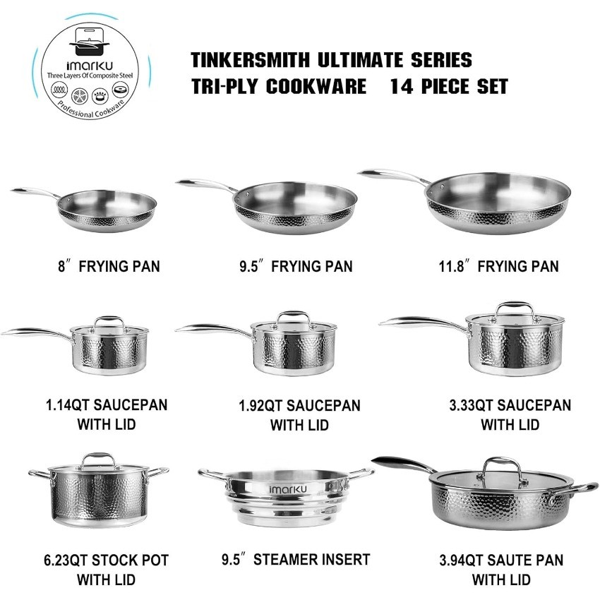 imarku Pots and Pans Set, 14PCS Kitchen Cookware Sets Tri-Ply Clad Stainless Steel with Hangered Handle and Lids, Suits Ceramic and Induction, Oven and Dishwasher Safe, Best Gifts for Women Man About this item 【Durable Body No Deform & Health Diet】 The hammered surface of the stainless steel pots and pans set adopts a triply fully clad steel design with 2.5 mm thickness, does not deform during cooking which will be used last for years. With corrosion-resistance high-quality food-grade stainless steel without coating, you don't need to worry about the coating coming off to mix with foods or altering flavors no matter frying, baking, roasting, or steaming. Zero harmful to your family's health. 【Superior Heat Distribution and Suits All Cooktops】Triple-Ply construction of the stainless steel kitchen cookware sets include a pure aluminum core for unsurpassed heat conductivity. imarku unique heat surrounds technology ensures heated quickly and evenly along the bottom and sidewalls of the pot and pan set. Almost applied to all the stovetops including induction, ceramic glass, gas, and electric. Oven safe cooking set up to 500°F. 【Effortless Cooking & Cleanup】Preheating before cooking and staying with medium-low heat cooking can help the stainless steel induction cookware to form a non-stick surface. A smooth cooking surface will make your cooking easier. The tapered design of the pot set edge is easy for drip-free pouring. imarku stainless steel cookware is not only dishwasher-safe but also hand-wash with a breeze. (Cleaning after the cookware cools down and then dry) 【Ergonomic Riveted Handle for Secure Grip】The contoured handle of the stainless steel pan set adopts a professionally riveted design to ensure a perfect balance, and a unique airflow design to stay cool and allow total control with a comfortable grip while cooking, including side handles and helper handles. Tempered glass lids with steam vent to view food, effectively control the cooking process to seal in nutrients and moisture for healthier, more flavorful results. 【14PCS Premium Cookware Sets】imarku stainless steel cookware set comes with an exquisite package, including 8/9.5/11.8-inch frying pans, 9.5-inch steamer inserts, 1.14/1.92/3.33 qt saucepans, 3.94 qt sauté pan, 6.23 qt stock cooking pot. imarku is committed to top-quality kitchen utensils with a strict quality inspection team and top warranty service. Will be an awesome idea for Valentines day gifts, Fathers day gifts, birthday gifts, Wedding gifts for couples, Housewarming gifts for new house. 1---Please feel free to contact us through eBay Message ifrou have question,such as tracking number,shipping statusct.. 2---Please DON'T GIVE NEGARTIVE or NEUTRAL REVIEW or OPEN ANY CASES before contact us through ebay inbox. 3---Sometimes we may send small gift for you,please keep it if you get some gift from us.And hope you like it. 4---To offer best service,sometimes we will update the status of your order,please check your ebay inbox time by time. Anyway,thanks so much,enjoy shopping.
