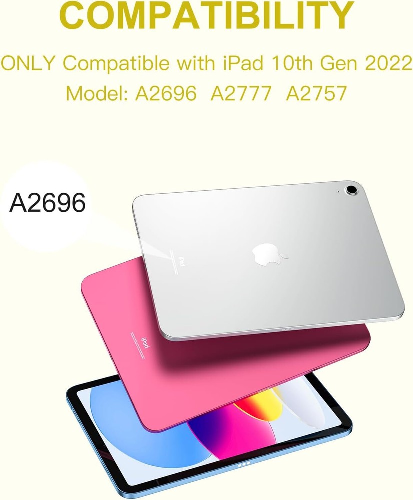 Keyboard Case Compatible for iPad 10th Generation 10.9 Inch, Folio Yellow Product Details Brand: Harvopu Color: Yellow Compatible Devices: For iPad 10th Generation 10.9 inch 2022 (Model Number:A2696/A2757/A2777) Form Factor: Case Shell Type: Soft 【Quick Navigation Trackpad】Harvopu for iPad keyboard 10th generation built-in high sensitive trackpad, allows you enjoy the convenience of performing multi-finger gesture control (like tap, swipe, scroll and switch apps), which level up your productivity when browse the web, edit documents and more 【Magnetically Detachable Keyboard】For iPad 10th gen keyboard is magnetic and it can be strongly attached to the case or detach completely. When you do not need the keyboard can be stored away, easy to carry it on the go. It is easy, fast and stable to connect via BT, reconnect immediately turning it on 【Illuminated Typing】Harvopu 10th gen case with keyboard with a full row of the laptop-like iPadOS shortcuts is customized for your tablet, and allow you easily switch between adjusble 7 RGB pure backlit with 3 levels adjustable brightness, engaging yourself in a free and relaxed typing experience in any dim condition 【Multiple Viewing Angle】There are 3 anti-slip grooves design inisde of the case provides the perfect stand angle, so you can change where the tablet is on the case and adjust the screen angle this way for drawing or writing on, do more computerig, suitable for home, office or school use 【Stain-Resistant Protective Case】The 10.9 case is made of upgarded soft PU of organosilicon hat is smooth touch and great anti-stain so that keep brilliant as new. TPU interior cover comes with honeycomb design perform well in heat dissipation and protects your tablet from shocks, scratches 【Connect the keyboard to the Tablet】Power on keyboard and open Bluetooth in tablet Settings, Keep pressing function key "Fn+ C" button (for 3 seconds), Search for "Bluetooth Keyboard" on other devices and then click Connect (Note: After pairing successfully, it will automatically connect once open the keyborad anytime.) 【Long Life Battery Rechargeable Keyboard】Built-in powerful 420mAh battery and enters energy-saving mode automatically if not in use for 15 minutes, which worry-free use and long standby time. Using a Type-C charging port of keyboard charges faster, only 2-3 hours full charge 【After-sales Service】You will get: 1 x Case for iPad 10th Generation, 1 x touchpad keyboard, 1x Type-C charging cable, 1 x user manual. (NOTE: pencil are not included.) If any questions about the model or function of our keyboard please feel free to click on the history order to contact us