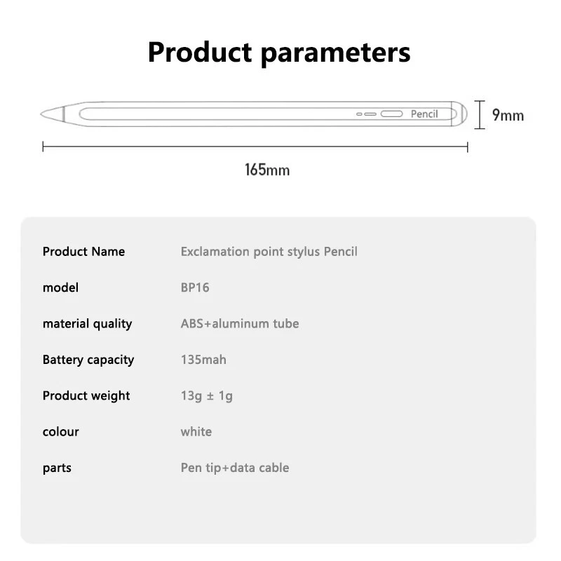 Features: The exclamation mark patented power display universal active capacitive pen is made of wear-resistant POM material, and the replaceable aluminum shell is frosted and sprayed with a better feel. Charging port: Type-c charging port with dust cap added Delay: 6 milliseconds Pen tip: pre installed special conductive pen tip, with 2 spare pen tips Material: Metal shell spray coating process, extremely soft feeling Connection: Direct use of pen tip when turning on: 1.6mm PIXELPOINT Size: 163mm long, 9.1mm diameter D-shaped pen tube, with the thinnest part only 8.3mm Weight: 70g Box gauge: 45 * 36 * 32.5CM Gross weight: 7.1KG/100pcs Charging time: approximately 1.5 hours Working time: can work for 18 hours after full power Standby time: When the battery is fully charged, it can stand by for up to 2 years Compatibility: Suitable for most capacitive screen devices System: Suitable for most capacitive screen devices Accessories: pen refill * 2, data cable * 1, instruction manual * 1 Outstanding point: Pre installed special conductive pen tip, replaceable pen tip, suitable for most capacitive screen devices