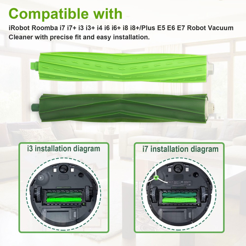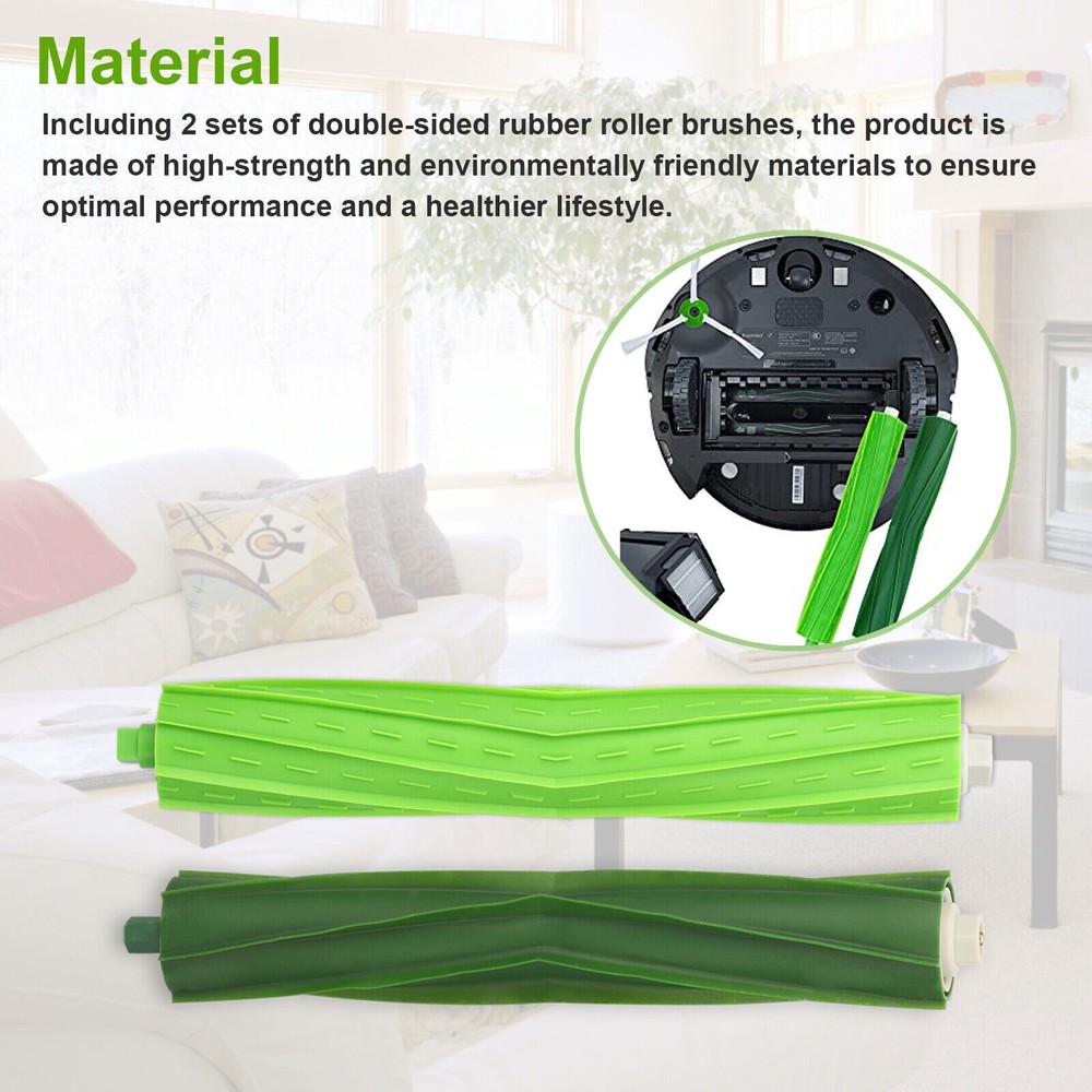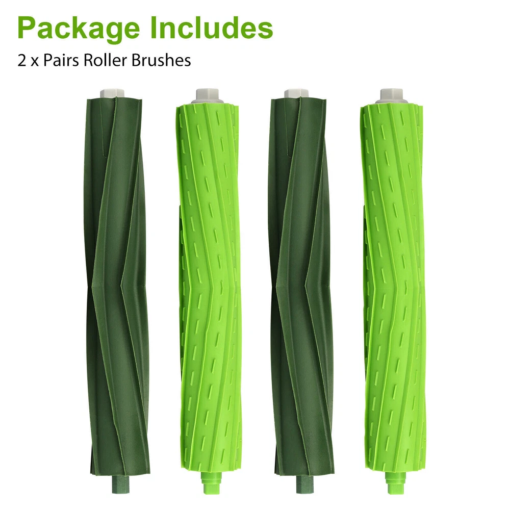 Product Feature Fits: Compatible with iRobot Roomba i7 i7+ i3 i3+ i4 i6 i6+ i8 i8+/Plus E5 E6 E7 Robot Vacuum Cleaner with precise fit and easy installation. What You Will Receive: Including 2 sets of double-sided rubber roller brushes, the product is made of high-strength and environmentally friendly materials to ensure optimal performance and a healthier lifestyle. Features: The unique double-sided rubber brush won't tangle with pet hair, and the brush can be adjusted and bent to maintain constant contact with carpets and hard floors for unbeatable cleaning performance. Easy to Clean and Replace: Regularly clean and replace the roller brush to improve suction and performance and extend the life of your robot vacuum cleaner. Color Green Material Plastic+Rubber Size 19x5.5x3cm (7.48x2.17x1.18in) Package Included 2 Pairs Roller Brushes