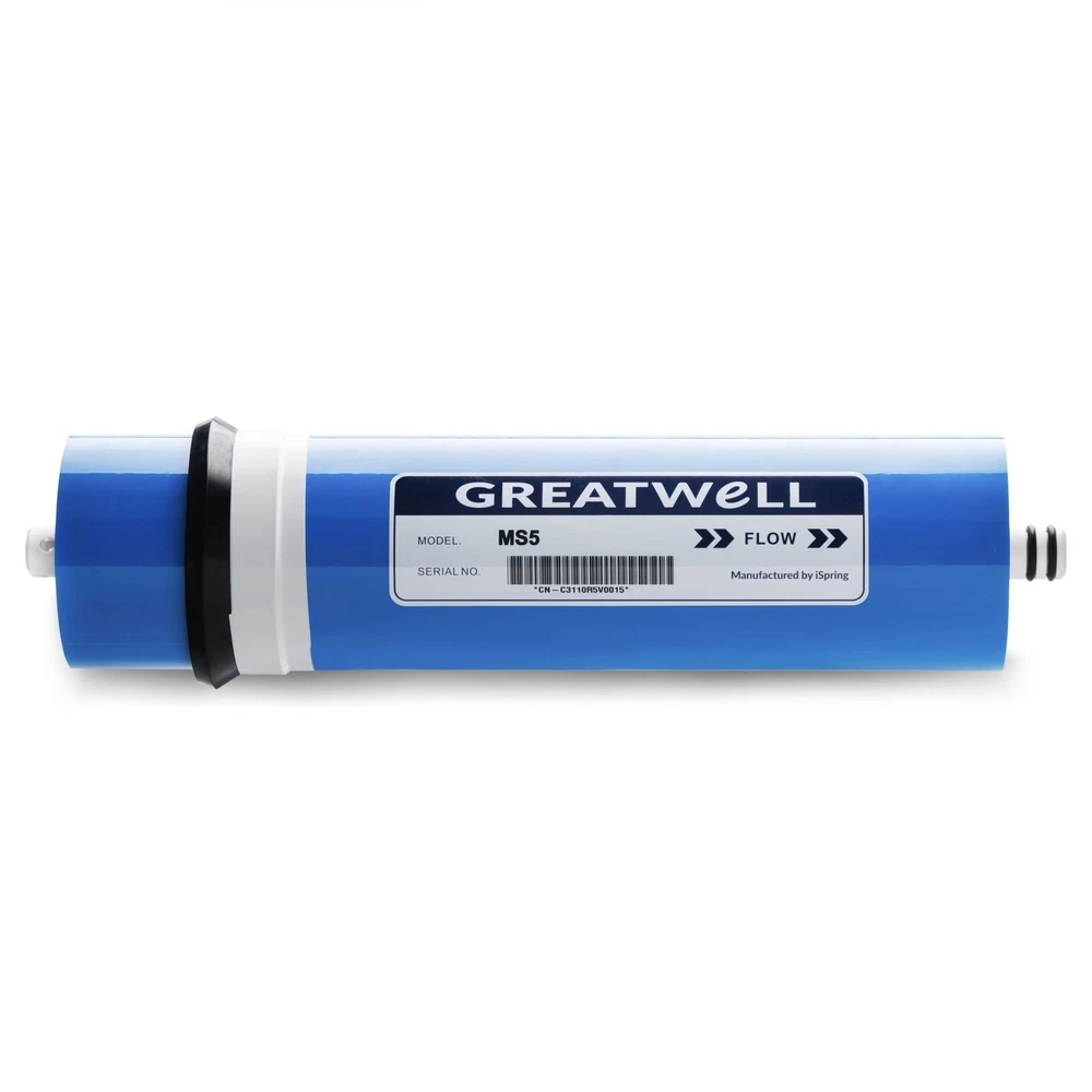 Features: Advanced 500GPD membrane saves 60% of water, with 1:1 drain to clean water ratio Low-pressure and high-capacity membrane for tankless direct ro output Fits iSpring light commercial RO system RCS5T Rejects wide spectrum of impurities down to .0001 micron Tolerance to a wide range of operating conditionsThis is the key component of the iSpring commercial reverse osmosis water purification system, usually used in the 4th stage. It has very tiny holes, which allow only water and a few gases to pass through under certain pressure thus produces virtually pure water. The technology has been used in spaceships to recycle water for astronauts. It is effective in reducing hardness, heavy metals, toxins, free chlorine, bad taste, odor THM, organics, hazardous chemicals, and pesticide. Free Shipping Over $49.99* Details iSpring 2.8"x12 500GPD RO Membrane, Fits RCS5T Product Description: Features: Advanced 500GPD membrane saves 60% of water, with 1:1 drain to clean water ratio Low-pressure and high-capacity membrane for tankless direct ro output Fits iSpring light commercial RO system RCS5T Rejects wide spectrum of impurities down to .0001 micron Tolerance to a wide range of operating conditions This is the key component of the iSpring commercial reverse osmosis water purification system, usually used in the 4th stage. It has very tiny holes, which allow only water and a few gases to pass through under certain pressure thus produces virtually pure water. The technology has been used in spaceships to recycle water for astronauts. It is effective in reducing hardness, heavy metals, toxins, free chlorine, bad taste, odor THM, organics, hazardous chemicals, and pesticide. Depending on inlet water quality or flow rate, it needs to be replaced every 24 months or 48,000 gallons of water. State-of-the-art 500GPD membrane enables full contact of water with the membranes. Increases water production by 15%, while reducing waste water by 60%, more environmental friendly with a 1:1 drain to clean water ratio. Why iSpring located in Alpharetta, Georgia for over a decade, iSpring water systems LLC is a family owned company specializing in reverse osmosis water filtration systems. Our products include residential and commercial reverse osmosis (ro) systems, whole house water systems, Ultrafiltration systems, shower, faucet, and counter top filters, filter cartridges and housings, ro coolers, and kitchen faucets and fittings. Our aim is to make high quality drinking water accessible for all households. With affordable pricing, solid quality, Prompt delivery, and top notch customer service, we hope to assist in bringing you great water for years to come.