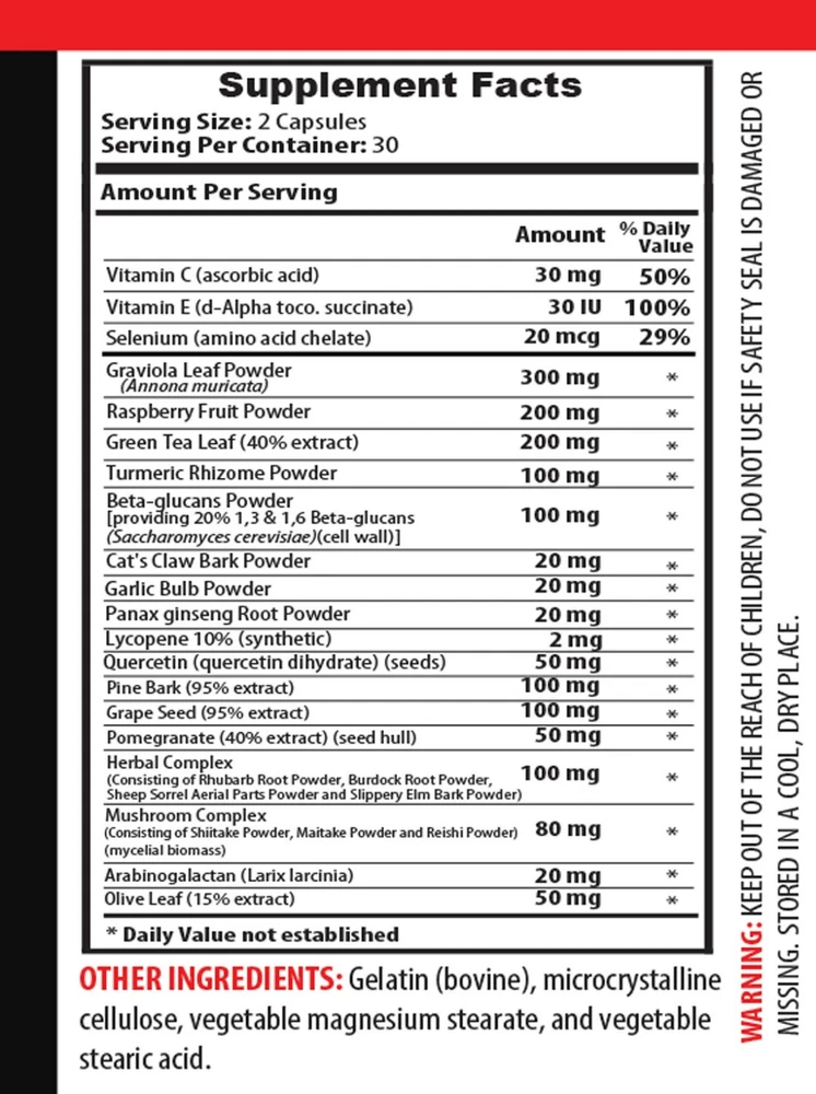 immune system vitamins - IMMUNE SUPPORT COMPLEX - herbal immune support 1B IMMUNE SUPPORT COMPLEX Natural Herbs, Vitamins & Minerals Powerful Antioxidants Brain Health Immune Health Eye Health Weight Loss Benefits Anti Inflammatory Joint Pain Relief Heart Health And More! 1 BOTTLE - 60 Capsules IMMUNE SUPPORT COMPLEX: The immune system is responsible for keeping you well, and it’s always working to make sure there are no foreign substances, or responds to neutralize them as needed. Immune health is crucial in preserving a state of wellness and supplementing with our natural product is a plus to your health. GRAVIOLA BOOSTS ENERGY LEVELS: Graviola (Annona muricata), also known as Soursop, is a small evergreen tree with many bioactive compounds. Not only does Graviola contain a bounty of vitamins and minerals, but the stem, bark and leaves are rich in antioxidants, which help the body fight against free radical damage to cells. RASPBERRY FRUIT POWDER HAS ANTIOXIDANT: Raspberries are the edible fruit of a plant species in the rose family. Raspberries boast many nutrients despite being low in calories. They have many vitamins and nutrients that are essential for your immune health and more. Raspberries are powderful antioxidants that can help you. VITAMIN E DESTROYS FREE RADICAL DAMAGE: Vitamin E is an important antioxidant in grape seed, but even more powerful are the flavonoids called oligomeric proanthocyanidin complexes, according to the UMMC. Antioxidants destroy free radicals, which are waste products that develop from the conversion of food to energy and also occur in response to environmental toxins. STRENGTHEN YOUR IMMUNE SYSTEM: Your first line of defense is to choose a healthy lifestyle. Following general good-health guidelines is the single best step you can take toward naturally keeping your immune system strong and healthy. But you can also take natural supplements like ours that supports your immune system to the Max and provides extra benefits at the same time. GREEN TEA FOR HEART HEALTH AND MORE!: According to dozens of studies, regularly using green tea may reduce your risk of developing heart problems, help you maintain better bone mineral density, ward off eye problems and much more. Green tea also helps to maintain brain health and improve it in adults or elderly people. TURMERIC CURCUMIN TO STOP FREE RADICAL DAMAGE: Oxidative damage is believed to be one of the mechanisms behind aging and many health problems. It involves free radicals, highly reactive molecules. The main reason antioxidants are so beneficial is that they protect your body from free radicals. Turmeric Curcumin is a potent antioxidant that can neutralize free radicals due to its structure. PINE BARK FOR YOUR IMMUNE HEALTH: Today, we know that pine bark is a good source of vitamin C as well as natural plant compounds that support better health. Pine bark is very healthy for you because it boosts antioxidant levels, balances blood sugars, boosts brain function and fights off common colds. This is perfect for your immune system. CAUTION: Do not exceed recommended dose. Pregnant or nursing mothers, children under the age of 18, and individuals with a known medical condition should consult a physician before using this or any dietary supplement. These statements have not been evaluated by the Food and Drug Administration. This product is not intended to diagnose, treat, cure, or prevent any disease. PREMIUM FORMULA SUPPLEMENT