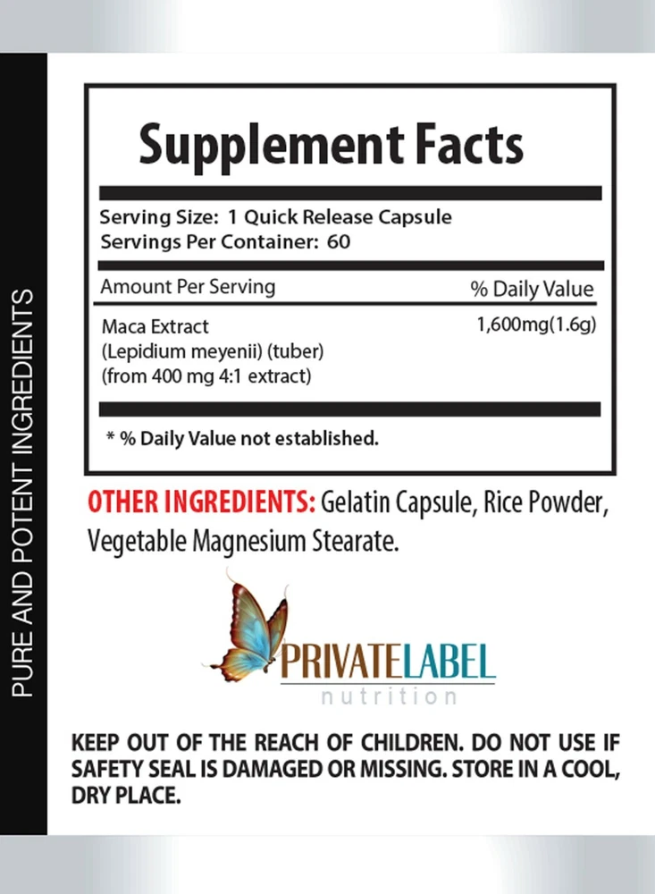 PREMIUM MACA Formula 1600 MG With Catuaba - Muira Puama - Tribulus 3 Bottle, 180 Capsules Made in USA To boost your energy To gain muscle faster To improve your balance To increase health condition both in men and women To speed up bone fracture healing and improve bone protection To improve your memory and learning capabilities How is Maca great for you health? Maca is traditionally used as a medicinal herb and energizing food. Maca is recognized as a nutritional powerhouse by scientists and botanists. A single root of Peruvian Maca contains almost 60 types of nutrients including vitamins, minerals, amino acids. Maca has become quite popular in the last decade. Although Maca is unrelated to the ginseng family, it is also referred to as the “Peruvian ginseng”. May increase stamina and energy support, and overall health. Maca plays an important role in maintaining adrenal health which further impacts your energy and mood positively. Few scientific studies have examined the effectiveness of Maca. Here's a look at several findings from the available research. Maca Root For General Health Maca root improves the overall health in many ways. It provides iron to the body and restores the red blood cells which help guard against cardiovascular diseases and anemia. It also keeps the teeth and bones healthy and helps in the quick healing of wounds. You will notice an increase in muscle mass if you use Maca extracts in combination with a good workout. Maca is a Super-food Maca Root is a nutritional powerhouse, providing key macro and micronutrients, and unique plant compounds to support an active human body. Maca is an excellent source of vitamins and minerals. It contains all eight essential amino acids. Maca makes your bones stronger and prevents the risk of bone-related ailments. Making Maca a part of your daily diet is simple with these delicious Maca Powder recipes! It May Boost Sports Performance and Energy Maca root powder is a popular supplement among bodybuilders and athletes. It has been claimed to help you gain muscle, increase strength, boost energy and improve exercise performance. Also, studies indicate that it enhances endurance performance. Supplementing with Maca may improve exercise performance, particularly during endurance events. Maca has been shown to provide sustained energy throughout the day without the jittery crash of caffeine. It can help you feel more awake and energized so you're able to appreciate each moment and focus on the things that matter. Maca makes your bones stronger and prevents the risk of bone-related ailments. It May Improve Learning and Memory Maca may improve brain function. In fact, it has traditionally been used by natives in Peru to improve children's performance in school. Maca has improved learning and memory in rodents that have memory impairment. In this regard, Maca appears to be more effective than other varieties. By maintaining positive energy levels throughout the day, Maca may also help improve mood. Supplement Facts Serving Size: 2 Capsules Servings Per Container: 60 Amount Per Serving % Daily Value Maca Extract 1,600mg(1.6g) (Lepidium meyenii) (tuber) (from 400 mg 4:1 extract) * % Daily Value not established. OTHER INGREDIENTS : Gelatin Capsule, Rice Powder, Vegetable Magnesium Stearate. SUGGESTION USE : For adults, take one (1) quick release capsules three times daily, preferably with meals. WARNING: If you are pregnant, nursing, taking any medications or planning any medical procedure, consult your doctor before use. Discontinue use and consult your doctor if any adverse reactions occur. Not intended for use by persons under the age of 18. Keep out of reach of children. Store in a cool, dry place. improve your bone protection - PREMIUM MACA BLEND 1600mg - male energy 3 Bottles *These statements have not been evaluated by the Food and Drug Administration. GREAT QUALITY PRODUCT