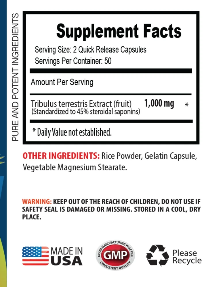 Tribulus Terrestris Extract 1000mg Increase Energy, Libido, Endurance & Recovery Male Sexual Health and Extra Strength Natural Testosterone Booster 1000mg Male Enhancer Pills Muscle Strength 2 Bottles - 200 Tablets Made in the USA Free Shipping! ABOUT TRIBULUS HEALTH SOLUTION PRIME's Tribulus Terrestris is a unquie supplement for its libido enhancing properties and testosterone boosting properties. On the sexual side of things, tribulus is a relatively reliable and potent libido enhancer. After assesing Trubulus Terrestris in a human study, it has increased sexual well being and erectile function in men. It is known to enhance androgen receptor density in the brain, which may enhance the libido enhancing properties of androgens. Tribulus terrestris is a fruit-producing Mediterranean plant that's covered with spines. It is also called puncture vine and is a herb from Ayurveda that is mostly recommended for male health including virility and vitality, and specifically more catered towards cardiovascular and urogenital health. Tribulus Terrestris is a low-growing flowering plant with small yellow flowers. Although native to the Old World, it has become naturalized throughout the rest of the world in warm climates, and can thrive in deserts and other poor growing conditions. It grows as an annual in colder climates. It gets its most commonly used name (Puncture Vine) from the caltrop-like seeds, which, when mature, are capable of puncturing feet, hooves, and even bicycle tires. It has many other common names besides puncture vine. It is extremely resistant to most of the techniques commonly used to control invasive plants, partly because the seeds maintain their viability for many years. TRIBULUS TERRESTRIS HISTORY Tribulus terrestris has a long history of use. It has been suggested that it was used in ancient Greece and India for physical rejuvenation. In China, it was used as a component of therapy for conditions affecting the liver, kidney, and the cardiovascular and immune systems. It has also been used in Eastern European folk medicine for increased muscle strength and sexual potency. As a dietary supplement, Tribulus Terrestris may increase levels of testosterone and to increase sex drive and performance. Historically, it has been used for a wide variety of conditions, but today it is mainly used by athletes to increase strength and muscle mass, as well as for sexual enhancement in both men and women. A study in Bulgaria in the 1970's reported that it may have encouraged androgen production and reception. Some attribute the Olympic success of the Bulgarian weight-lifting team to the use of this herb. It continues to be used for the increase of testosterone levels, as well as sexual and athletic performance. It is believed to increase sperm production in men and egg production in women. BENEFITS OF TRIBULUS TERRESTRIS Tribulus May Elevate Testosterone When a Tribulus extract was given to eight apparently healthy men and eight healthy women, ages 28-45, in a dose of 250 mg three times per day for five days, the results were emphatic: Testosterone levels increased. Estradiol levels increased by about 150%. In the women, the estradiol levels increased less than in males, but the difference was still significant. Luteinizing cells increased substantially in both men and women. Follicle-stimulats increased substantially in women. This study emphasized the impact of Tribulus on some parts of the human body, particularly those that are most responsible for masculinity and femininity in the respective sexes. It should be stressed that the levels of the secretions studied did not appear to go beyond the physiological frames, i.e., did not disturb the normal mechanisms of regulation. Moreover, in men with serum testosterone levels below the lower limit of the norm, the physiological levels were reached after the tests, whereas in men with normal initial levels, the testosterone level was not significantly changed. May Increase Sperm Count and Activity The prosexual activity of Tribulus is not confined to sperm gymnastics, it's been shown to increase production as well as boosted tenacity and viability. Tribulus may increase libido, the desire for sex. In a study, its ability to act as a sexual booster was apparent through accelerated and emphasized sexual activity: its tendency to increase testosterone levels stimulated sexual development. Tribulus has also been found to help with semen production. Tribulus May Restore Vigor, Vitality, And Stamina Traditionally, tribulus may produce physical, mental, or emotional vigor. Tribulus has a reputation that has been verified in the lab by increased endurance, in some tests. In humans, Tribulus has been shown to be a general stimulator, enhancing activity across a wide spectrum. In addition to improving motor activity and muscle tone, it may help restore vigor, vitality, and stamina. It may also intensify protein synthesis, particularly in the liver, kidney, and heart tissue, while enhancing energy metabolism. The best explanation of the effects of Tribulus is that it may regulate the secretion of cortisol, produced by the adrenal cortex. HOW TRIBULUS WORKS The best explanation of the effects of Tribulus is that its steroidal properties may enable it to regulate the secretion of antistress hormones such as cortisol, produced by the adrenal cortex. Researchers have identified naturally occurring compounds in Tribulus terrestris. These furostanol saponins stimulate testosterone production by suppressing natural hormone receptors. This results in the production of greater amounts of luteinizing hormone (LH) which in turn encourages the body, specifically the Leydig cells in the testes, to create more testosterone. A recent study found Tribulus Terrestris contributed to an increase in testosterone levels in men suffering from low testosterone. Another study demonstrated superior results in the rejuvenation of sperm count. Researchers have discovered Tribulus