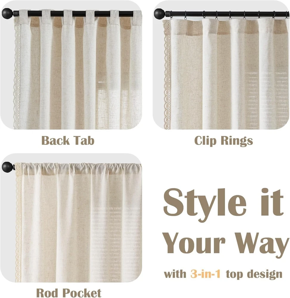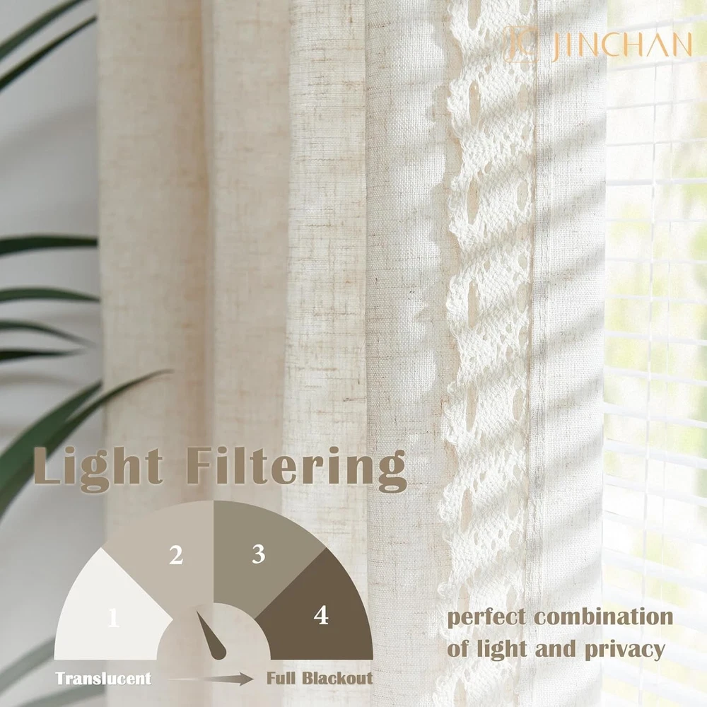 jinchan Linen Blend Beige Curtains 108 Inch Length 2 Panels Curtains with Lace Trim for Living Room Extra Long Rustic Farmhouse Curtains Rod Pocket Light Filtering Curtains Bedroom Window Curtain Set Lace Trim Curtains: Add some rustic romance to your home with JINCHAN linen beige curtains. Package includes 2 panels in 50 inch wide by 108 inch long each, 100 by 108 combined. Flax fabric with delicate lace crochet trim, these drapes dress up your home with a vintage farmhouse style. Beauty Meets Simplicity: Made of lightweight linen fabric in neutral color palette, these semi sheer curtains create a perfect balance between softness and substance in a simple way. They provide enough privacy from outsiders while inviting natural light in and keeping the room bright. Dual Hanging Options: Rod pocket top allows for a modern touch while back tabs add an elegant flair. The 3-in-1 construction makes the farmhouse curtains easy to slide through a curtain rod up to 1 1/2 inch inch diameter. You can pair them with blinds or sheers for extra opacity and privacy. Style It Your Way: Featured lace crochet edges, these drapes create dimensional highs and lows for added depth, which is perfect for rustic, shabby chic and boho home. They can be installed in the living room, bedroom, dining room, kitchen, office, patio door, and sunroom for daily use. Easy Maintenance: These shabby chic curtains can withstand tear and wear thanks to the durable linen material. They are also easy to care. Machine washable in cold water with no bleach. Wash with similar colors. Tumble dry in low heat. The creases can be removed by ironing and steaming.