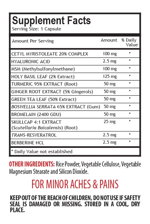 PAIN RELIEF ULTRA COMPLEX 610MG HERBS FOR PAIN RELIEF Reduce Inflammation & Joint Pain Help Maintain Healthy Cells Neutralize Damaging Free Radicals Help Maintain Healthy Pain-Free Joints Reducing Inflammation 3 Bottles, 180 Capsules Made In USA PAIN RELIEF ULTRA COMPLEX SUPPORTS THE SYSTEM FROM ACHES AND PAINS: Pain Relief is a supplement that supports the system from aches and pains. The natural ingredients included in this supplement are: cetyl myriostoleate, msm, holy basil, turmeric, ginger root, green tea leaf, boswellia serrata and more! TURMERIC MAY HELP YOU WITH ITS ANTIOXIDIZING: Turmeric may help you with its antioxidizing properties and anti inflammatory properties while also boosting your mood. Also, due to the effects of this supplement you may experience less pain while feeling more positivity and peace of mind. TURMERIC CAN BOOST YOUR CARDIOVASCULAR HEALTH: There are a few different angles by which turmeric can boost your cardiovascular health – curcumin, is the active component of turmeric. Curcumin directly balances your cholesterol levels by eliminating excess LDL (“bad cholesterol”) from the blood flows. This can help stop heart conditions and improve blood flow. SKULLCAP AND TURMERIC BOTH ARE GOOD MANAGERS OF BRAIN HEALTH: Skullcap and Turmeric both are good managers of brain health. Since skullcap supports the central nervous system and turmeric lowers inflammation they create a nice environment for your brain to work in. You may experience clearer thinking and maybe even improvement in memory. PAIN RELIEF SUPPORT JOINT HEALTH AND DECREASE OVERALL INFLAMMATION: The ingredient in this supplement such as cetyl myristoleate, MSM, hyaluronic acid and turmeric are all factors that support joint health and decrease overall inflammation of those areas. Pain is usually a systemic inflammatory response to aid in healing. However, too much inflammation is never good for the health of those local areas of the human system. These agents are natural and may be beneficial to ease inflammation and discomfort of the joints. HYALURONIC MAKE SKIN TEXTURE IS SMOOTHER: Many people report that their skin feels “dewier,” the bags under their eyes become lighter and their skin texture is smoother after taken containing hyaluronic acid. The primary way in which HA helps improve appearance of “chronoaged skin” (skin aged due to sun exposure) is by reducing water loss. In fact, one reason that the skin looks more youthful and less sun-damaged is because the skin’s HA concentration increases. This supplement contains hyaluronic acid that may help if ingested as well. PAIN RELIEF ULTRA COMPLEX HELP YOU FOCUS: This supplement may help you focus on your day better and not worry about any pains or aches that may dwell within. Many of the ingredients provided in this supplement are natural anti-inflammatory compounds that support your systems from free radical stresses that may be caused by inflammation. Because of this support throughout you inside, you may experience little or no pain after supplementation. CURCUMIN HAVE ABILITY TO CONTROL INFLAMMATION: Arguably, the most powerful aspect of curcumin is its ability to control inflammation. A famous jouranl published the results of a study that evaluated several anti-inflammatory compounds and found that curcumin is among the most effective anti-inflammatory compounds in the world. Inflammation puts people at risk for almost every health condition known to man. joint pain relief supplements - PAIN RELIEF MEGA FORMULA 610MG 3B - best antioxidant SUPPLEMENT FACTS: Cetyl Myristoleate 20% Complex 100 Mg Hyaluronic Acid 2.5 Mg MSM (Methylsulfonylmethane) 100 Mg Holy Basil Leaf (2% Extract) 125 Mg Turmeric 95% Extract (Root) 50 Mg Ginger Root Extract (5% Gingerols) 50 Mg Green Tea Leaf (50% Extract) 50 Mg Boswellia Serra Ta 65% Extract (Gum) 50 Mg Bromelain (2400 Gdu) 50 Mg Skullcap 4:1 Extract (Scutellaria Baicalen Sis ) (Root) 25 Mg Tran S-Resveratrol 2.5 Mg Berberine Hcl 2.5 Mg OTHER INGREDIENTS: Rice Powder, Vegetable Cellulose, Vegetable Magnesium Stearate and Silicon Dioxide. SUGGESTED USE: 1 capsule taken 1 to 2 times daily preferably with meals or as directed by a health care professional. SERVING SIZE: 1 Capsule, Amount Per Serving 60 CAUTION: Do not exceed recommended dose. Pregnant or nursing mothers, children under 18, and individuals with a known medical condition should consult a physician before using this or any dietary supplement. This product is manufactured and packaged in a facility which may also process milk, soy, wheat, egg, peanuts, tree nuts, fish and crustacean shellfish. KEEP OUT OF THE REACH OF CHILDREN, DO NOT USE IF SAFETY SEAL IS DAMAGED OR MISSING. STORED IN A COOL, DRY PLACE. * PREMIUM QUALITY PRODUCT